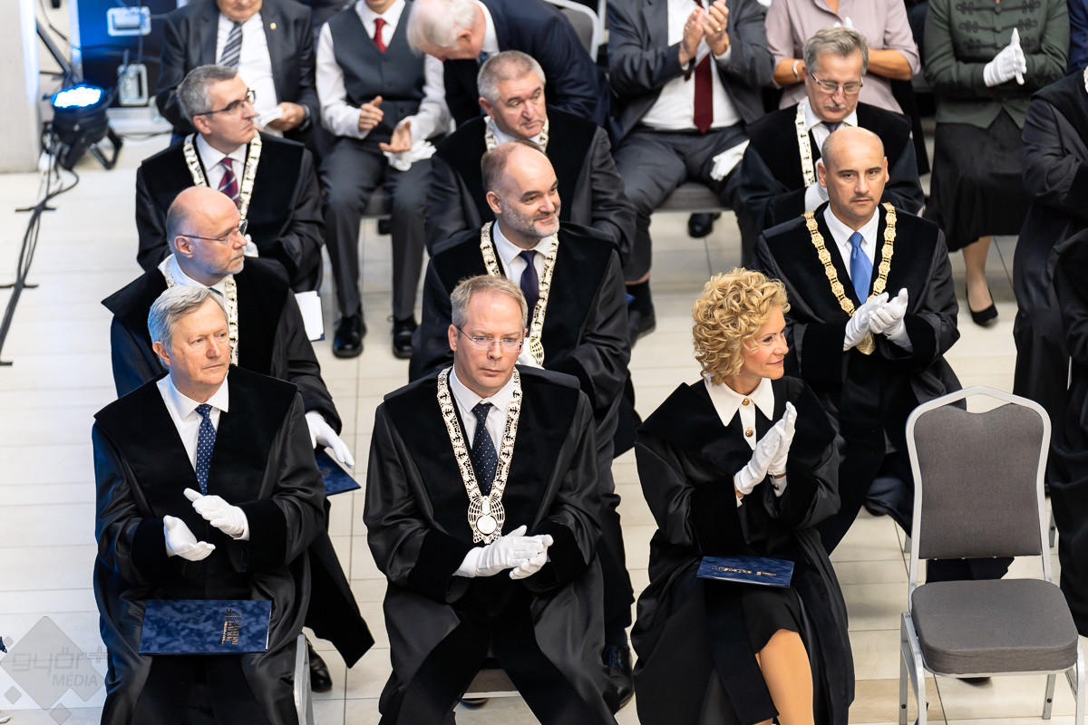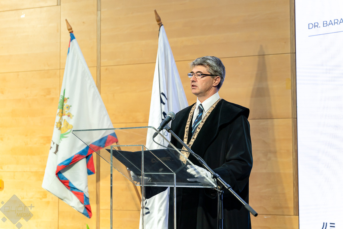 „Universitasként legfőbb hivatásunk, hogy a következő nemzedékek felkészítésében vegyünk részt” – fogalmazott az ünnepi szenátusi ülést megnyitó köszöntőjében dr. Baranyi Péter Zoltán rektor. Hangsúlyozta: a fiatal szakembereket a jelen és a jövő kihívásaira egyaránt késszé kell tenni. Beszédében köszönetet mondott az oktató-kutató munkatársaknak, mondván, „ők adják át a jelen tudását és a gondolkodás képességét”.