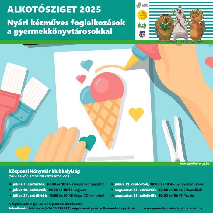 A győri központi könyvtár klubhelyiségében (9023 Győr, Herman Ottó utca 22.) nyáron több alkalommal is kézműves foglalkozásokat várják a gyerekeket.