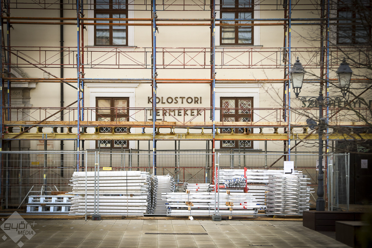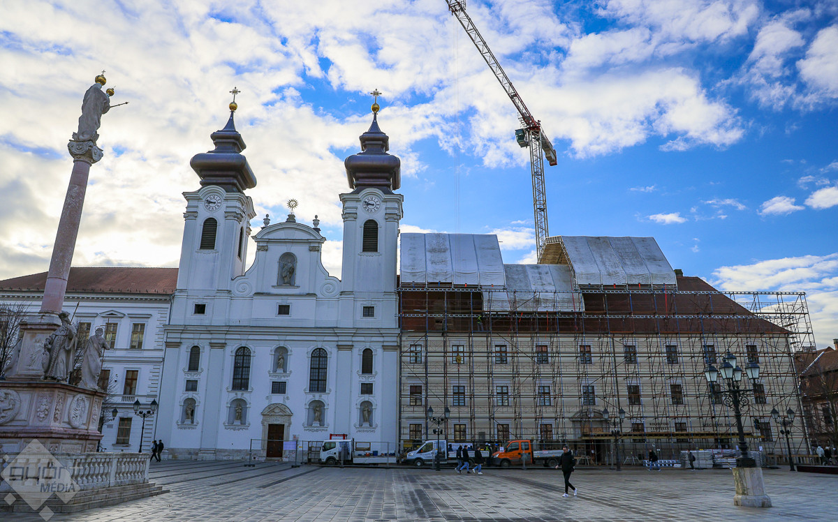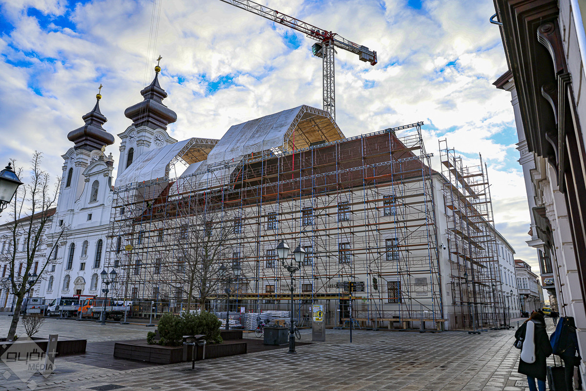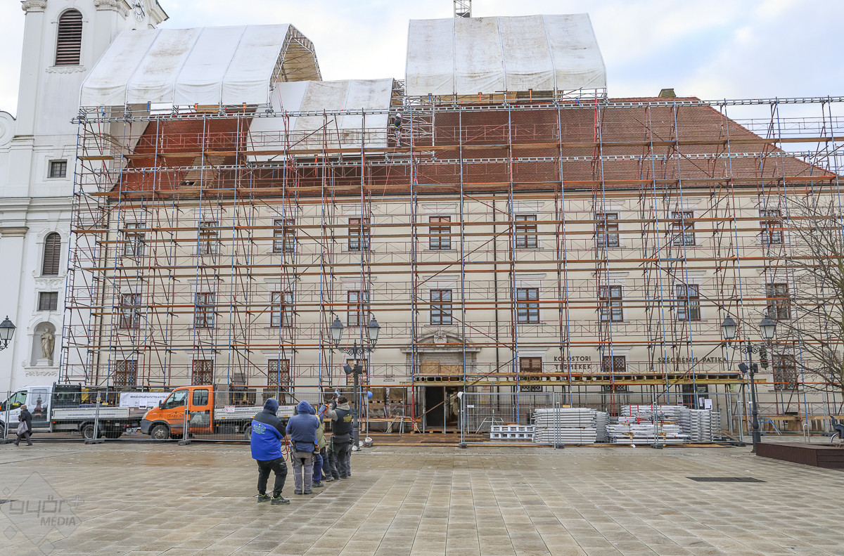 Látványos munkálatok folynak a Széchenyi téren, a bencés rendház és iskolaközpont megújítása kapcsán. A novemberben kezdődött felújítás során beépítik a rendház tetőterét és megtörténik az épületek tetőcseréje is.