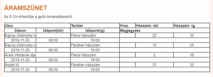 November 25-én több utcában kell áramszünetre számítani, az E.On információi szerint.