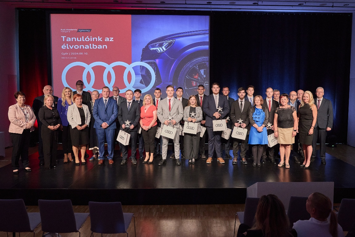 Az Audi Hungaria idén is kitüntette a duális szakképzésében végzett legjobb tanulóit, akiknek Szigeti Éva, az Audi Akademie Hungaria vezetője és Benke Csaba, az elektromos járműhajtások termékszegmens vezetője adta át az elismerő okleveleket.