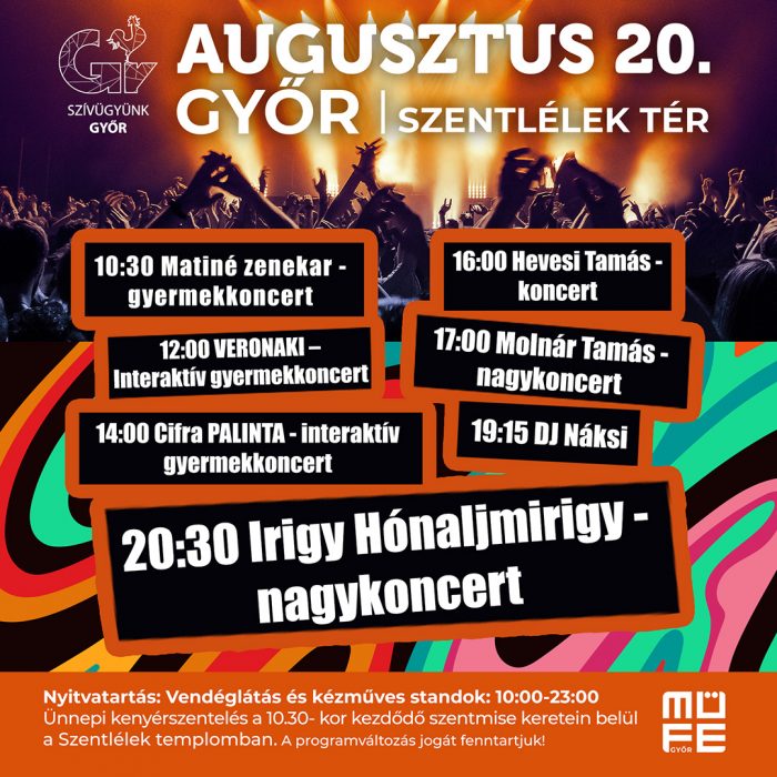 Egy nap szünet után pedig a hét második felében a további győri programok augusztus 22-étől a Győri Bornapokkal és végül a szombati nyárzáró Majka koncerttel folytatódnak egészen augusztus 24-e estéig!