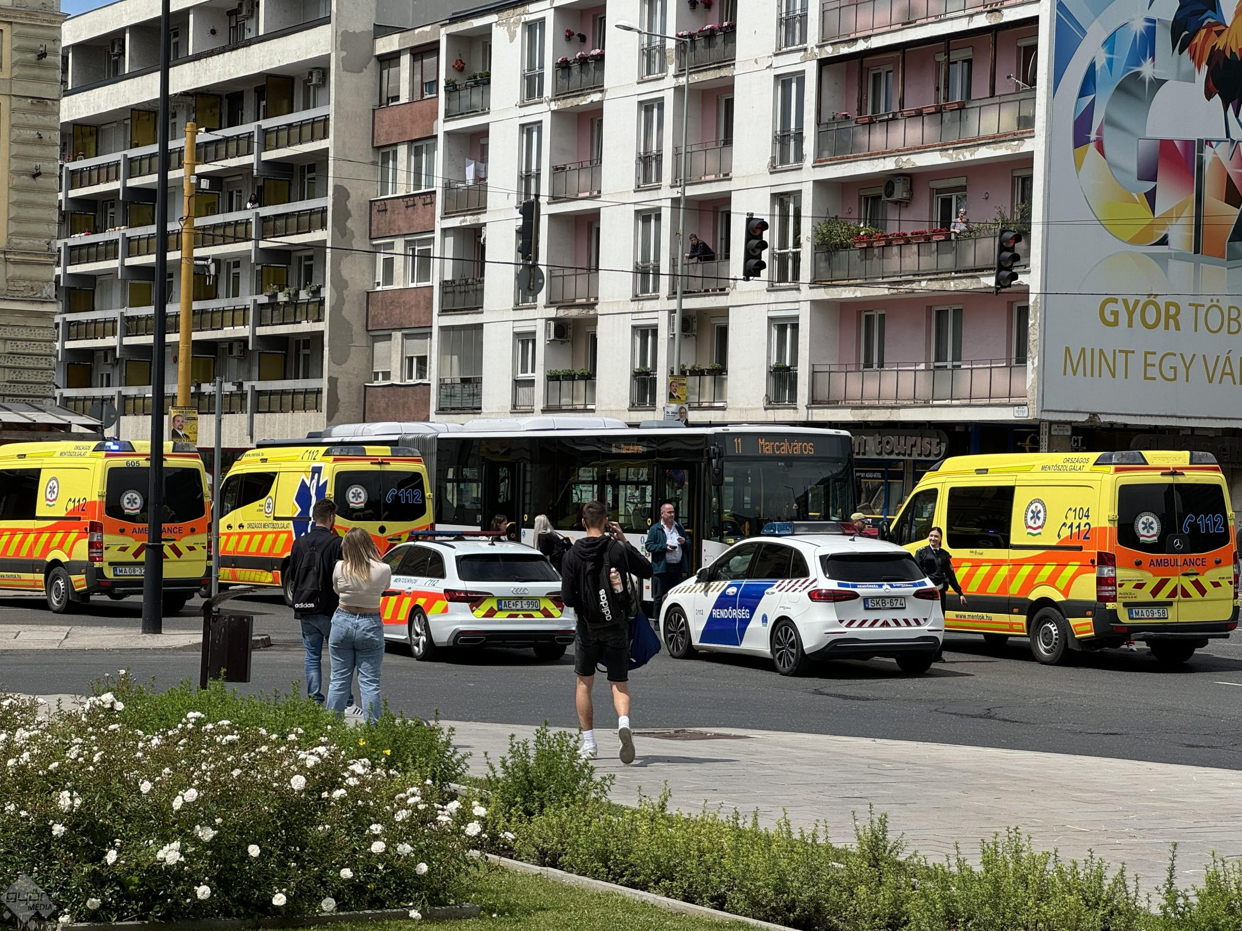 Személygépkocsi és autóbusz ütközött Győrben, a Szent István út városháza előtti szakaszán. A helyszínre mentők is érkeztek, értesüléseink szerint egy embert hordágyon hoztak le a buszról.