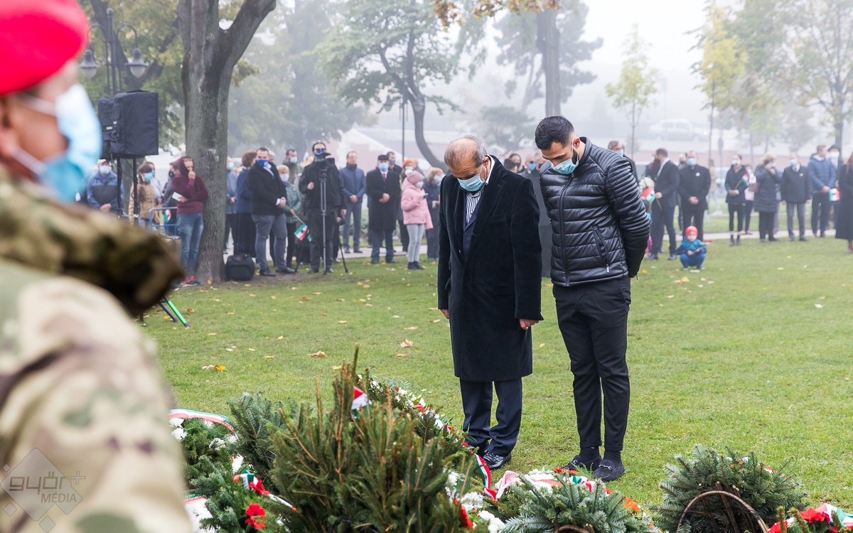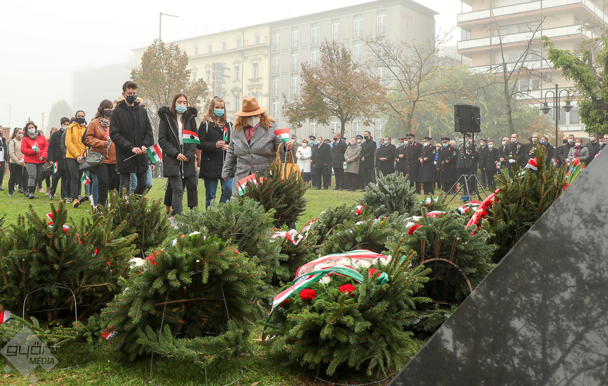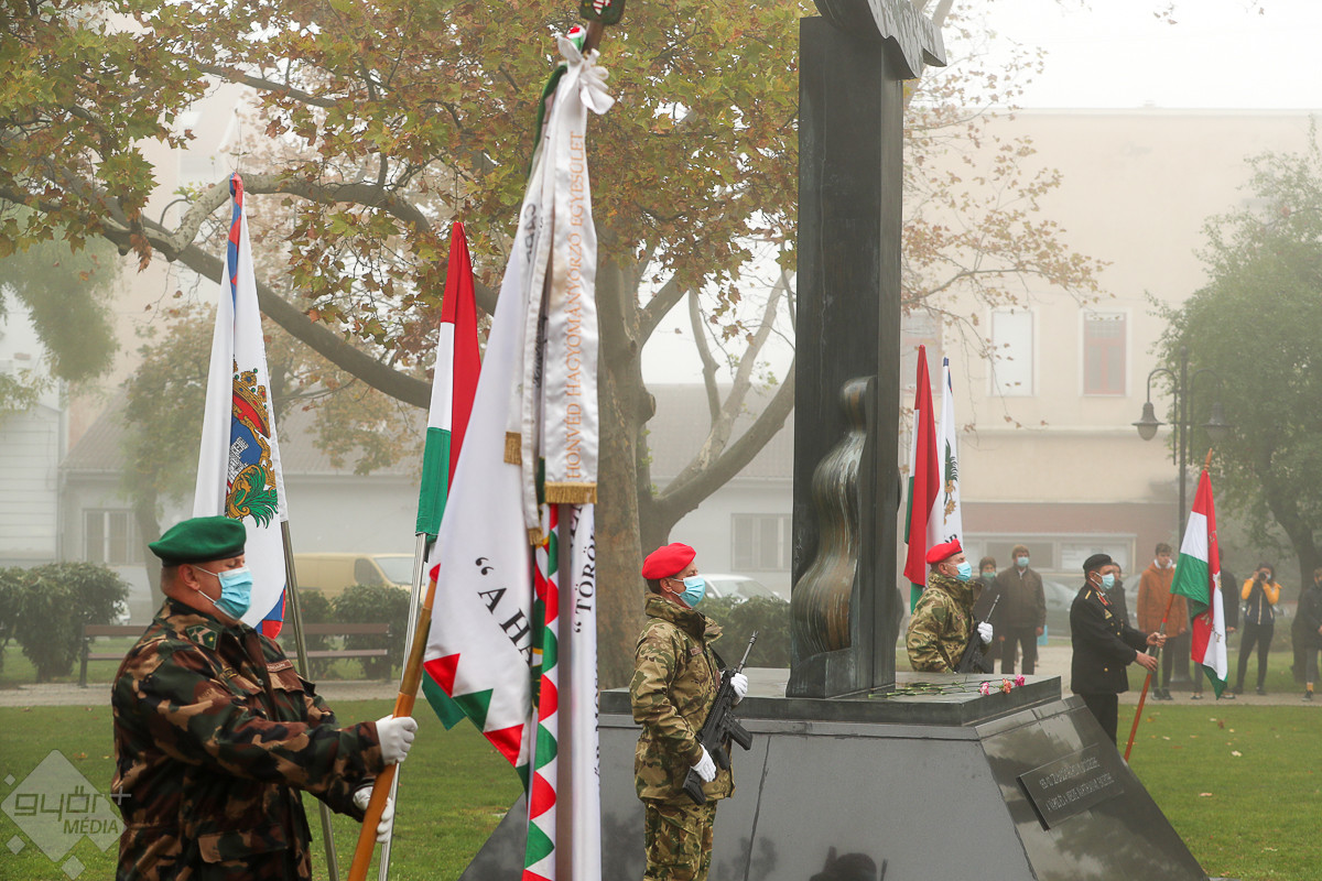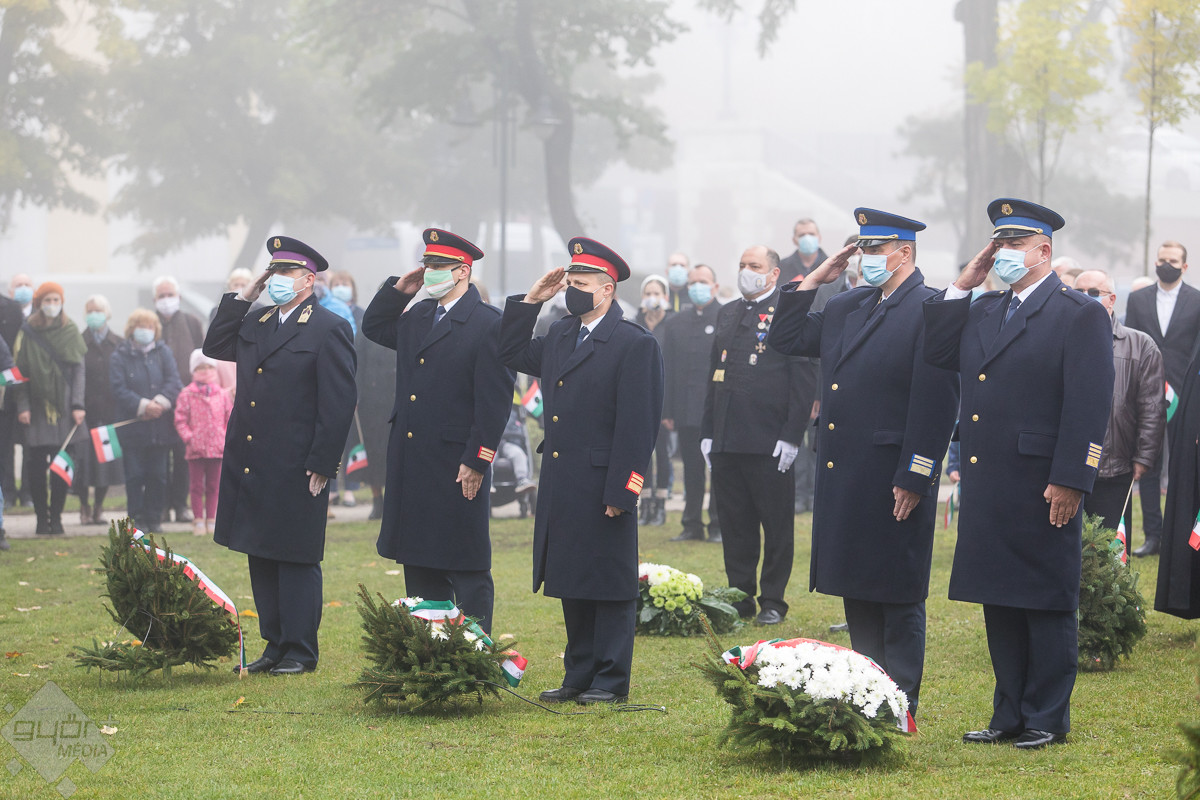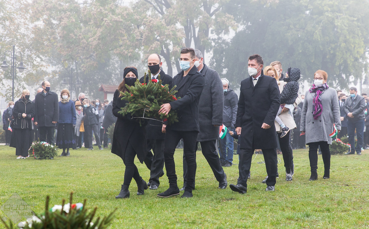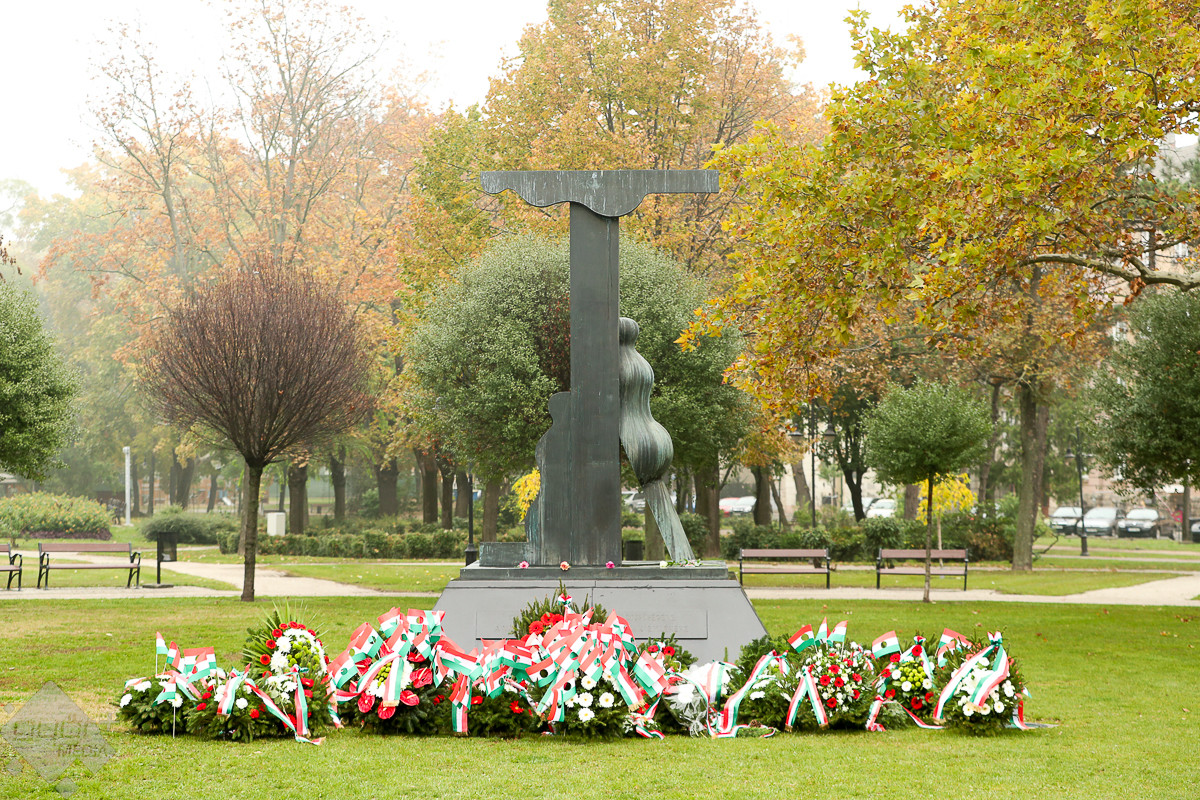 „Az ember és a nemzet természetes létállapota a szabadság. Ezt a szabadságot átmenetileg korlátozhatják az ordas eszmék szolgálatába álló zsarnoki hatalmak. Meggyalázhatják a nemzet múltját, átírhatják történelmét, polgáraiba belefojthatják a szót, börtönbe zárhatják őket, akár az életüket is elvehetik tőlük. De a történelmi példák mind azt mutatják: a szabadságvágy utat tör magának, elsodor minden hamis eszmét, s ha van hozzá nemzeti erő, akarat, összefogás, akkor, ha áldozatok árán is, de a nemzet fönnmarad, polgárai pedig visszaveszik szabadságukat.” – mondta emlékező beszédében Dr. Dézsi Csaba András polgármester. Hozzátette, büszkék lehetünk a saját hőseinkre, akik meghatározó történelmi egyéniségei lettek a forradalomnak. Felidézte Szigethy Attila, Földes Gábor, Tihanyi Árpád, Török István alakját, a forradalomban betöltött történelmi jelentőségű szerepüket, és az áldozatot, amelyet a nemzetért hoztak.