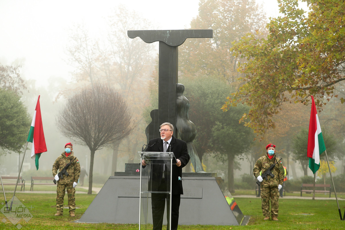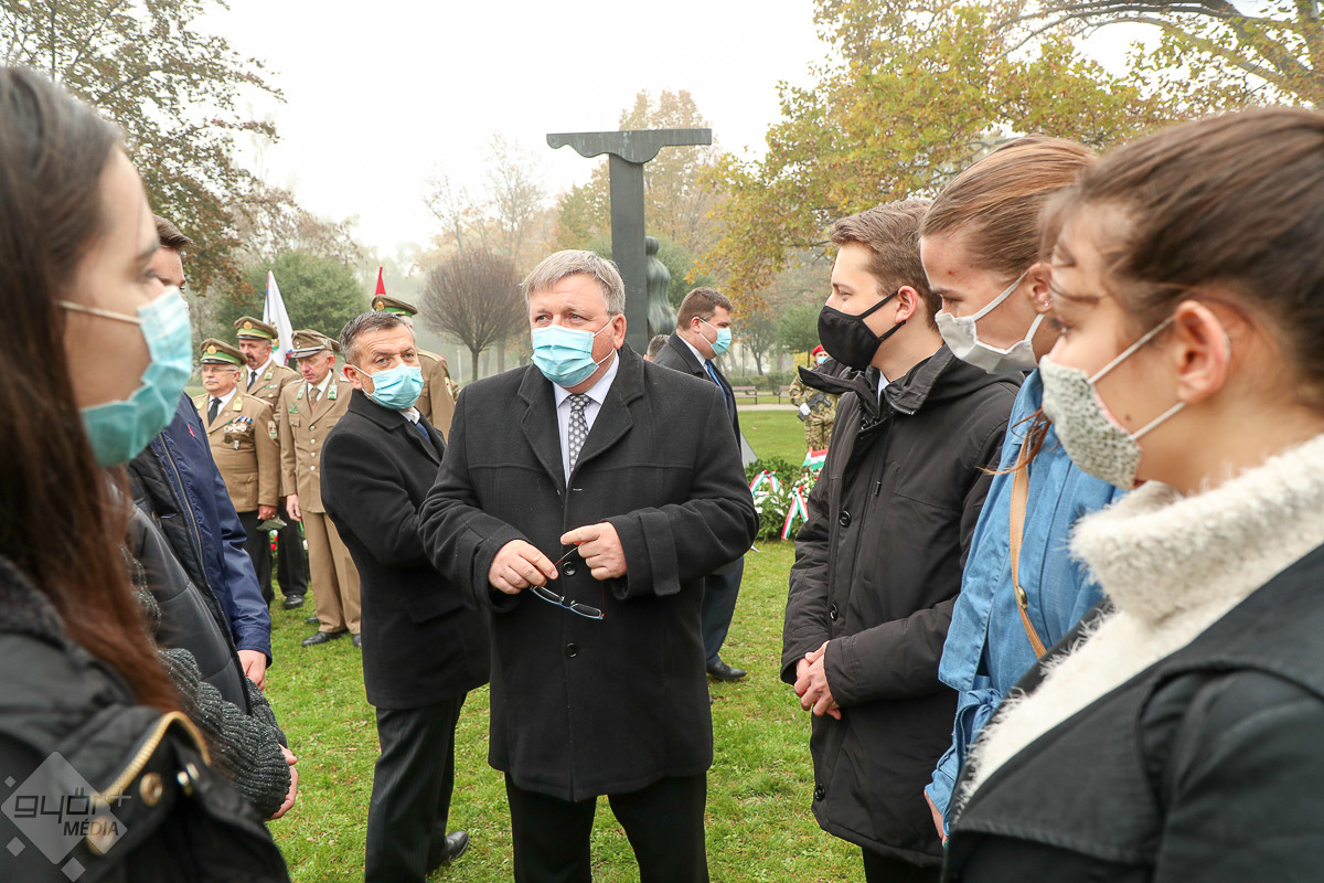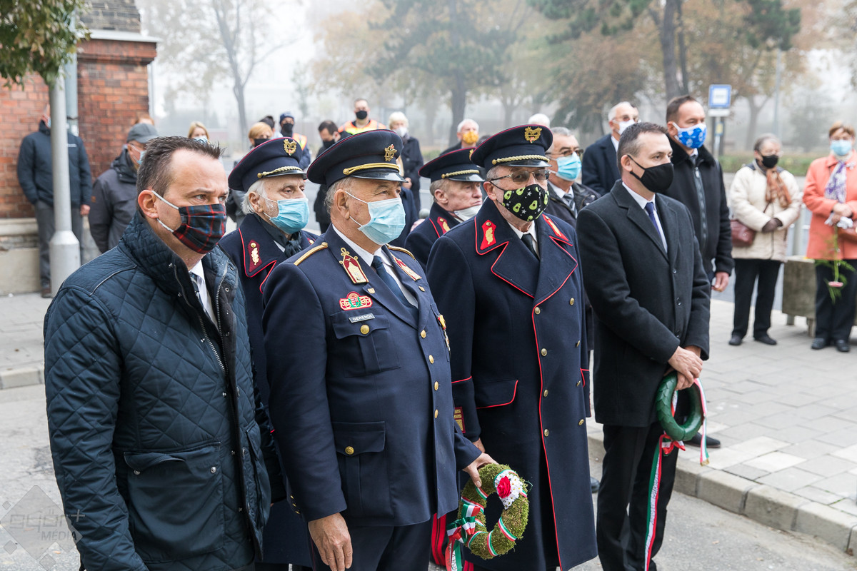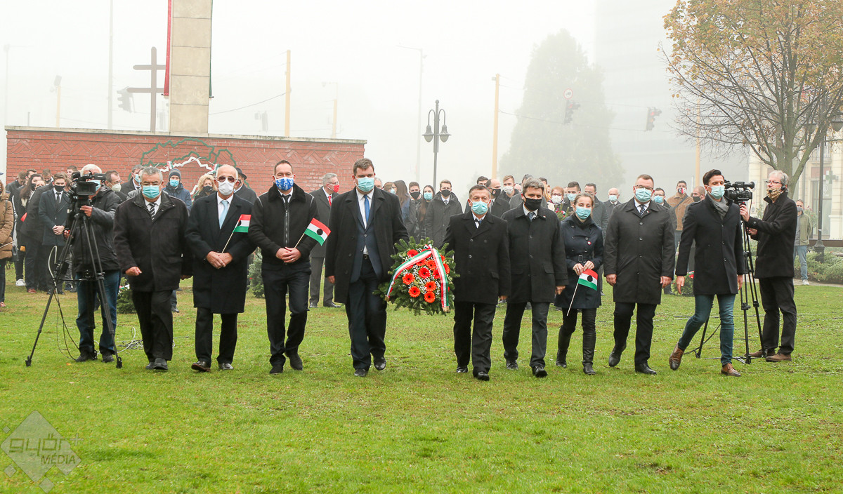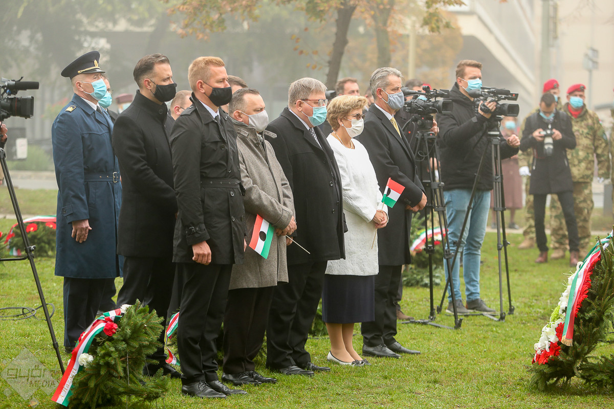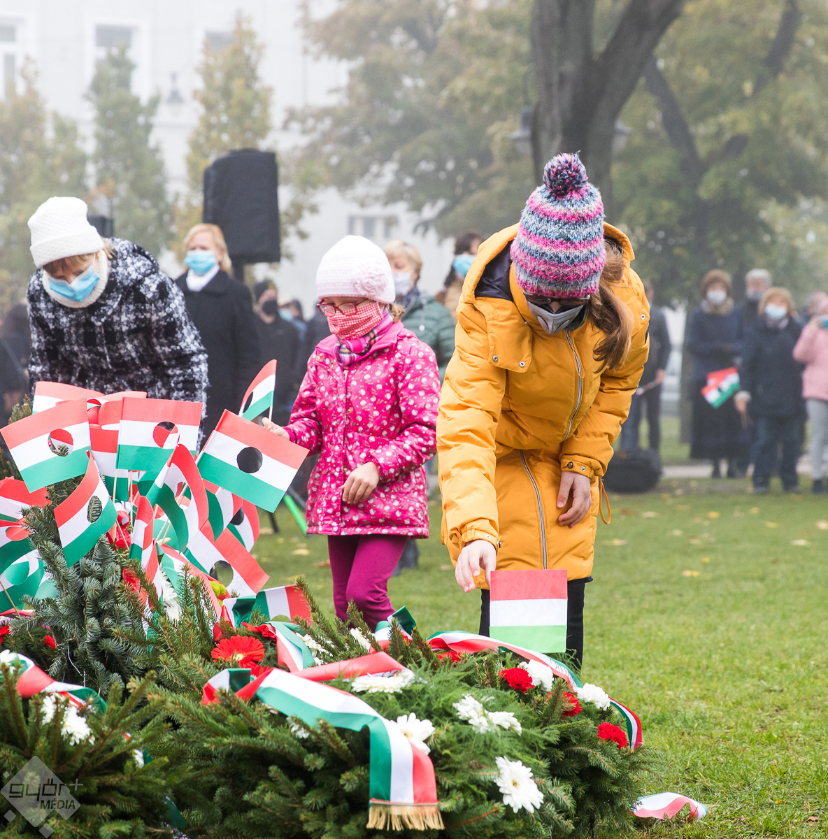 „Az ember és a nemzet természetes létállapota a szabadság. Ezt a szabadságot átmenetileg korlátozhatják az ordas eszmék szolgálatába álló zsarnoki hatalmak. Meggyalázhatják a nemzet múltját, átírhatják történelmét, polgáraiba belefojthatják a szót, börtönbe zárhatják őket, akár az életüket is elvehetik tőlük. De a történelmi példák mind azt mutatják: a szabadságvágy utat tör magának, elsodor minden hamis eszmét, s ha van hozzá nemzeti erő, akarat, összefogás, akkor, ha áldozatok árán is, de a nemzet fönnmarad, polgárai pedig visszaveszik szabadságukat.” – mondta emlékező beszédében Dr. Dézsi Csaba András polgármester. Hozzátette, büszkék lehetünk a saját hőseinkre, akik meghatározó történelmi egyéniségei lettek a forradalomnak. Felidézte Szigethy Attila, Földes Gábor, Tihanyi Árpád, Török István alakját, a forradalomban betöltött történelmi jelentőségű szerepüket, és az áldozatot, amelyet a nemzetért hoztak.