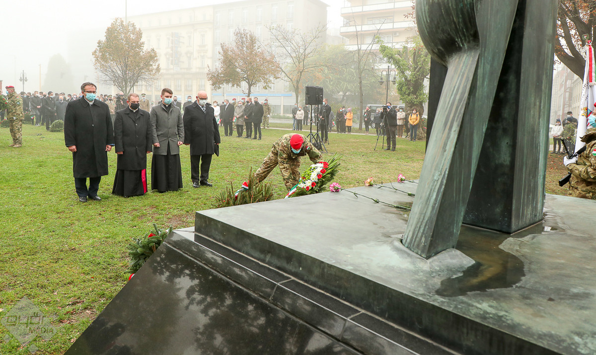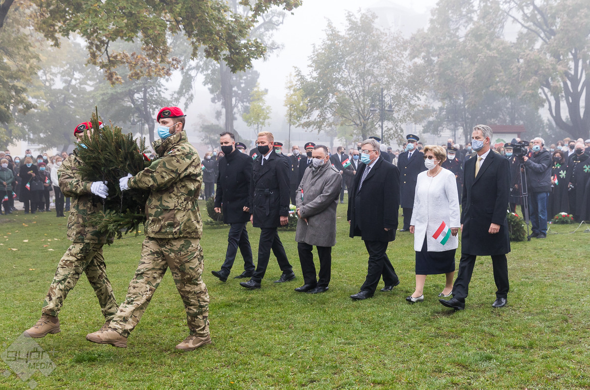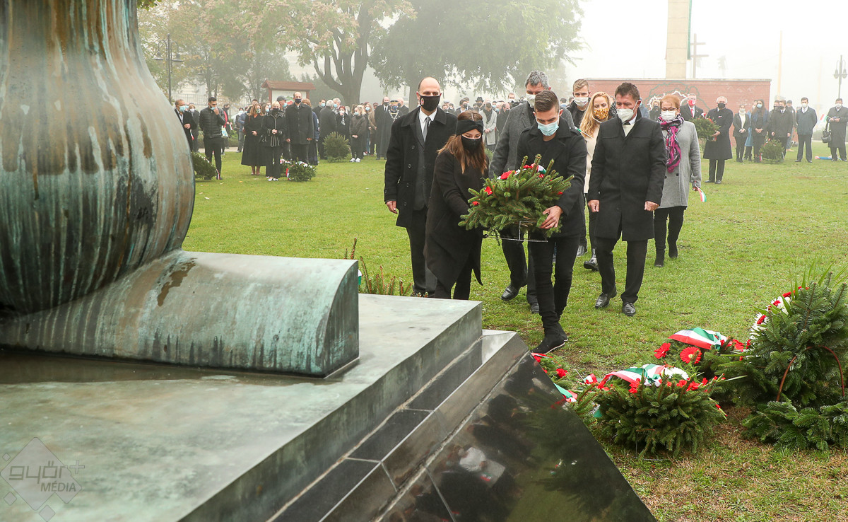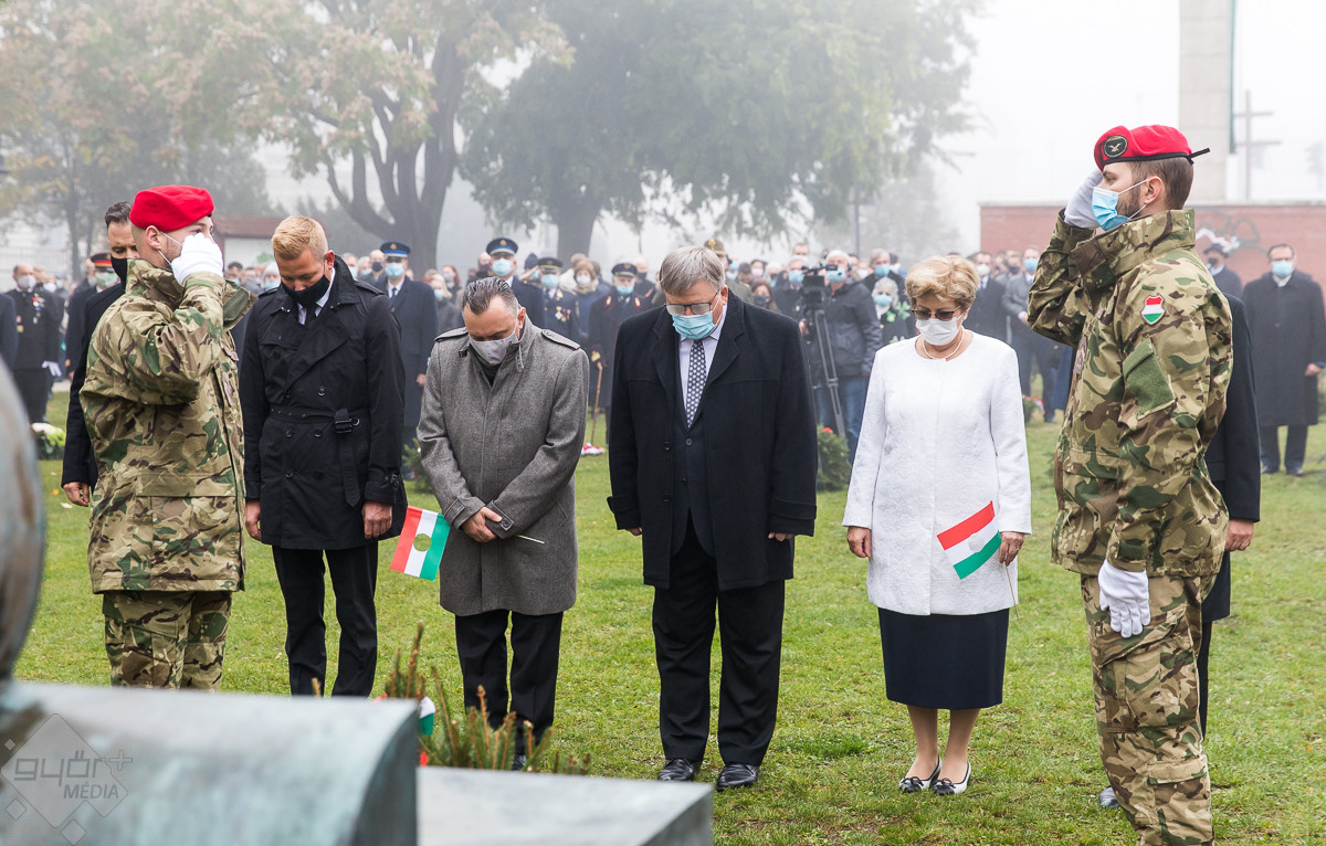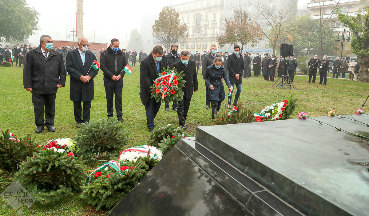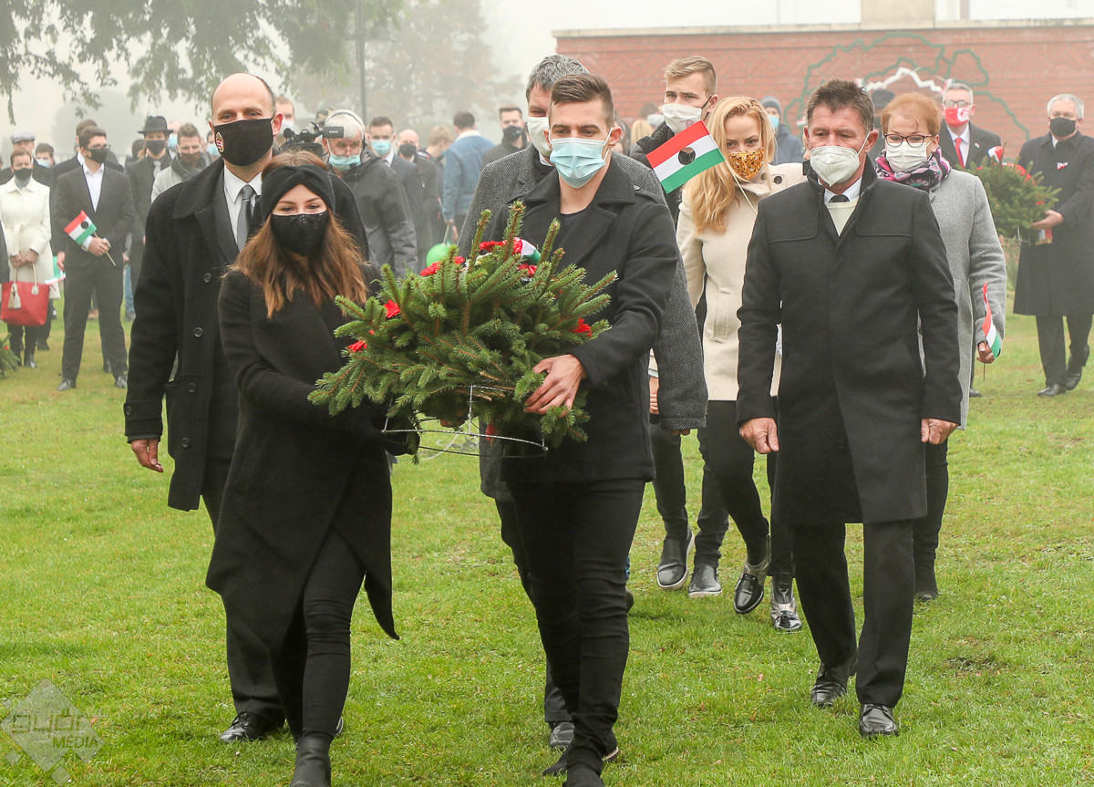 „Az ember és a nemzet természetes létállapota a szabadság. Ezt a szabadságot átmenetileg korlátozhatják az ordas eszmék szolgálatába álló zsarnoki hatalmak. Meggyalázhatják a nemzet múltját, átírhatják történelmét, polgáraiba belefojthatják a szót, börtönbe zárhatják őket, akár az életüket is elvehetik tőlük. De a történelmi példák mind azt mutatják: a szabadságvágy utat tör magának, elsodor minden hamis eszmét, s ha van hozzá nemzeti erő, akarat, összefogás, akkor, ha áldozatok árán is, de a nemzet fönnmarad, polgárai pedig visszaveszik szabadságukat.” – mondta emlékező beszédében Dr. Dézsi Csaba András polgármester. Hozzátette, büszkék lehetünk a saját hőseinkre, akik meghatározó történelmi egyéniségei lettek a forradalomnak. Felidézte Szigethy Attila, Földes Gábor, Tihanyi Árpád, Török István alakját, a forradalomban betöltött történelmi jelentőségű szerepüket, és az áldozatot, amelyet a nemzetért hoztak.