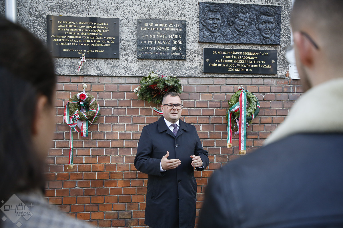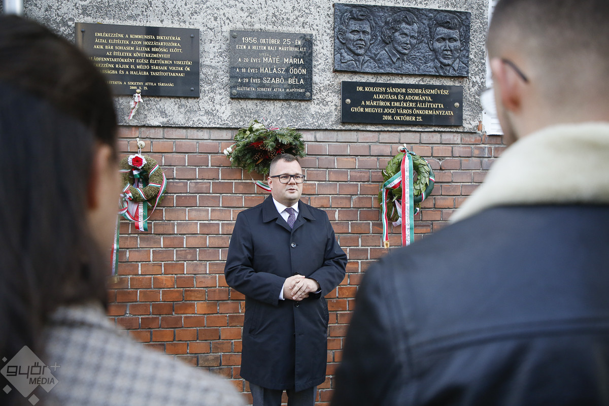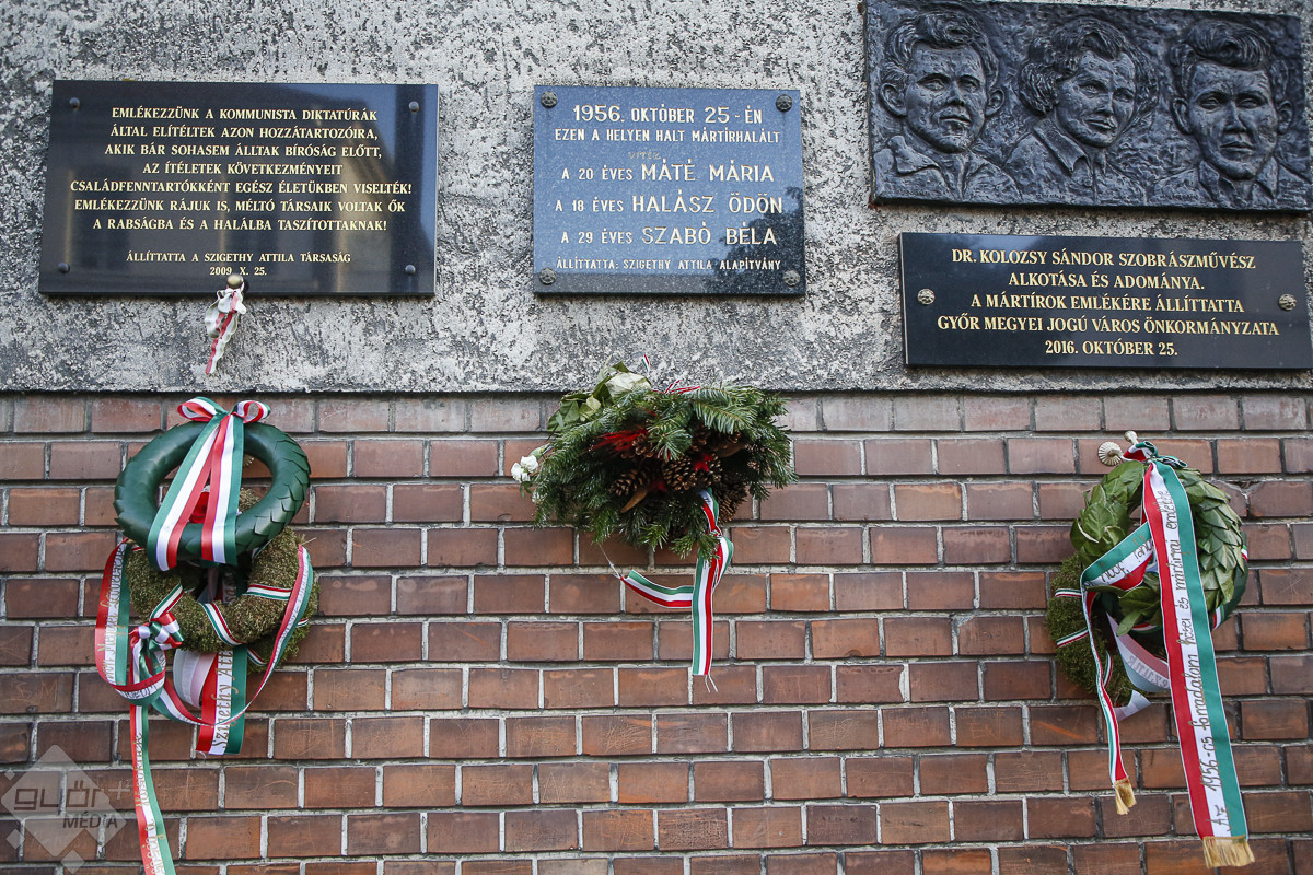 1956. november 4-én a szovjet tankok vérbe fojtották a szabadság diadalát nem csak a forradalom fővárosában Budapesten, de Győrben is. A Fidelitas győri szervezete ezért megemlékezést tartott és helyszínül a három győri 56-os fiatal mártír emléktábláját választották a börtönnel szemben.