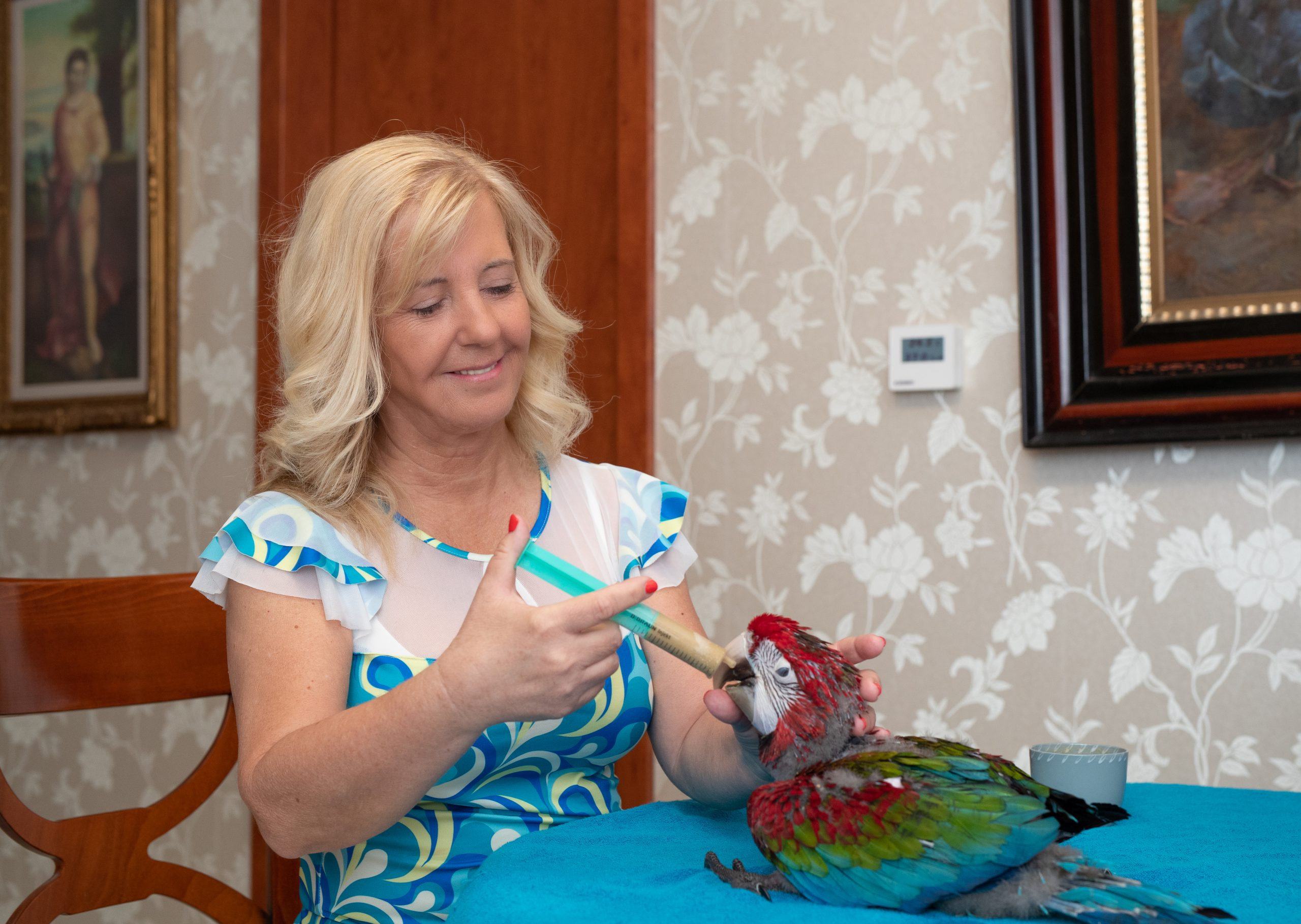 Elhozom, felelte dr. Dézsiné Szentes Veronika. A családban akkor már nyolc papagáj élt. Az állatkerti lett a kilencedik, ám azóta újabb papagáj született a vadasparkban, s vele szintén nem törődnek a szülei. Tizedikként ő is Dézsiéknél lakik egy inkubátorban, az első napokban kétóránként, aztán már csak háromóránként kell etetni fecskendővel, éjjel és nappal egyaránt. Folyamatosan mérik a súlyát, s minden mozzanatot naplózni kell.