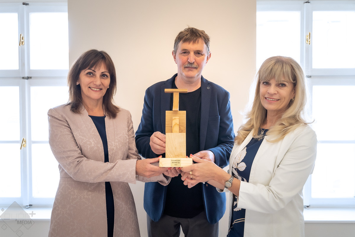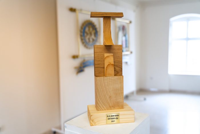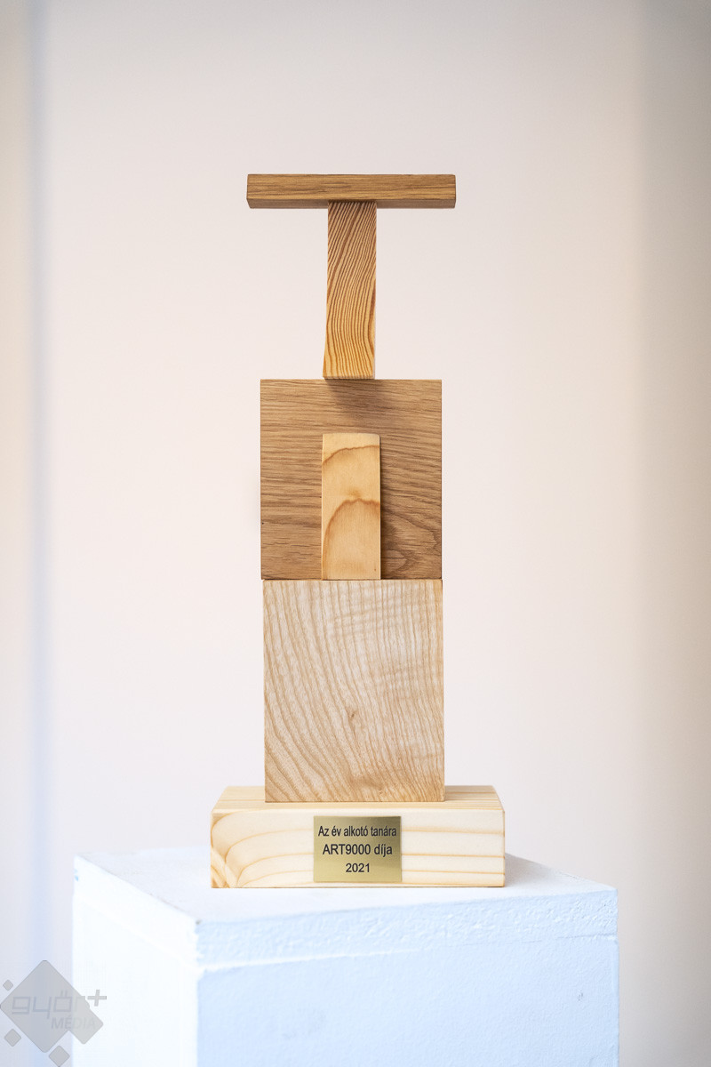 A díj, egy modern, fából készült szobor, amely szimbolizálja a szárnyaló alkotó tanárokat – Lebó Ferenc alkotása.