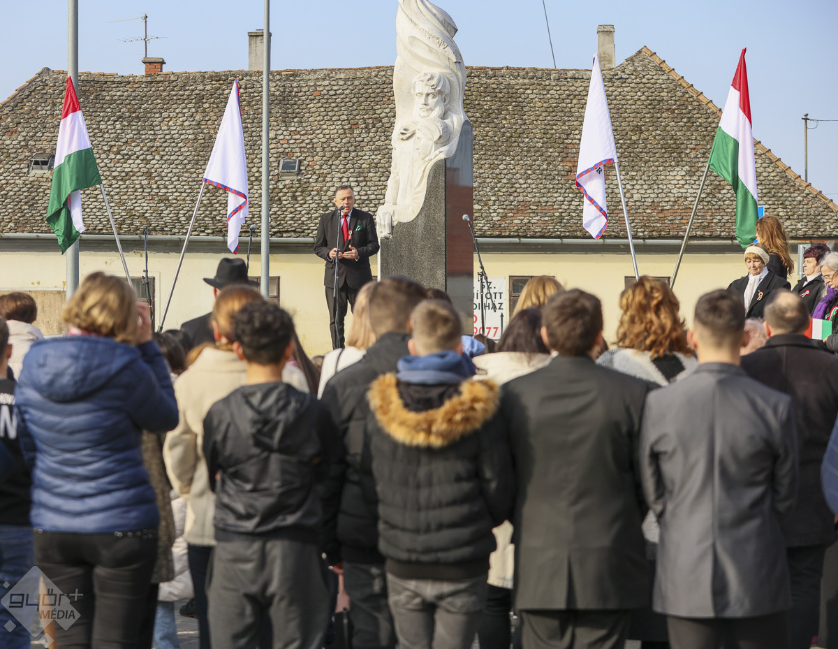 Emlékeztetett a Kossuth nóta máig ható üzenetére: mi magunk vagyunk az a regiment, akit Kossuth Lajos hív. Ő és társai a magyar szabadságért, a magyar öntudatért, a hazáért, a szuverenitásunkért, az identitásunkért, a függetlenségünkért harcoltak. Ma válságok sorozatát éli át kontinensünk, nem találjuk az utat, mintha elvesztettük volna azt a mércét, amit követnünk kellene, amit őseink jelöltek ki számunkra. Pedig nincs más dolgunk, mint azt a zsinórmértéket követni, amit a márciusi ifjak tűztek ki elénk. Ez az út a magyarság útja, amiről nem szabad letérnünk – hangsúlyozta a szónok.