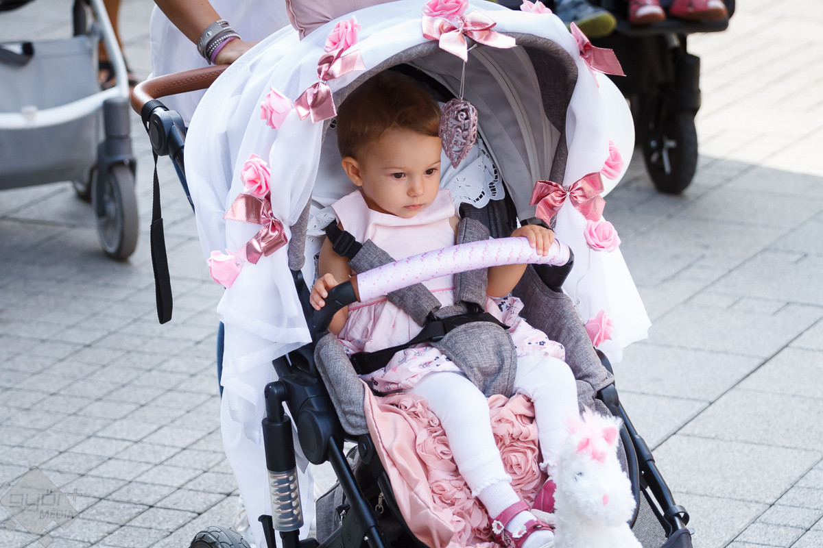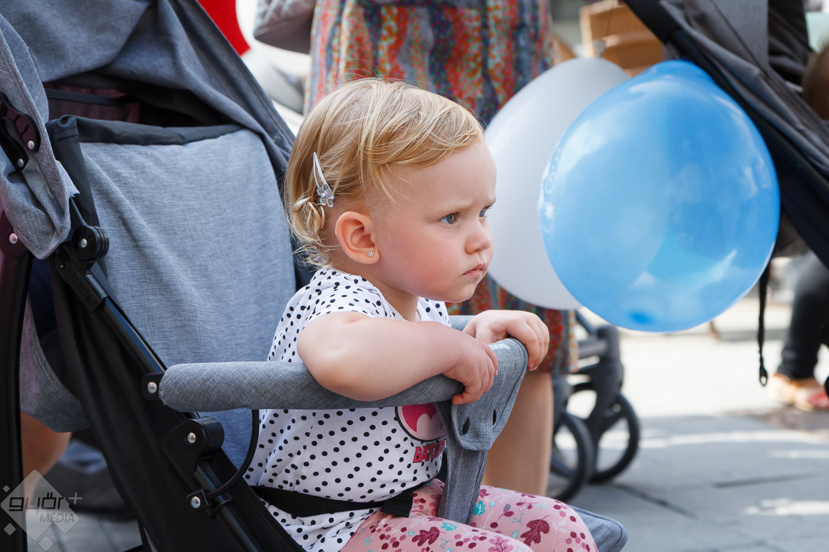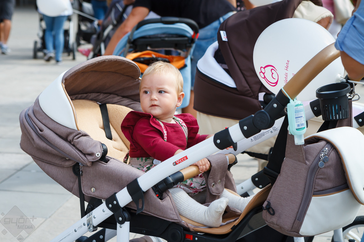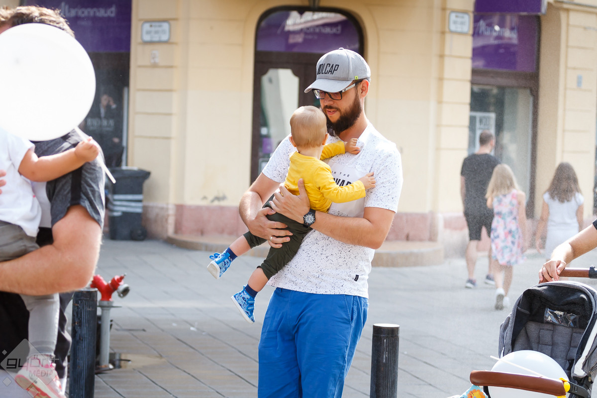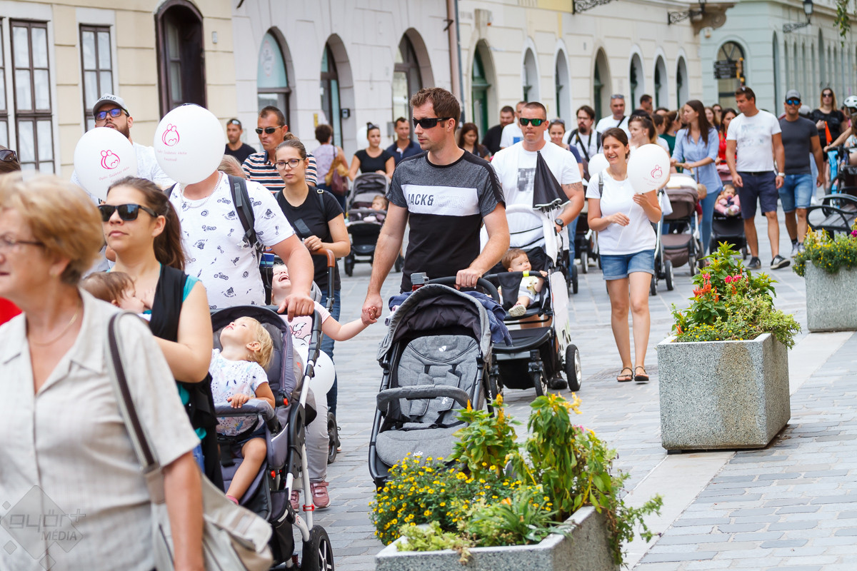 Vidám és színes forgataggá vált a több száz résztvevővel induló családok alkotta séta, feldíszített babakocsik, bennük gyönyörű kisgyermekek, kezükben színes lufival. A menet élén Mini Kovi, a város legfiatalabb dj-jének apró keverőpulttal is felszerelt hangosítójából szólt a zene, Kovács-Veszprémi Viktória és a dj apuka, Zsolt 8 hónapos kisfia már mondhatni születése után édesapja nyomdokába lépve szolgáltatta a számokat ahhoz a rögtönzött Király utcai bemutatóhoz is, ahol anyukák tartottak – hátukon babahordozóban ülő gyermekeikkel – táncbemutatót. A nem mindennapi látványt nagy tapssal díjazták a járókelők éppúgy, mint a teraszokon ülő városiak vagy turisták, miközben a büszke édesapák telefonjaikkal fényképeket vagy videókat készítettek a párjukról és gyermekük első nyilvános fellépéséről.
