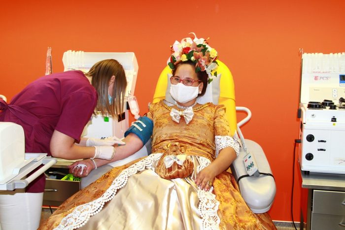 Barokk ruhában, vidáman érkezett a győri Plazma Pontra, ahol rutinvizsgálatok után megtörtént a plazma vétele. Vérre és vérplazmára folyamatosan szükség van, mert a plazma ugyan 2 évig, viszont a vérkészítmények rövidebb ideig használhatók fel, ezért fontos a folyamatos utánpótlás