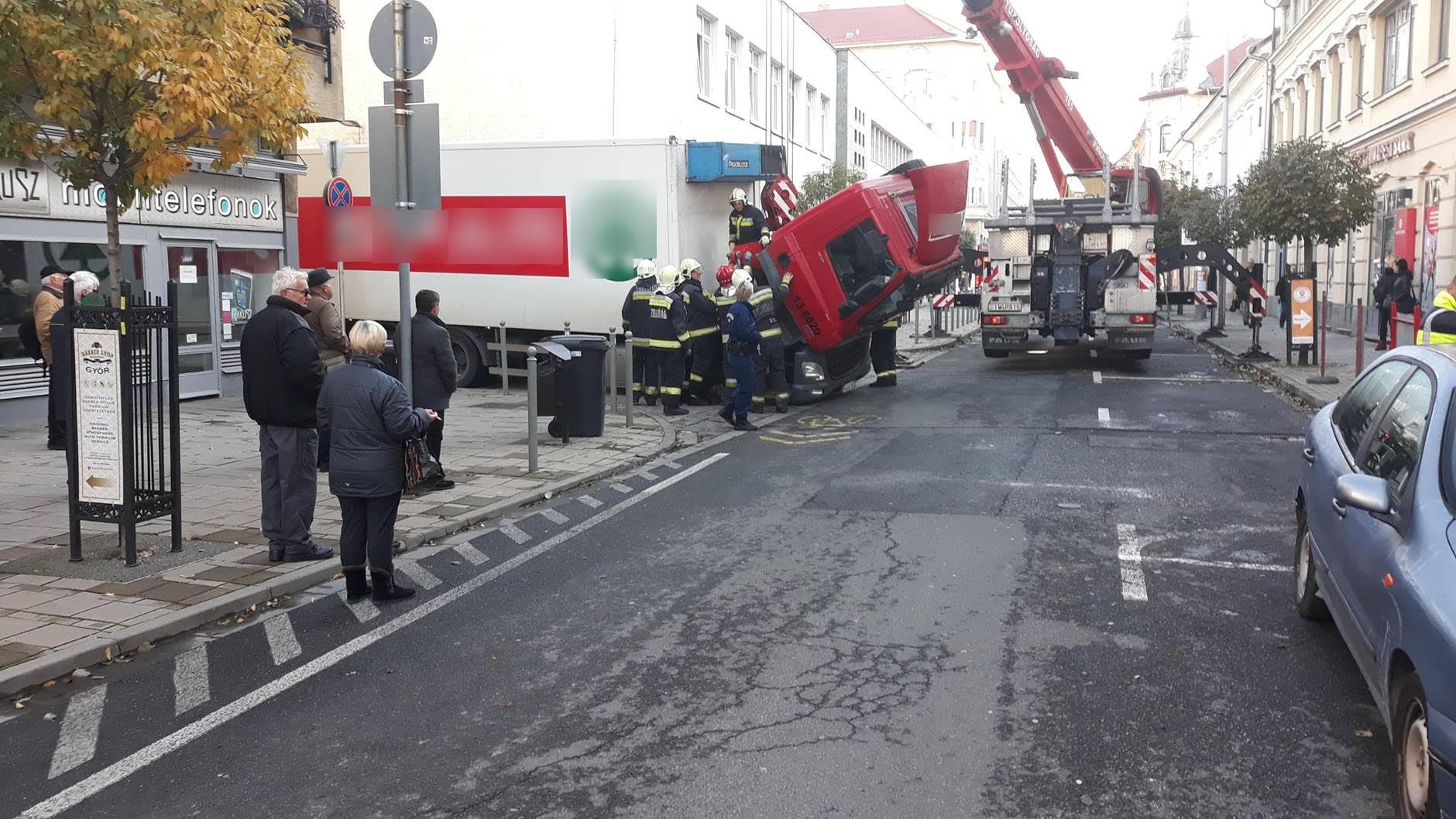 Beszakadt az úttest egy áruszállító kamion alatt a Belvárosban, a Bajcsy-Zs. út és Arrabona udvar sarkán.