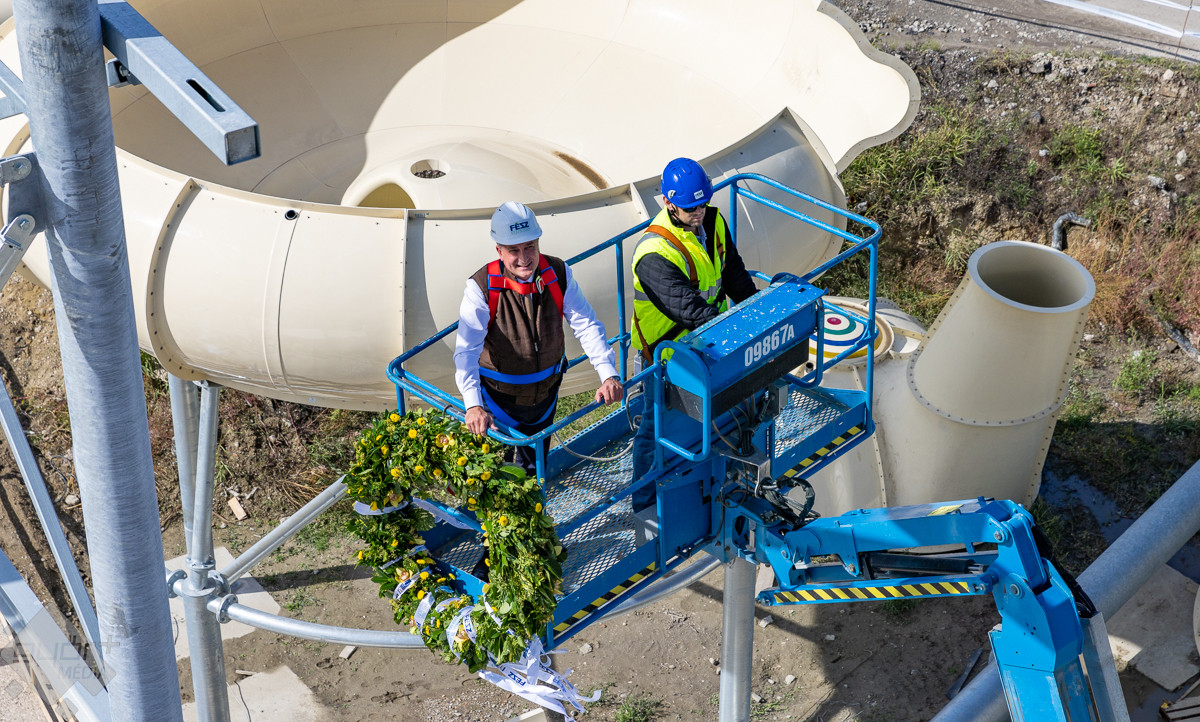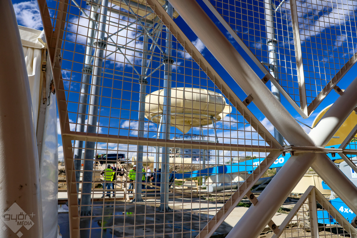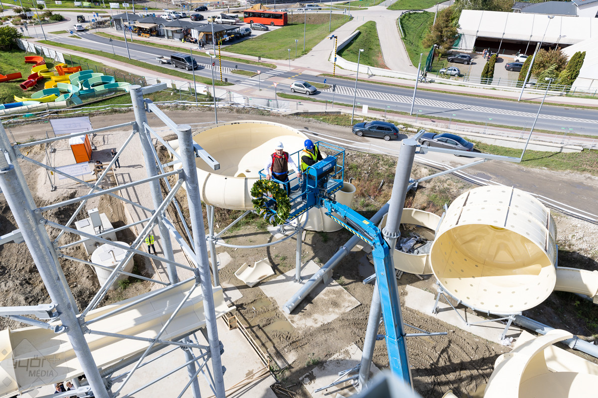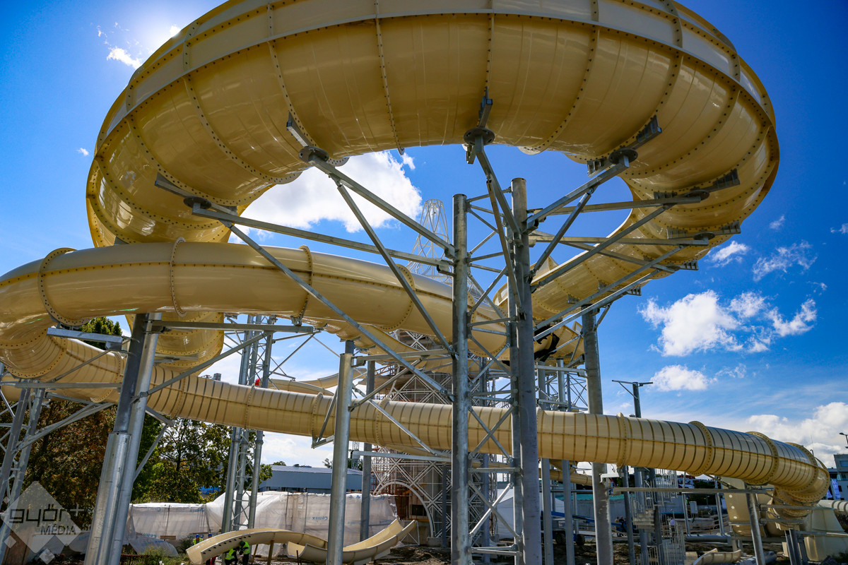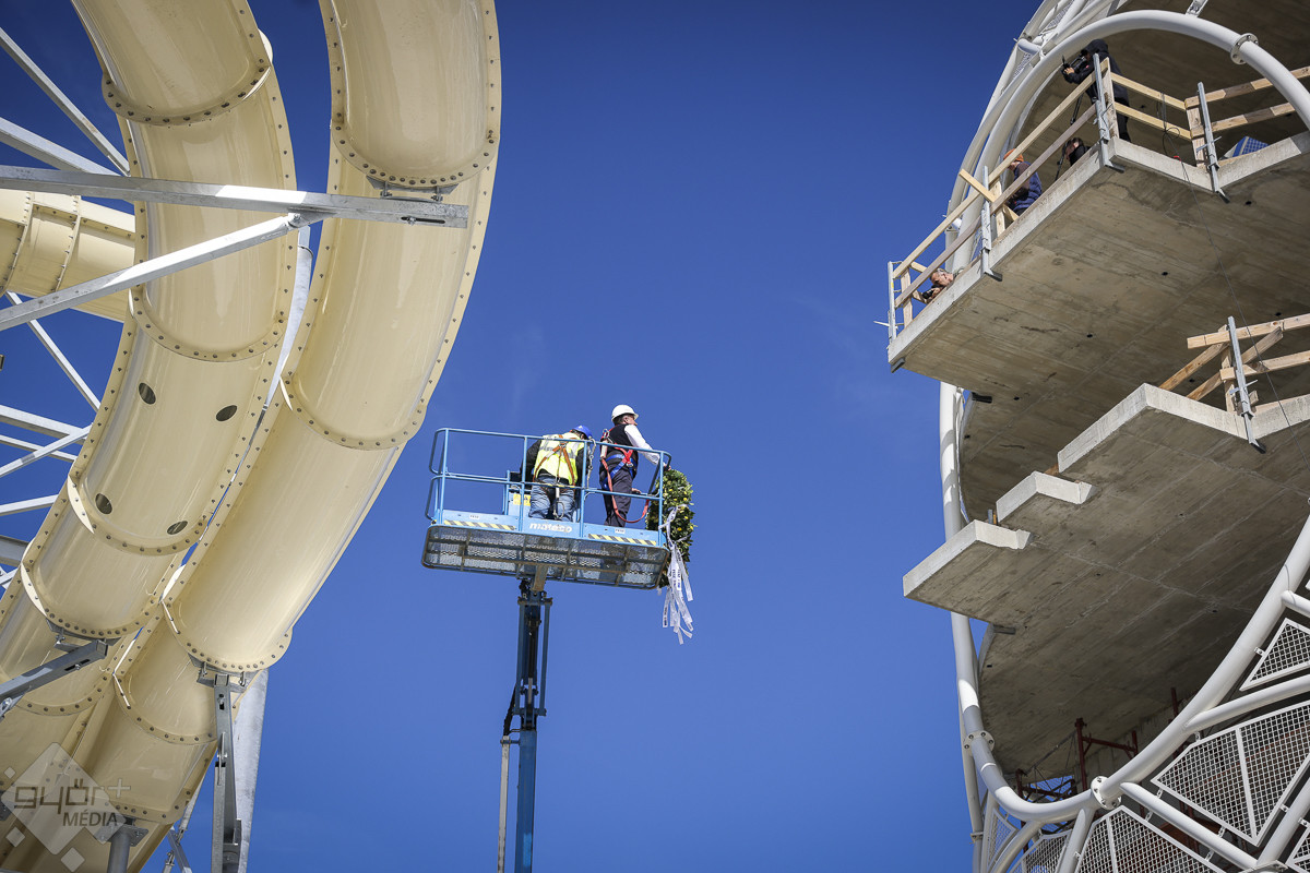 A több mint 21 milliárdos győri vízi élménypark beruházás, amely a Modern Városok Program keretében valósul meg, elérte legmagasabb pontját, amely a szódásszifon-csúszda. Ez alkalomból bokrétaünnepet tartottak szerdán.