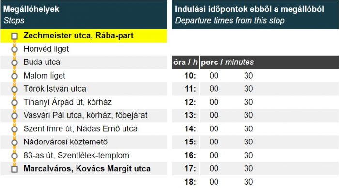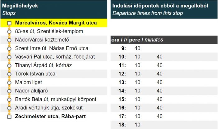 A munkanapokon 4:50-kor Ménfőcsanak felől az Audi gyárhoz közlekedő járat 5 perccel korábban, 4:45-kor indul.
