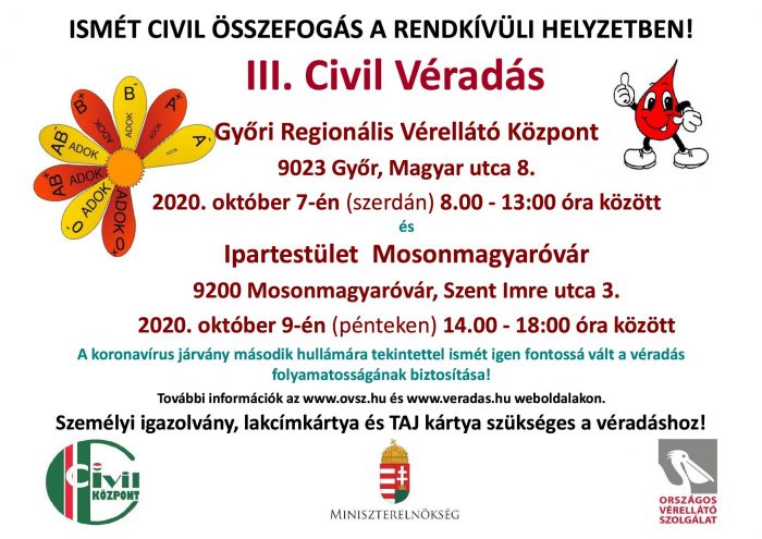 Győrött: október 7-én (szerdán) 8:00 és 13:00 óra között a Győri Regionális Vérellátó Központban (Győr, Magyar u. 8.), Mosonmagyaróváron pedig október 9-én (pénteken) 14.00-18.00 óráig az Ipartestületben. (Mosonmagyaróvár, 9200, Szent Imre u. 3.)
