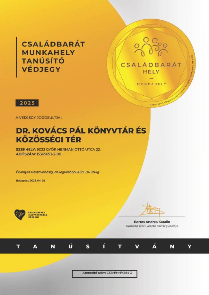 A Dr. Kovács Pál Könyvtár és Közösségi Tér elnyerte a Családbarát Munkahely Tanúsító Védjegy használati jogát. Az elismerés hivatalosan is tanúsítja intézmény elkötelezettségét a családbarát szemlélet és a munka-magánélet egyensúlyának támogatása mellett.