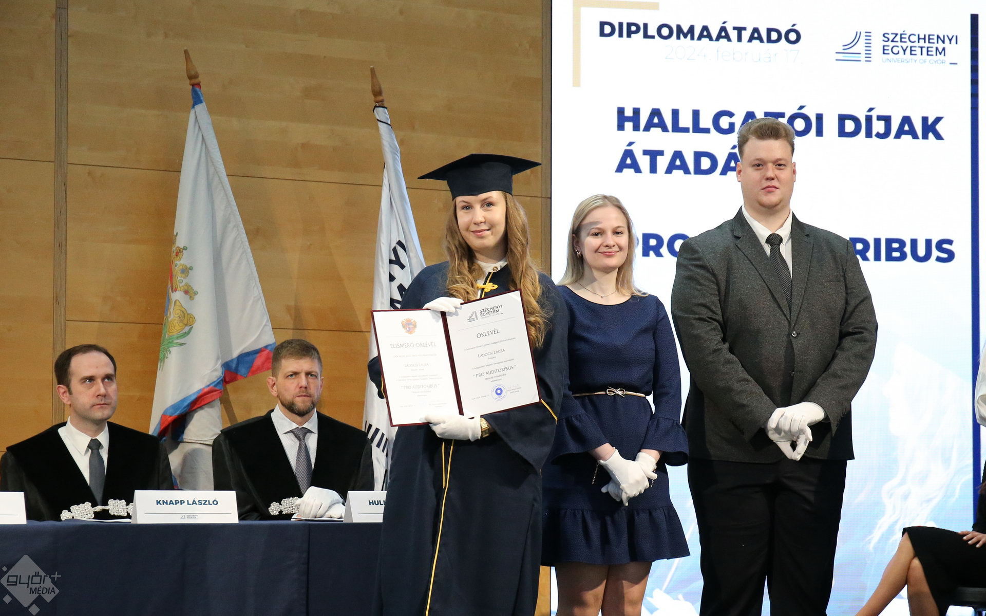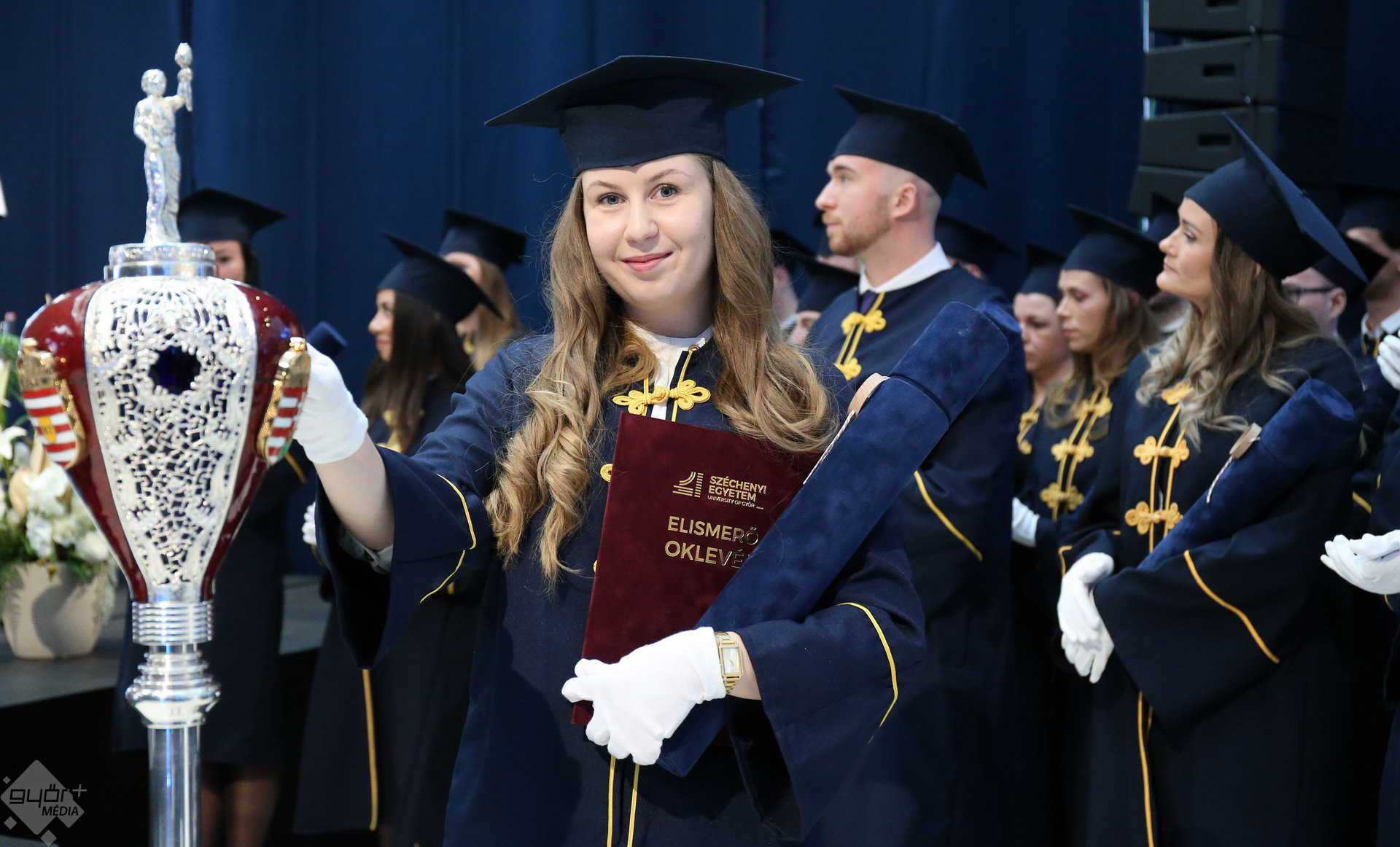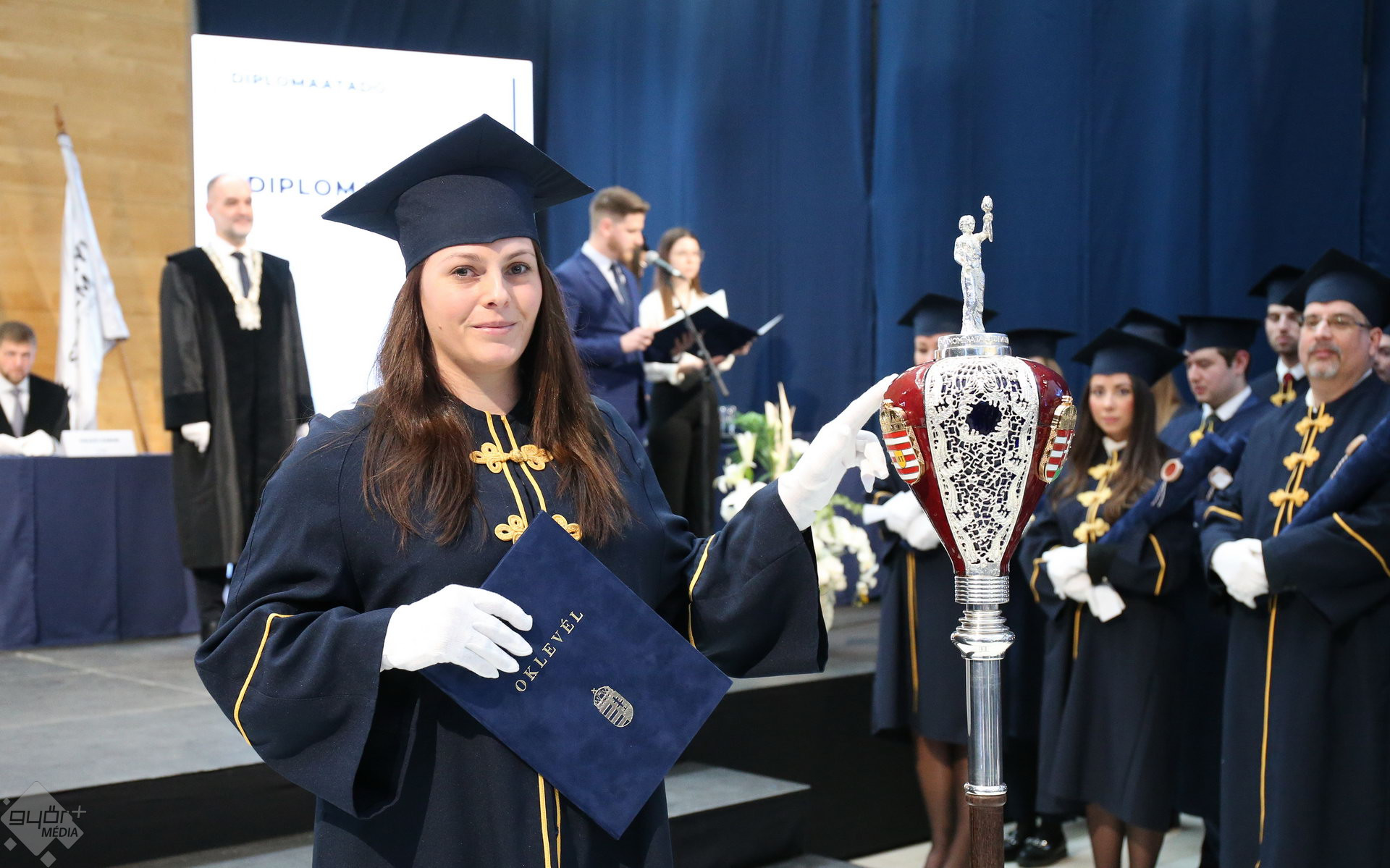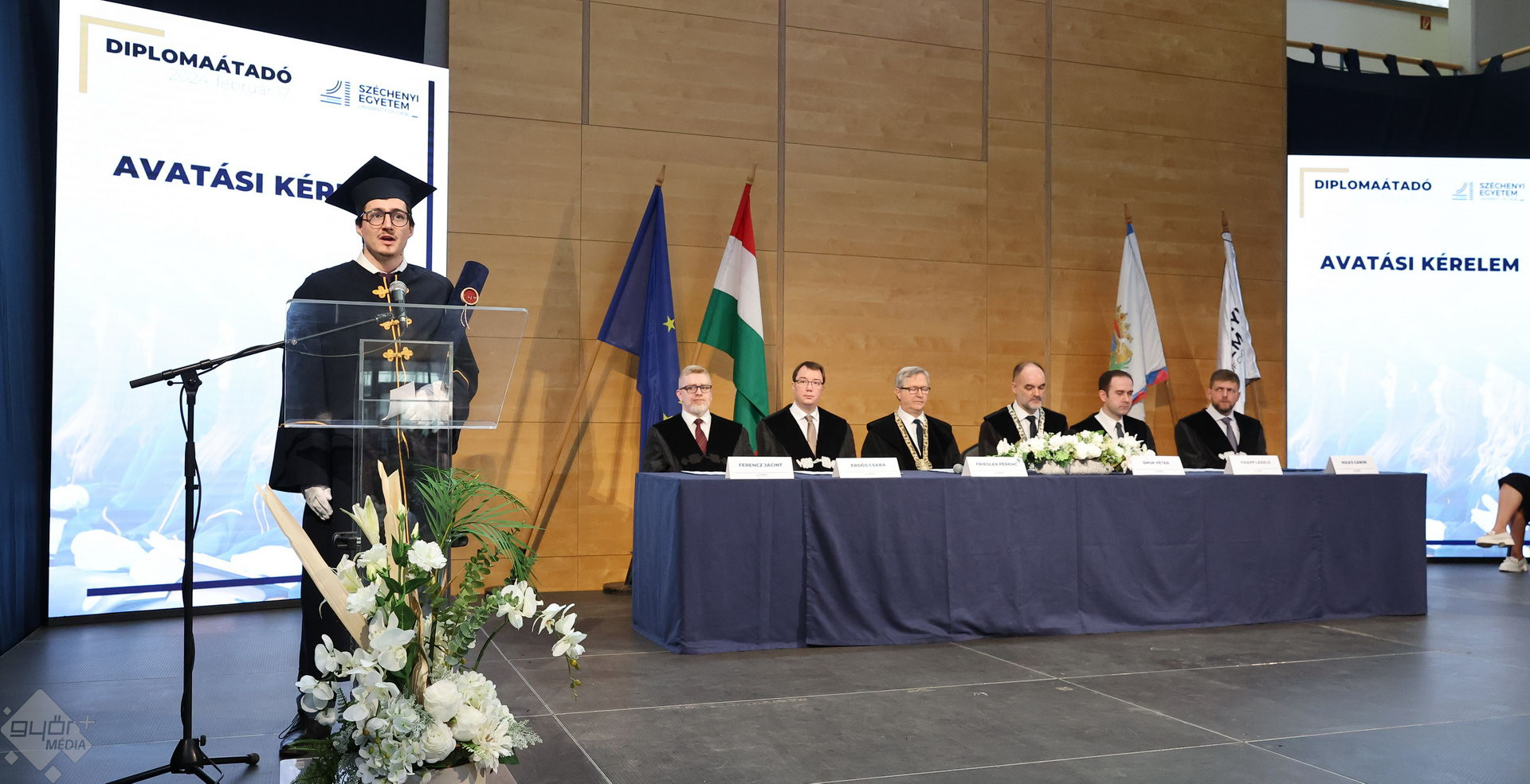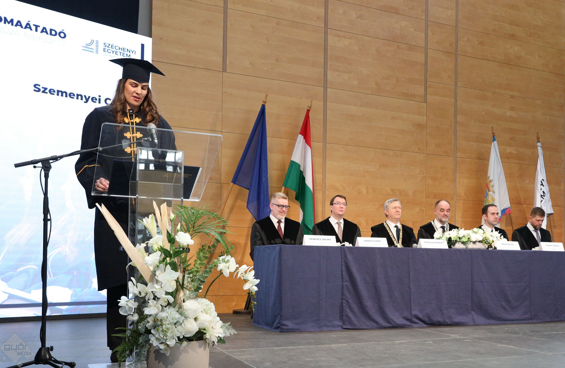 A Széchenyi István Egyetemen elnökségének bevonulásával kezdődött a ceremónia. A végzős hallgatókat Dr. Ferencz Jácint, a munkajogi és szociális jogi tanszék vezetője köszöntötte. Az egyetemi docens kiemelte: „a papír amire diplomájukat nyomtatták tudásuk pillanatnyi állapotát mutatja. Útravalónak megfelelő, de önmagában nem lesz elegendő ahhoz, hogy boldogulni tudjanak az életben. Ezért a diploma birtoklásánál sokkal fontosabb, ami a papír mögött van. Vagyis mind az a tudást és képesség, amit igyekeztünk átadni önöknek.”