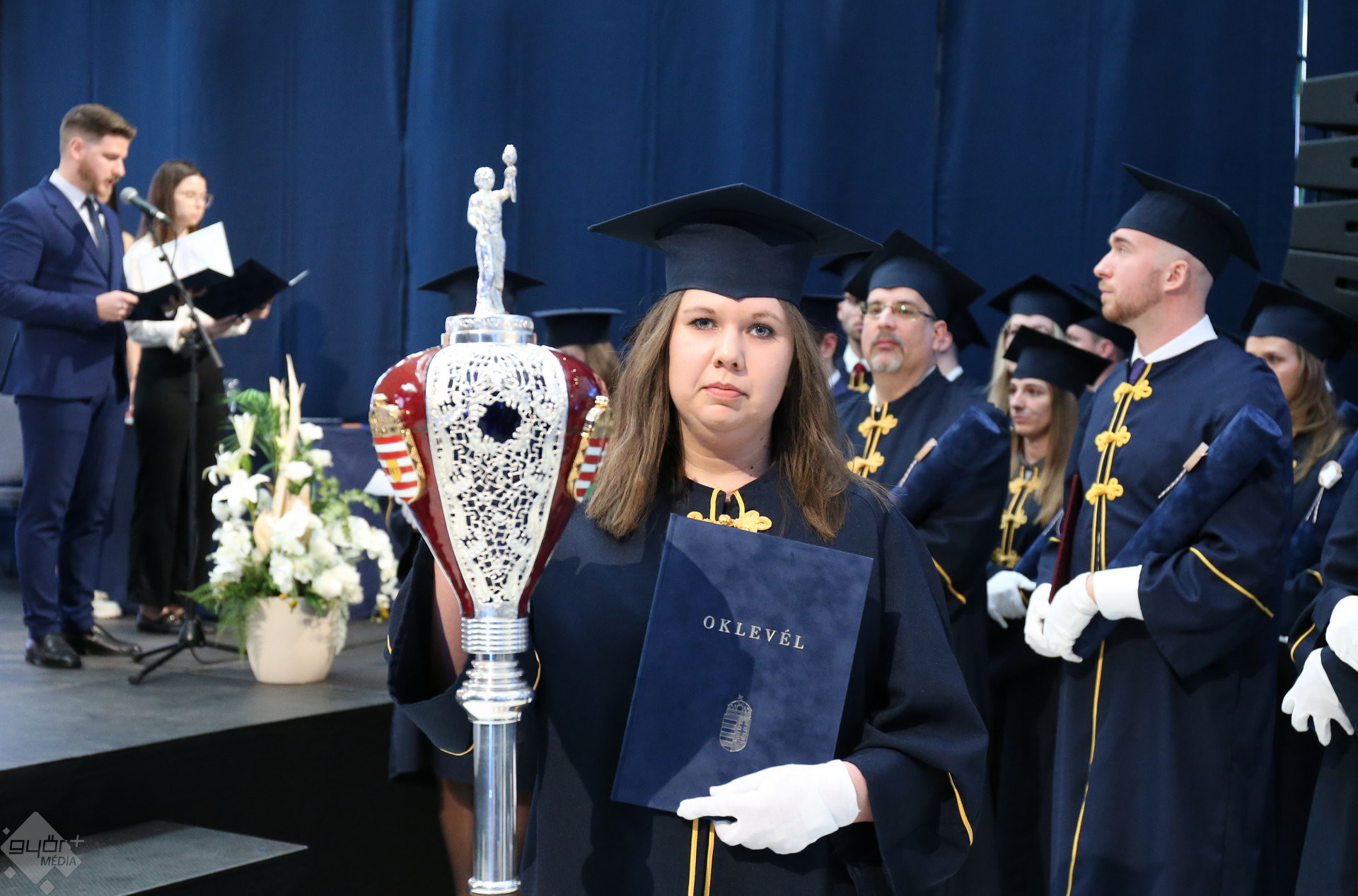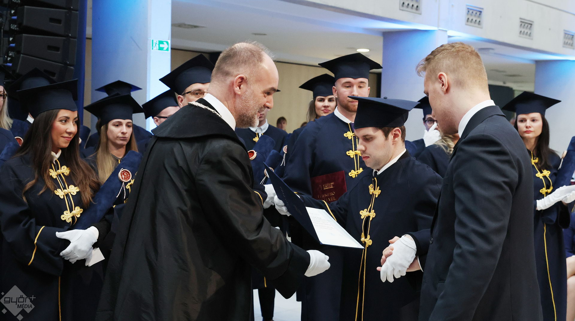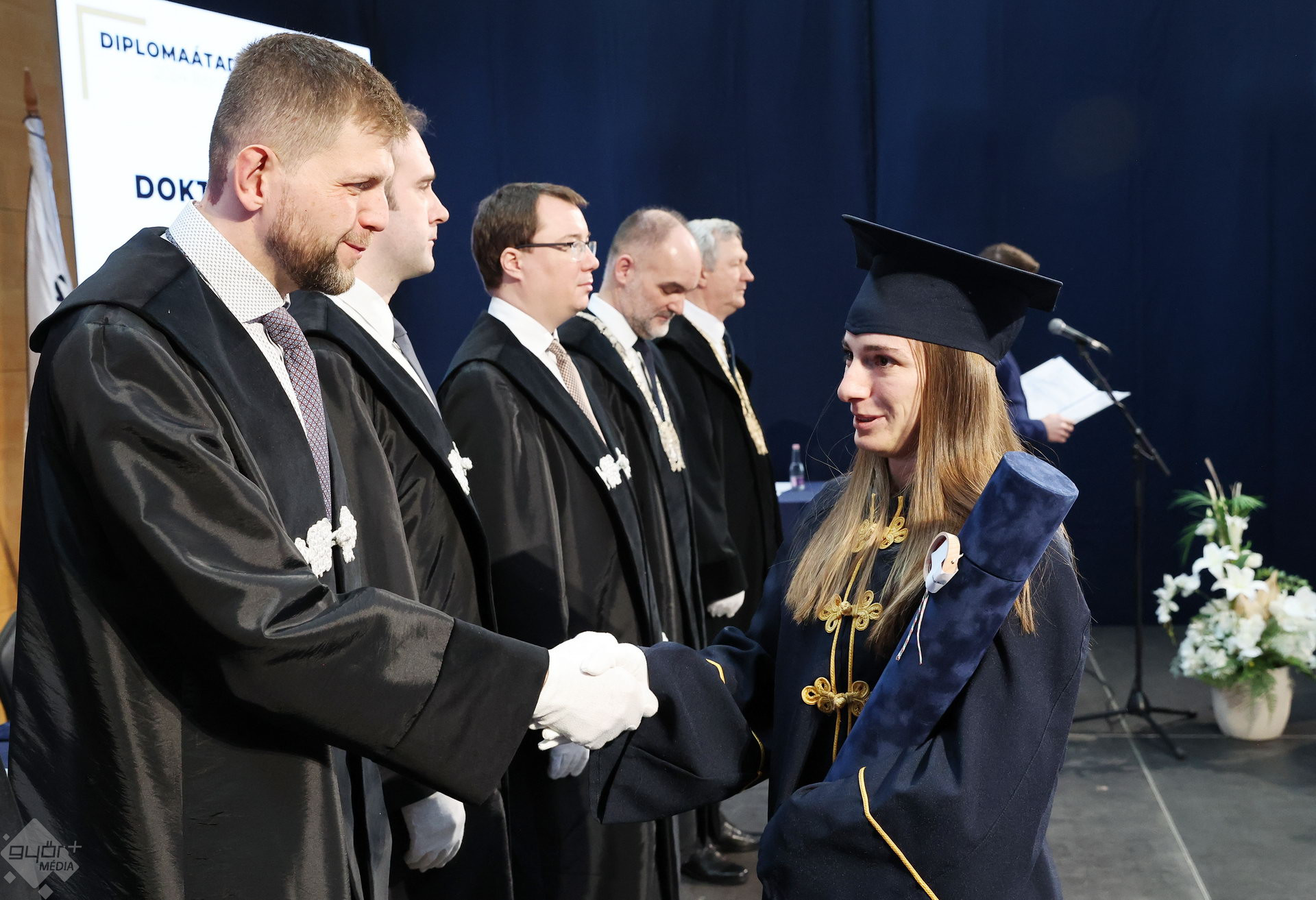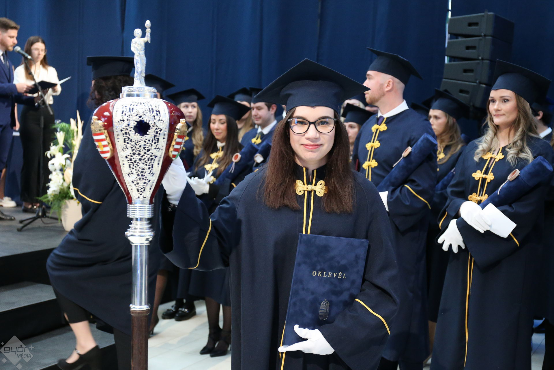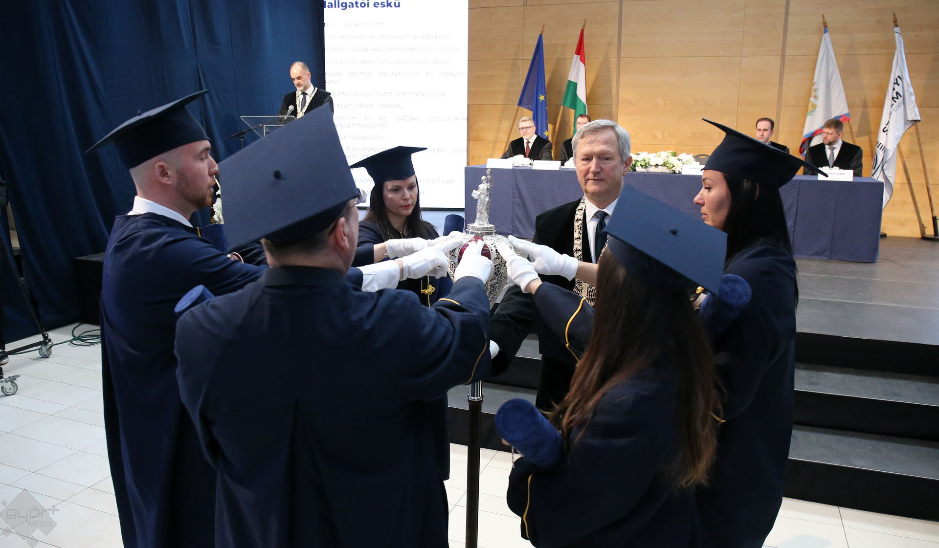 A Széchenyi István Egyetemen elnökségének bevonulásával kezdődött a ceremónia. A végzős hallgatókat Dr. Ferencz Jácint, a munkajogi és szociális jogi tanszék vezetője köszöntötte. Az egyetemi docens kiemelte: „a papír amire diplomájukat nyomtatták tudásuk pillanatnyi állapotát mutatja. Útravalónak megfelelő, de önmagában nem lesz elegendő ahhoz, hogy boldogulni tudjanak az életben. Ezért a diploma birtoklásánál sokkal fontosabb, ami a papír mögött van. Vagyis mind az a tudást és képesség, amit igyekeztünk átadni önöknek.”
