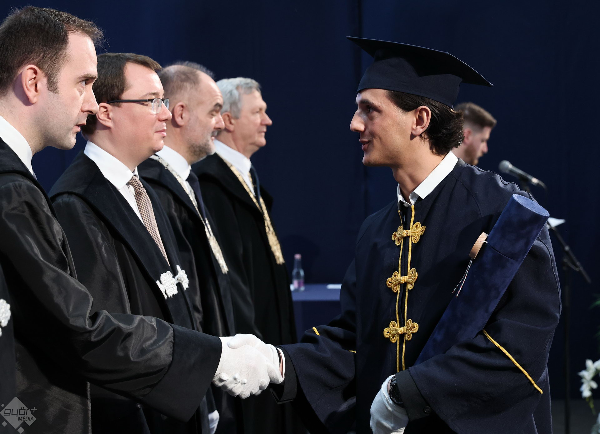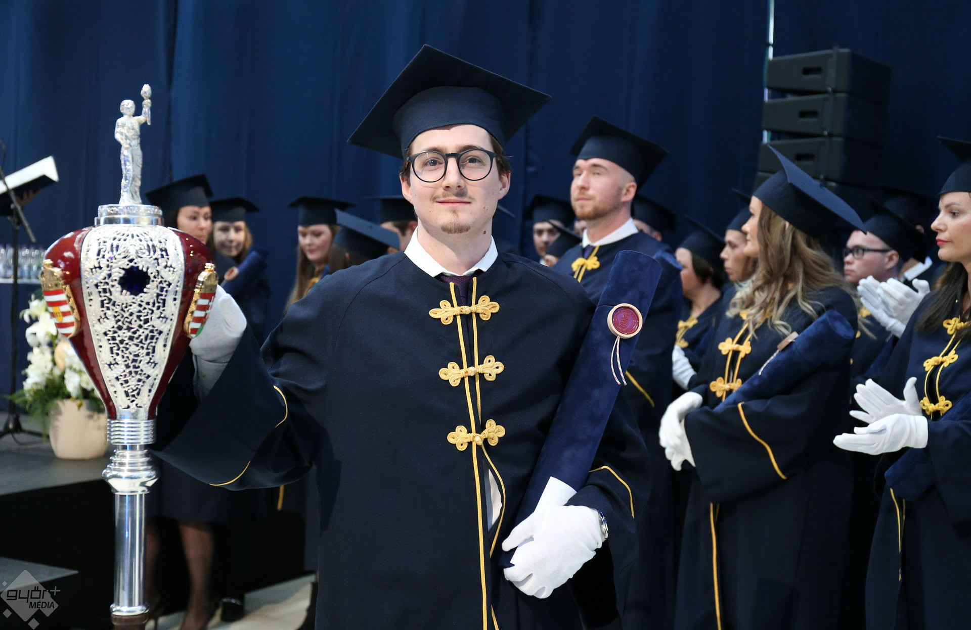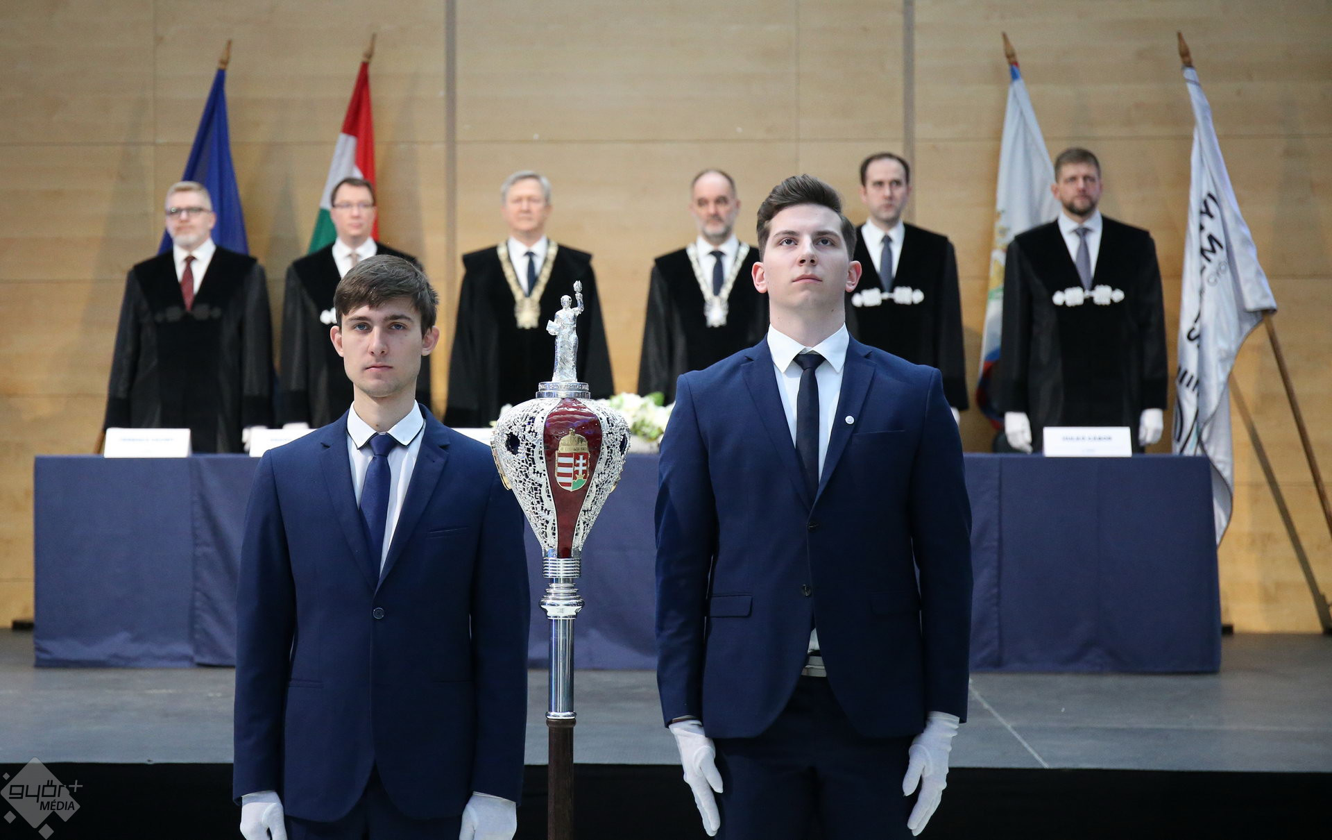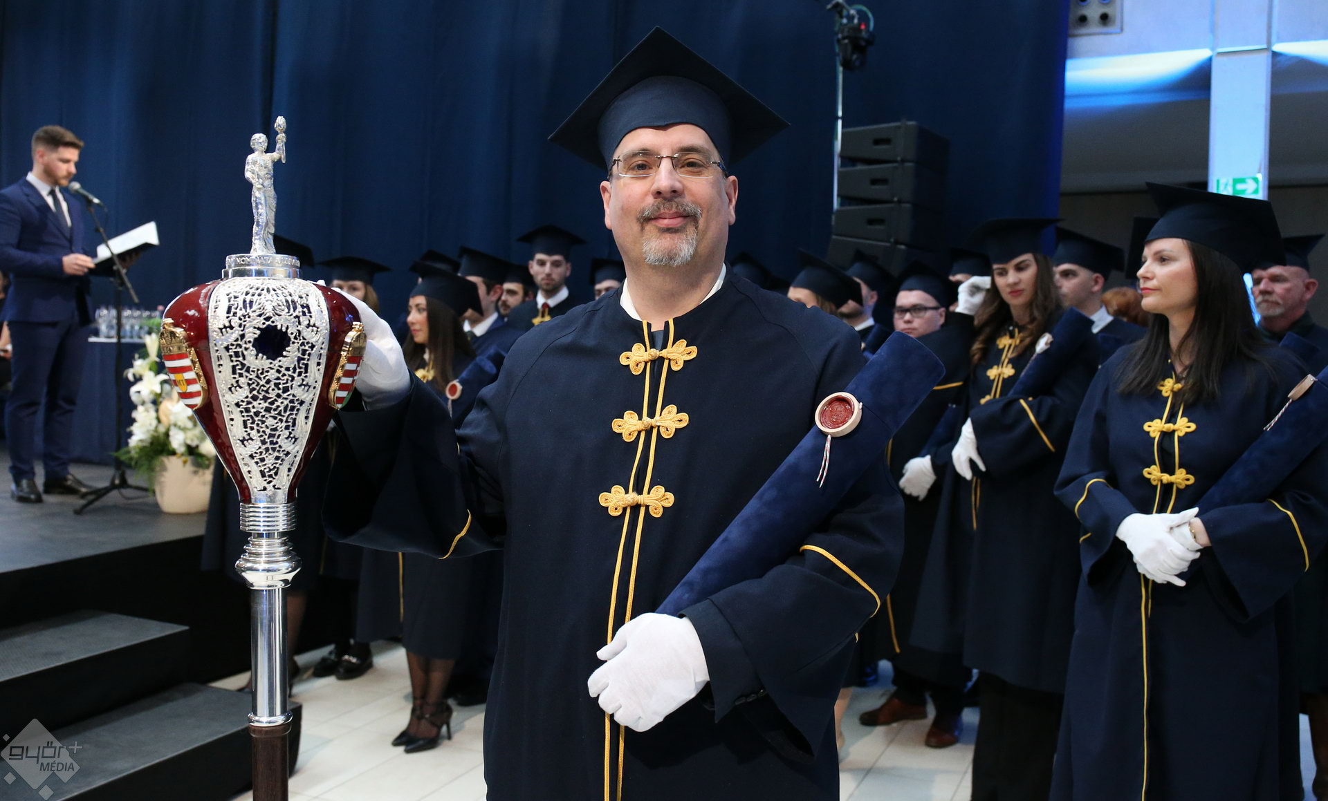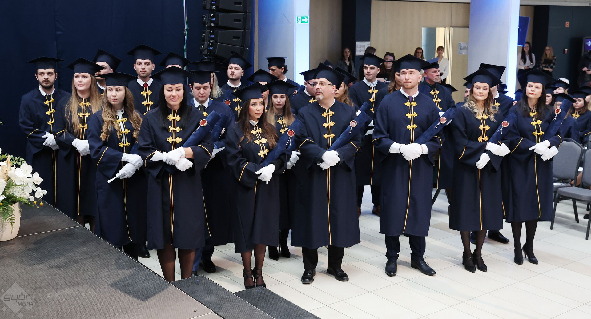A Széchenyi István Egyetemen elnökségének bevonulásával kezdődött a ceremónia. A végzős hallgatókat Dr. Ferencz Jácint, a munkajogi és szociális jogi tanszék vezetője köszöntötte. Az egyetemi docens kiemelte: „a papír amire diplomájukat nyomtatták tudásuk pillanatnyi állapotát mutatja. Útravalónak megfelelő, de önmagában nem lesz elegendő ahhoz, hogy boldogulni tudjanak az életben. Ezért a diploma birtoklásánál sokkal fontosabb, ami a papír mögött van. Vagyis mind az a tudást és képesség, amit igyekeztünk átadni önöknek.”