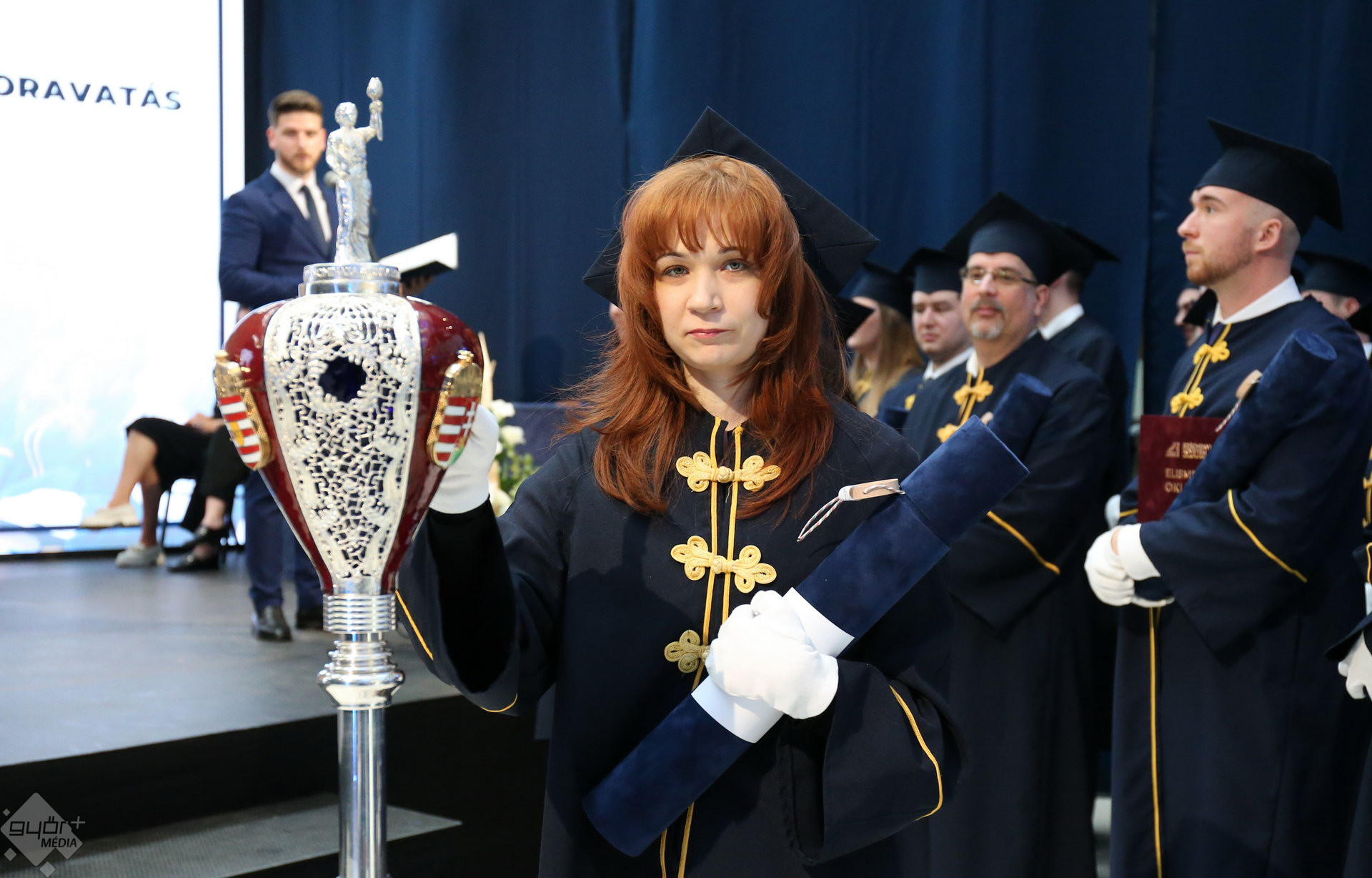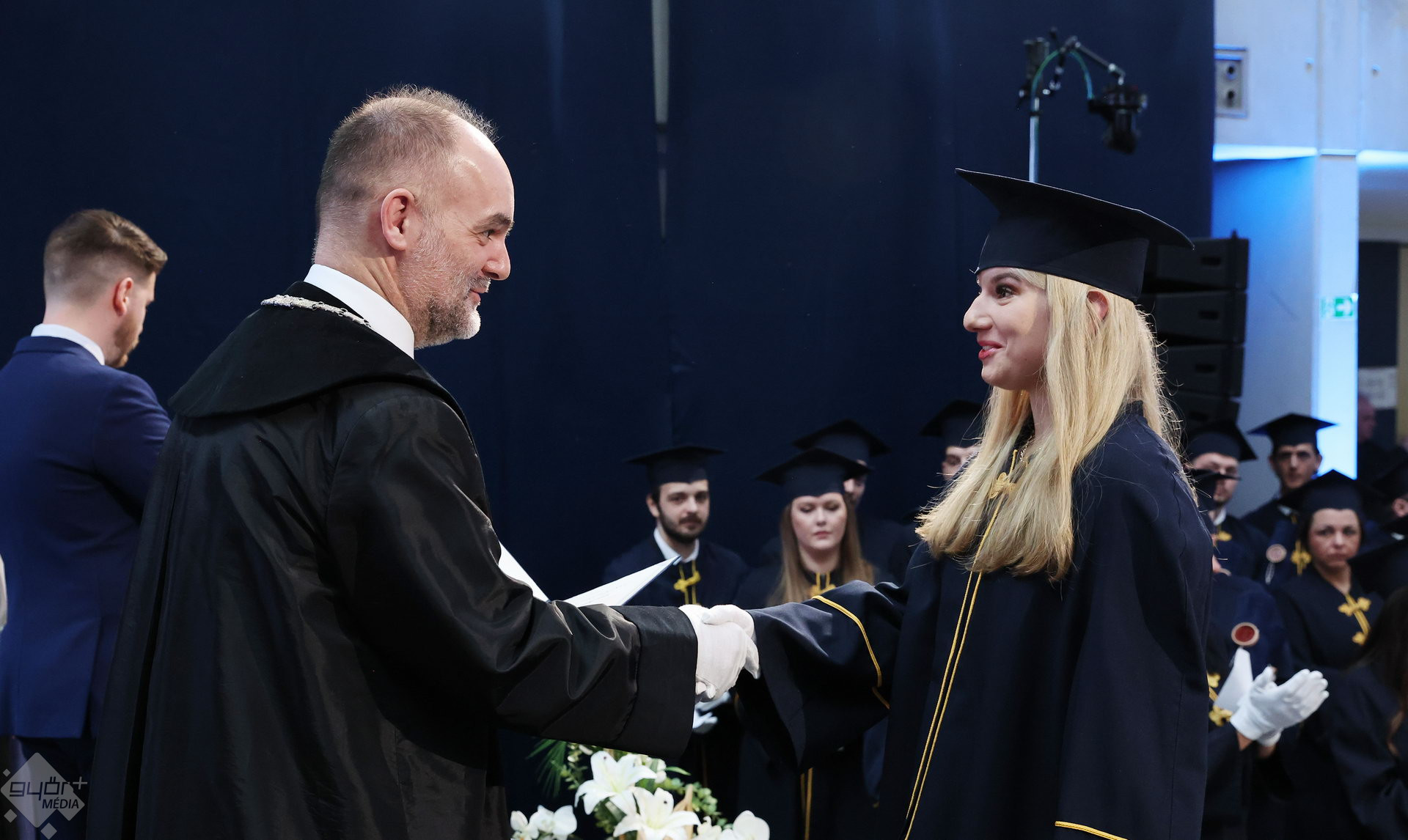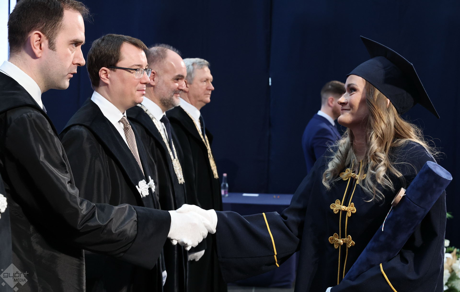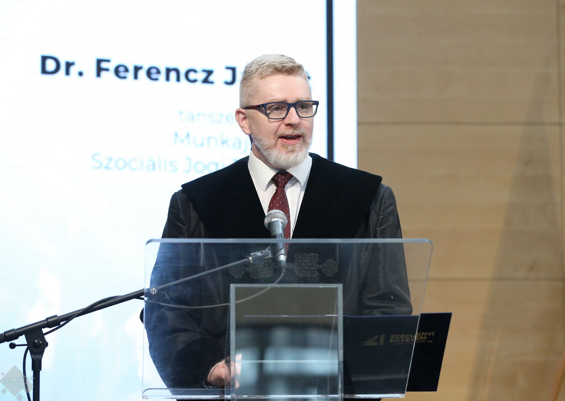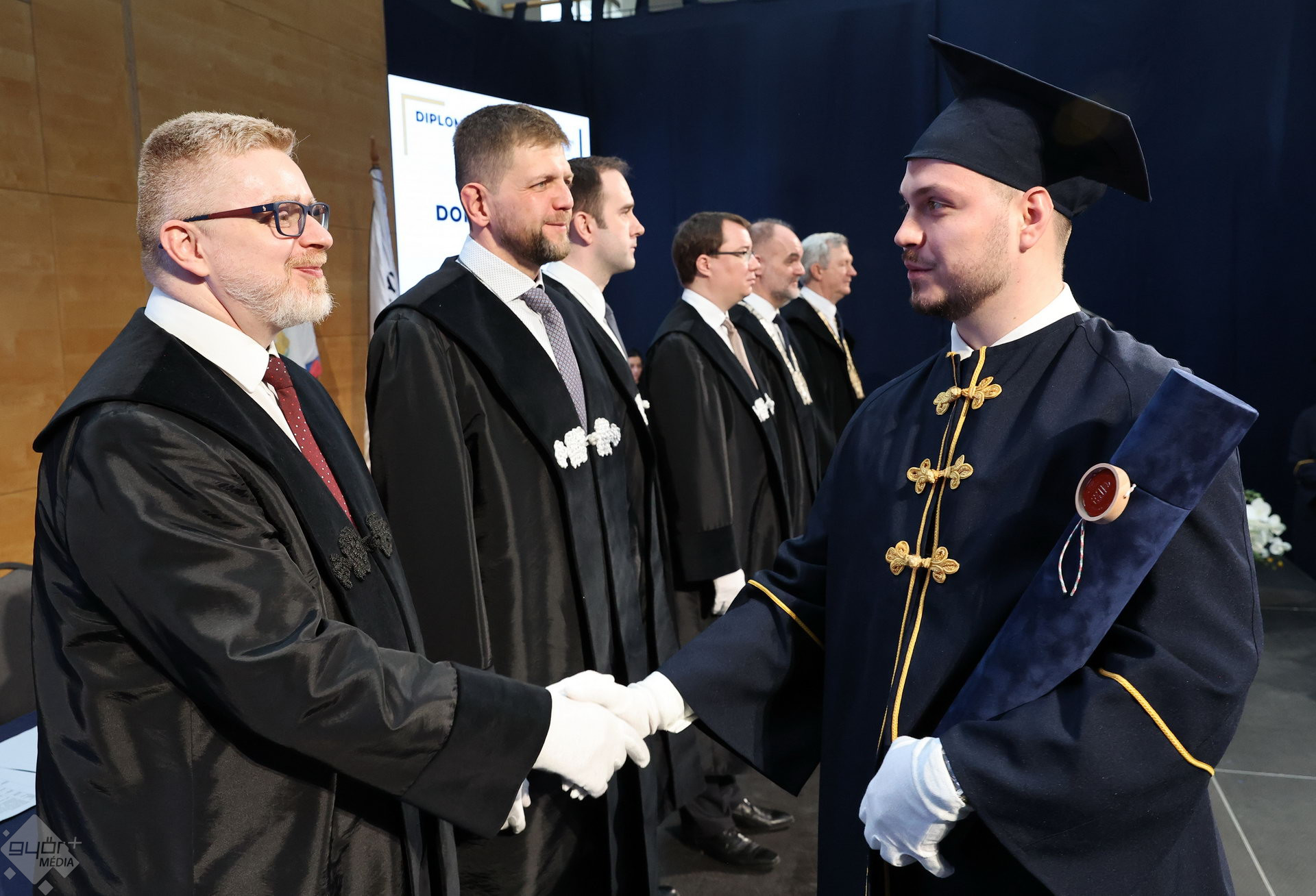 A Széchenyi István Egyetemen elnökségének bevonulásával kezdődött a ceremónia. A végzős hallgatókat Dr. Ferencz Jácint, a munkajogi és szociális jogi tanszék vezetője köszöntötte. Az egyetemi docens kiemelte: „a papír amire diplomájukat nyomtatták tudásuk pillanatnyi állapotát mutatja. Útravalónak megfelelő, de önmagában nem lesz elegendő ahhoz, hogy boldogulni tudjanak az életben. Ezért a diploma birtoklásánál sokkal fontosabb, ami a papír mögött van. Vagyis mind az a tudást és képesség, amit igyekeztünk átadni önöknek.”