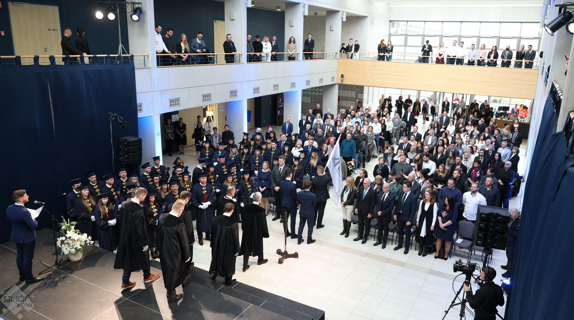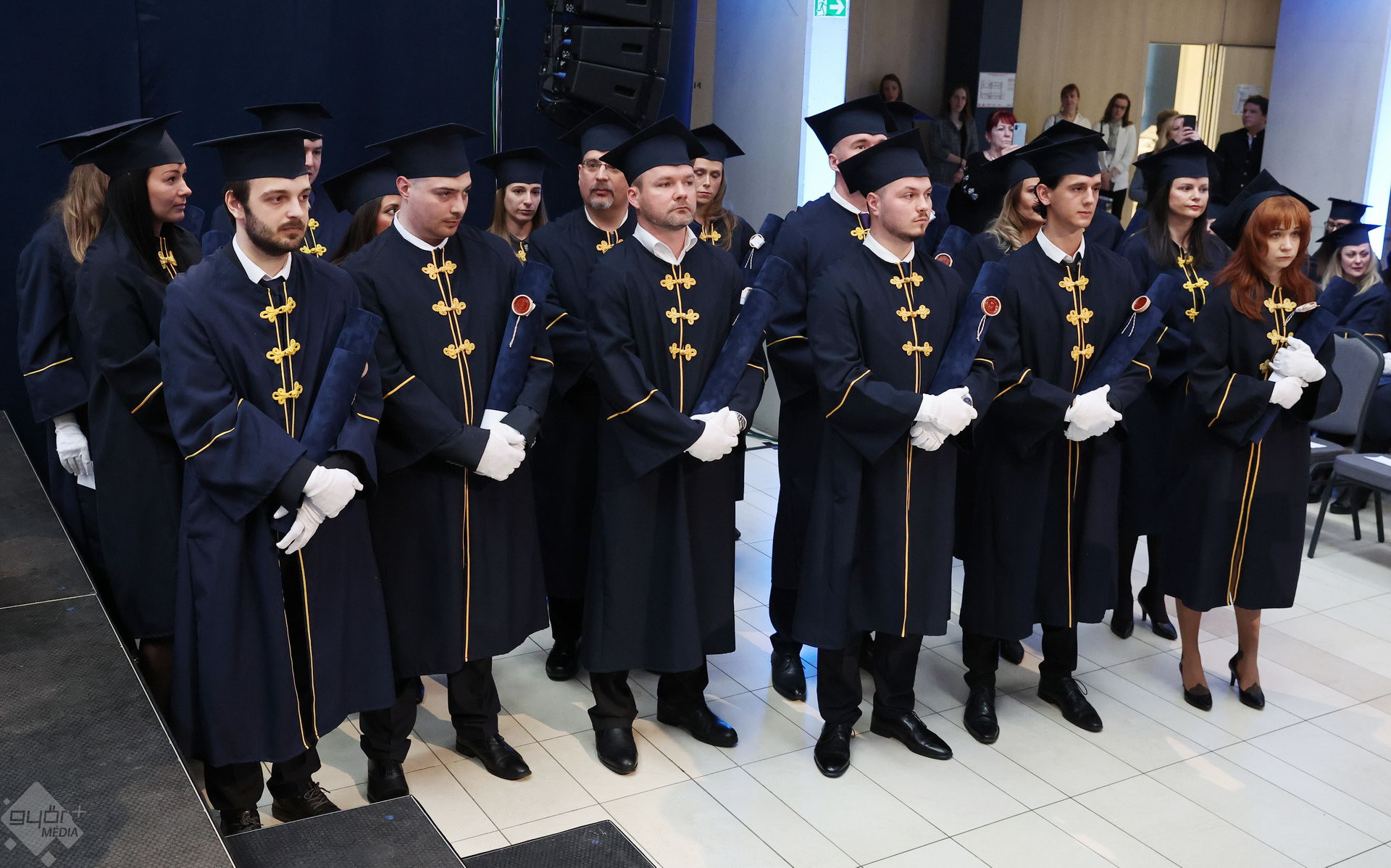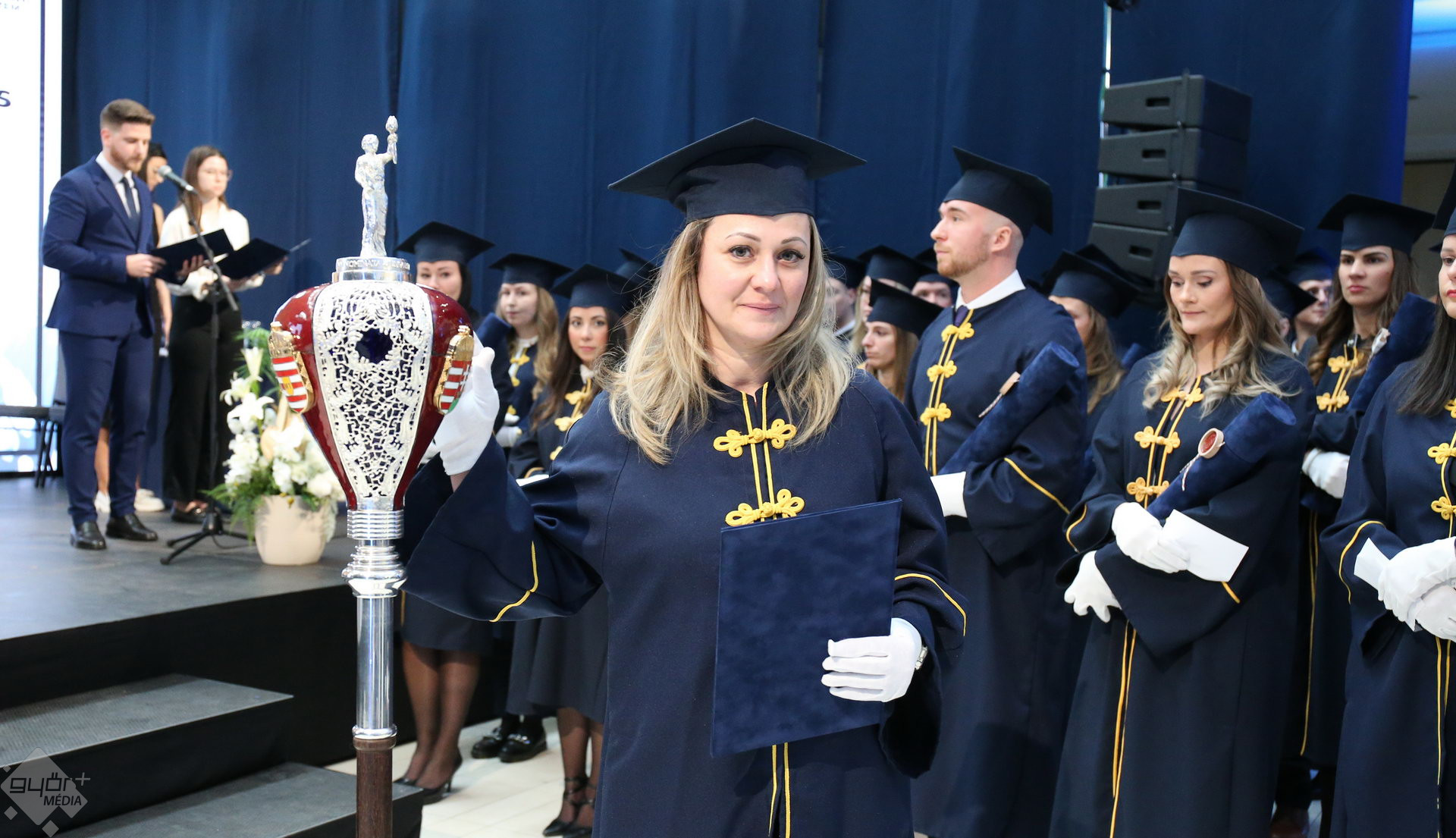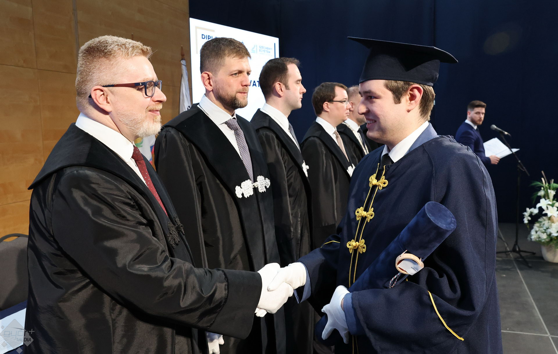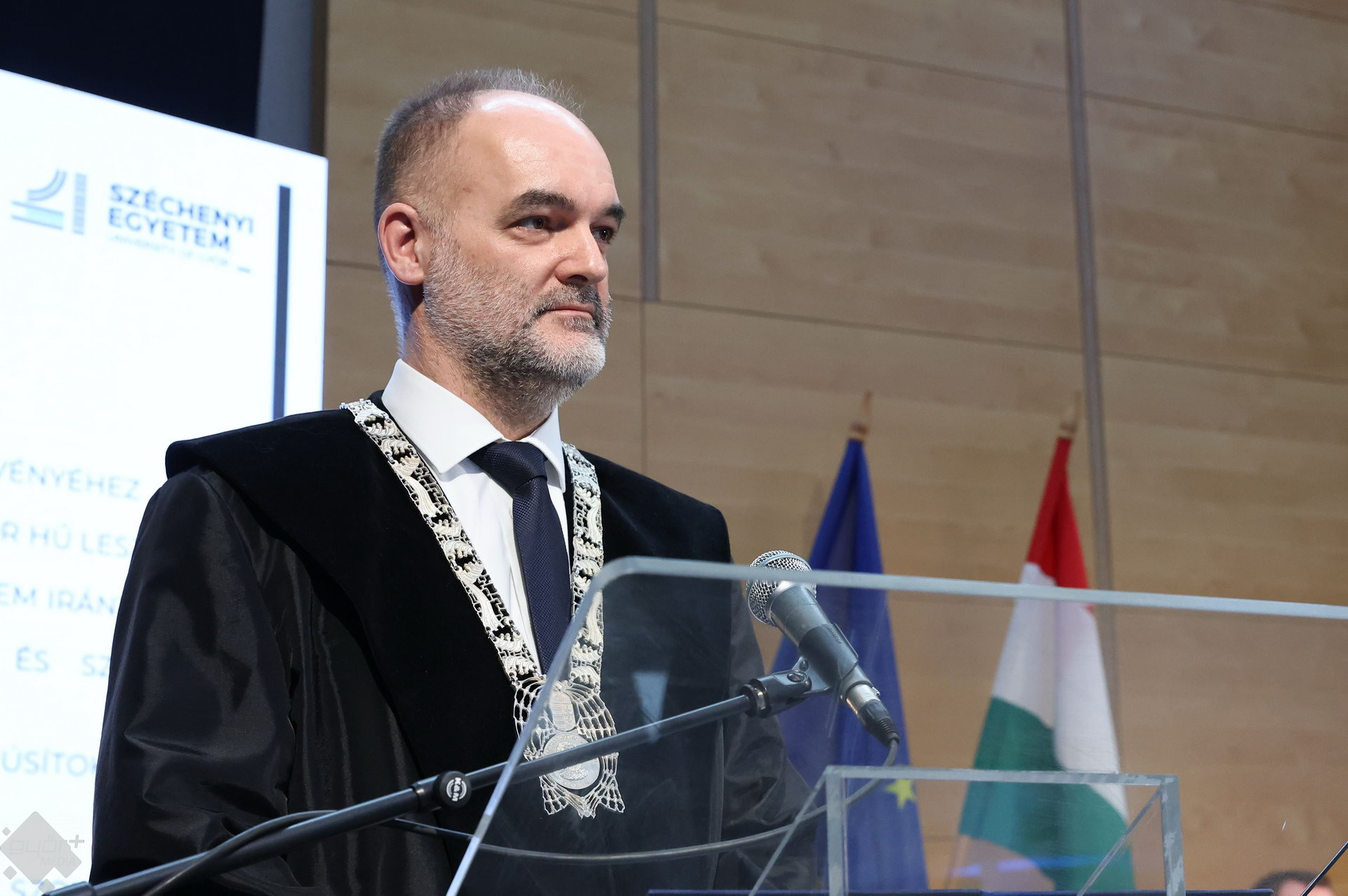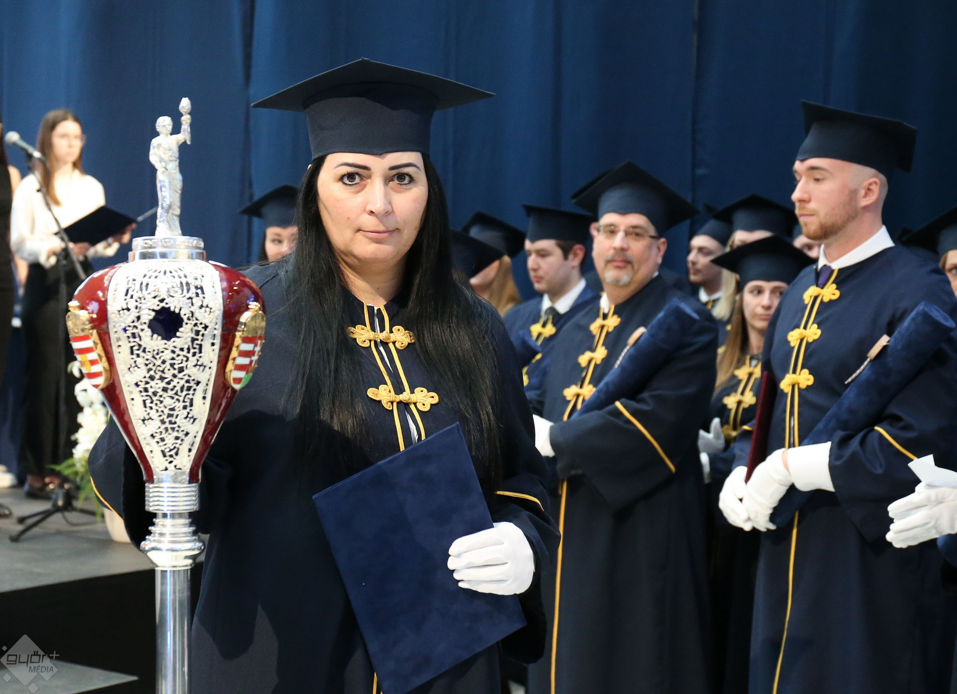 A Széchenyi István Egyetemen elnökségének bevonulásával kezdődött a ceremónia. A végzős hallgatókat Dr. Ferencz Jácint, a munkajogi és szociális jogi tanszék vezetője köszöntötte. Az egyetemi docens kiemelte: „a papír amire diplomájukat nyomtatták tudásuk pillanatnyi állapotát mutatja. Útravalónak megfelelő, de önmagában nem lesz elegendő ahhoz, hogy boldogulni tudjanak az életben. Ezért a diploma birtoklásánál sokkal fontosabb, ami a papír mögött van. Vagyis mind az a tudást és képesség, amit igyekeztünk átadni önöknek.”