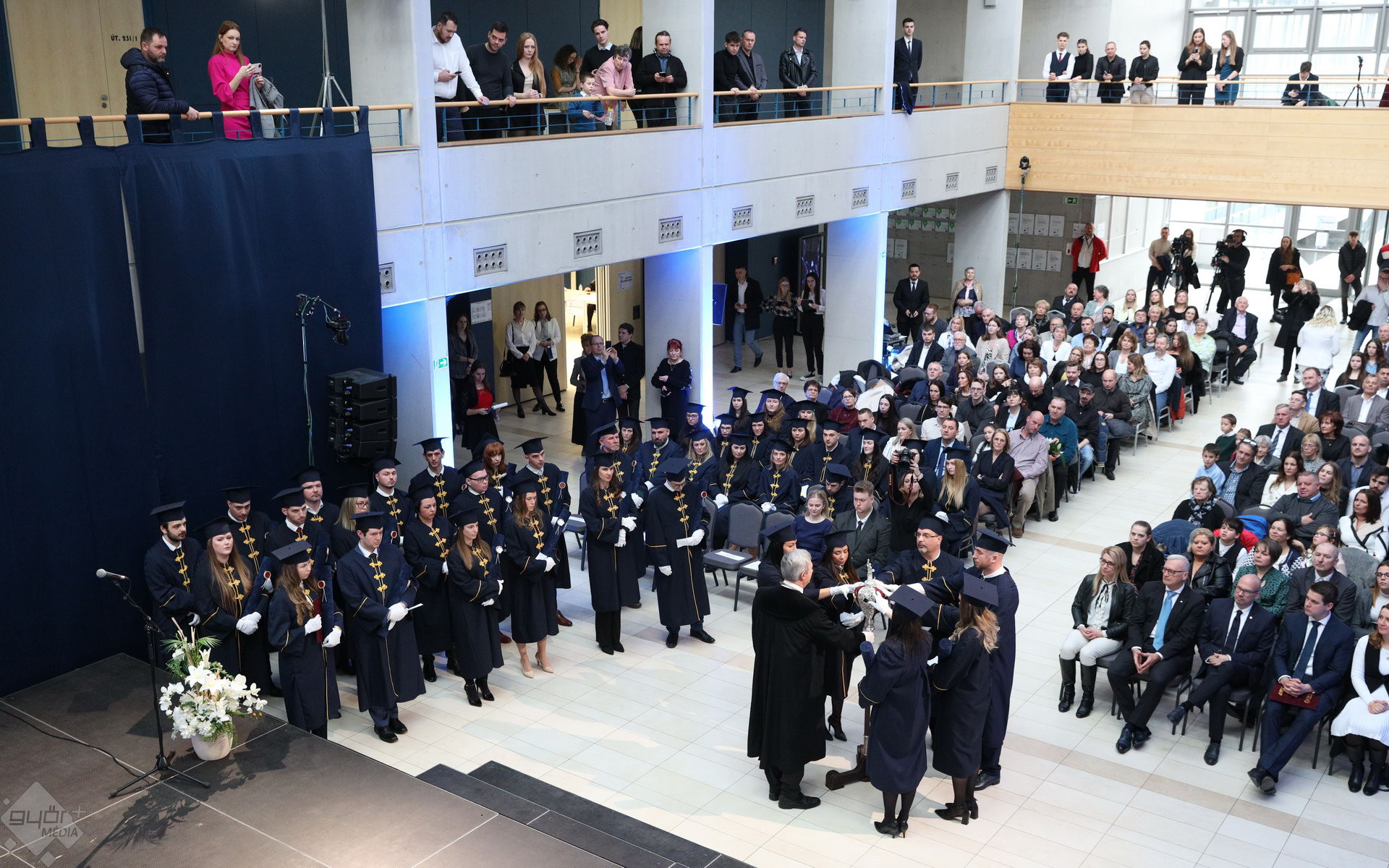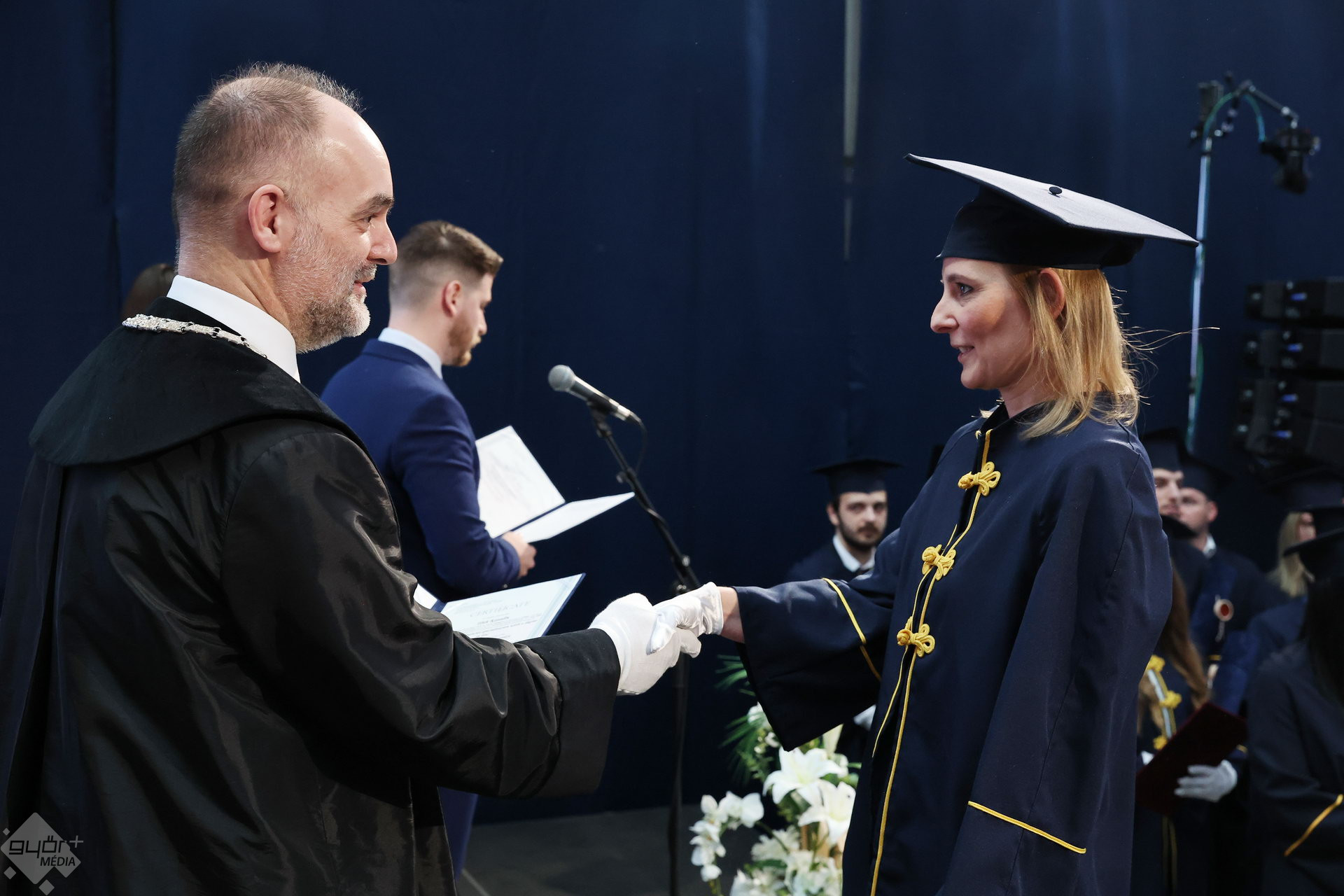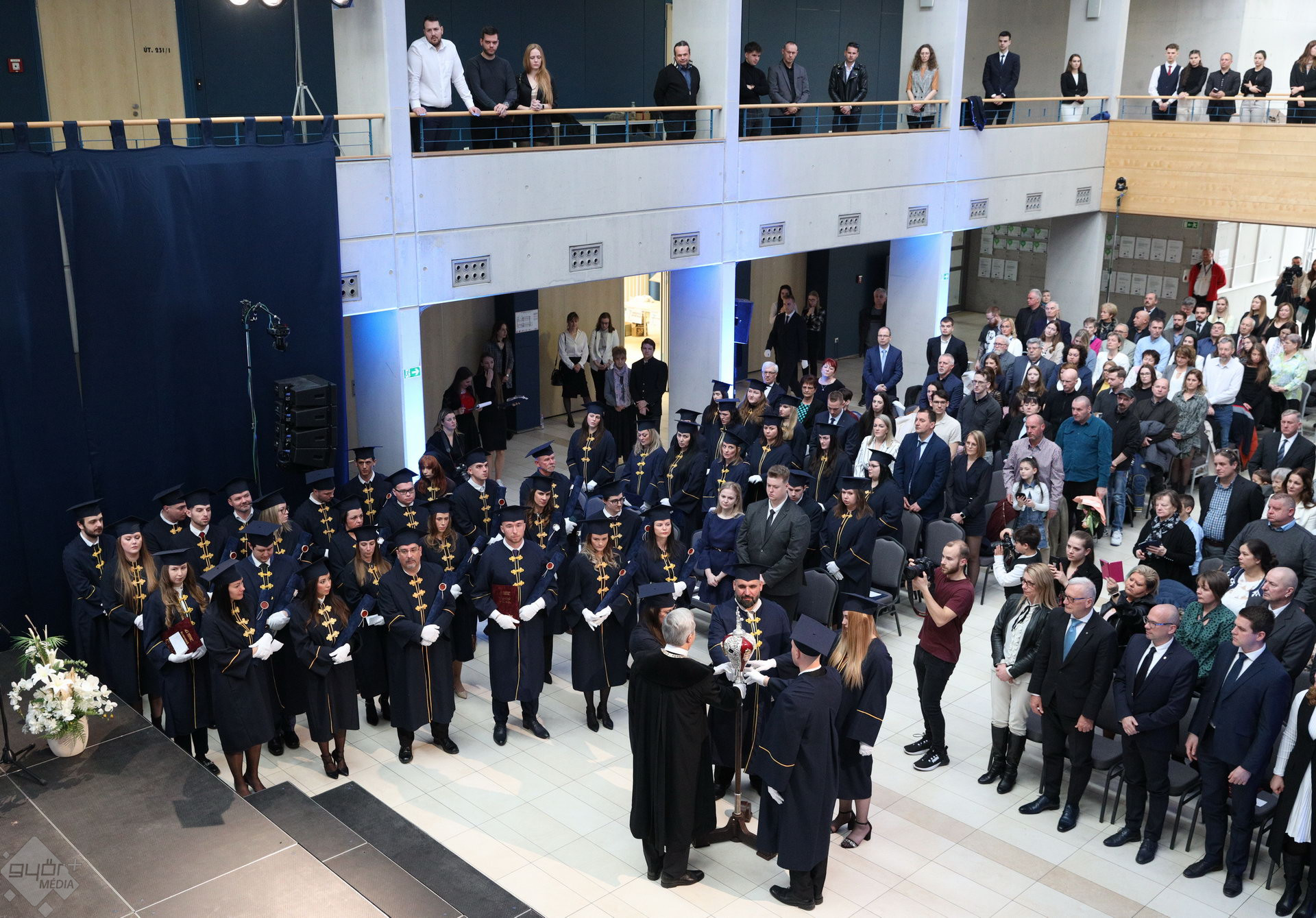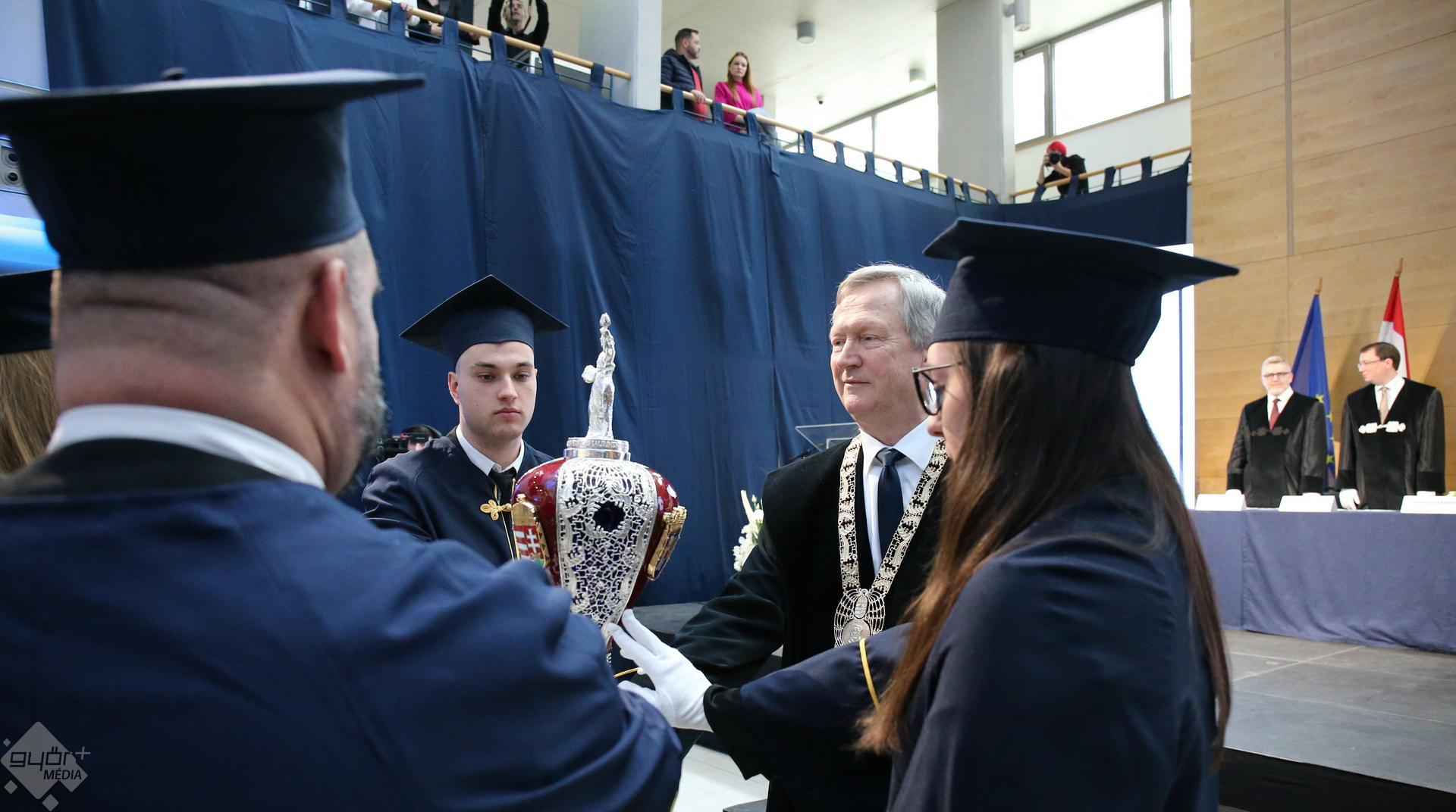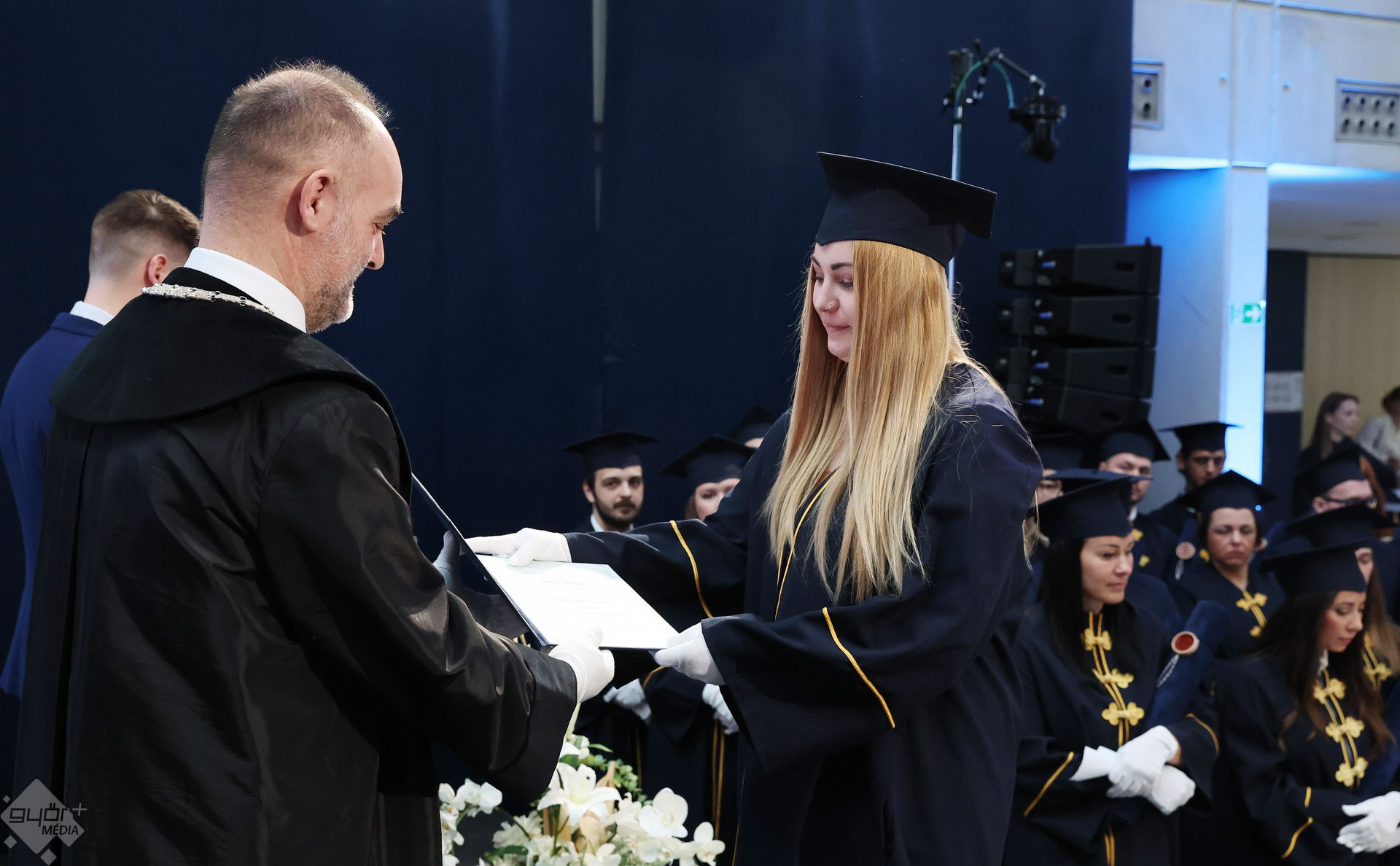 A Széchenyi István Egyetemen elnökségének bevonulásával kezdődött a ceremónia. A végzős hallgatókat Dr. Ferencz Jácint, a munkajogi és szociális jogi tanszék vezetője köszöntötte. Az egyetemi docens kiemelte: „a papír amire diplomájukat nyomtatták tudásuk pillanatnyi állapotát mutatja. Útravalónak megfelelő, de önmagában nem lesz elegendő ahhoz, hogy boldogulni tudjanak az életben. Ezért a diploma birtoklásánál sokkal fontosabb, ami a papír mögött van. Vagyis mind az a tudást és képesség, amit igyekeztünk átadni önöknek.”