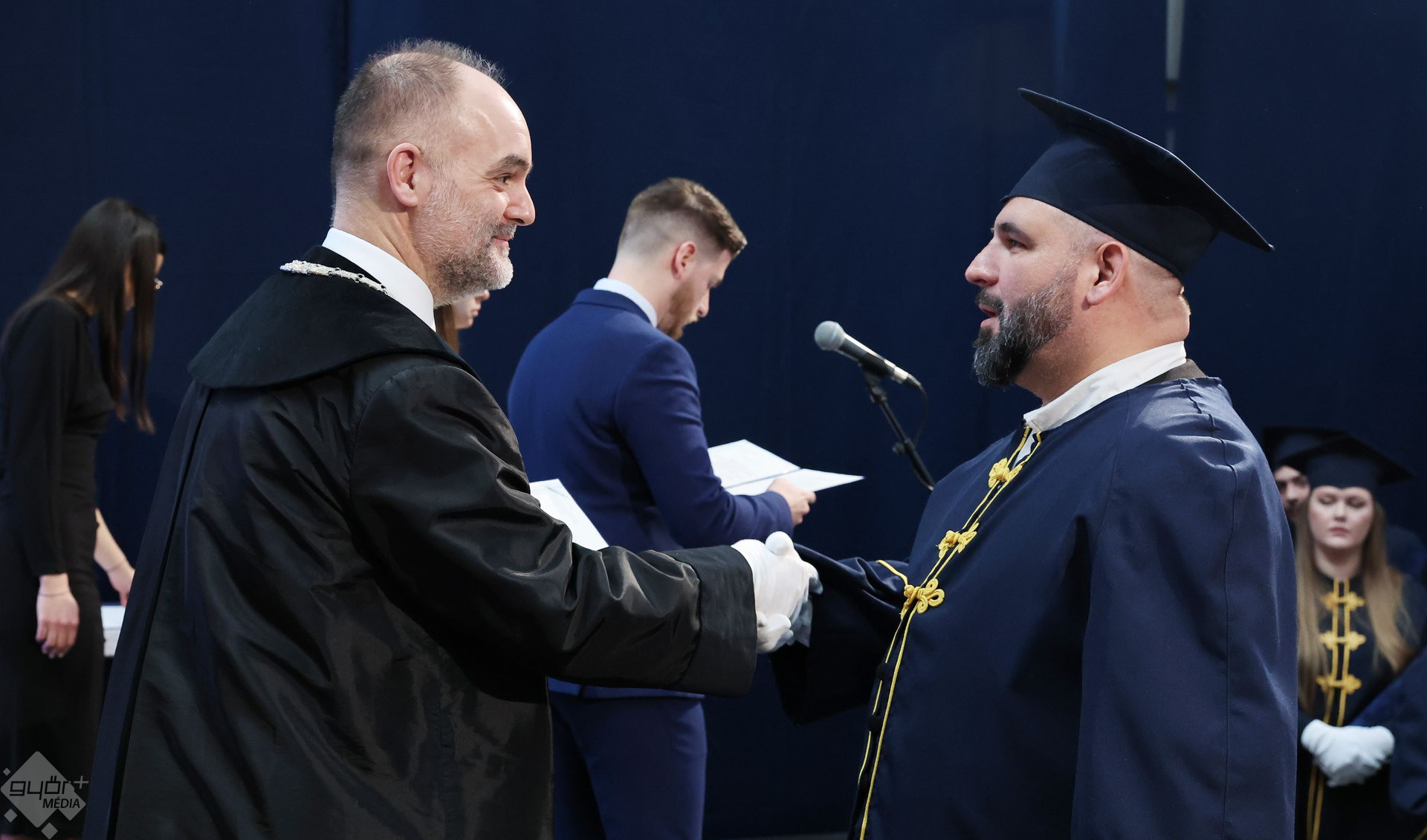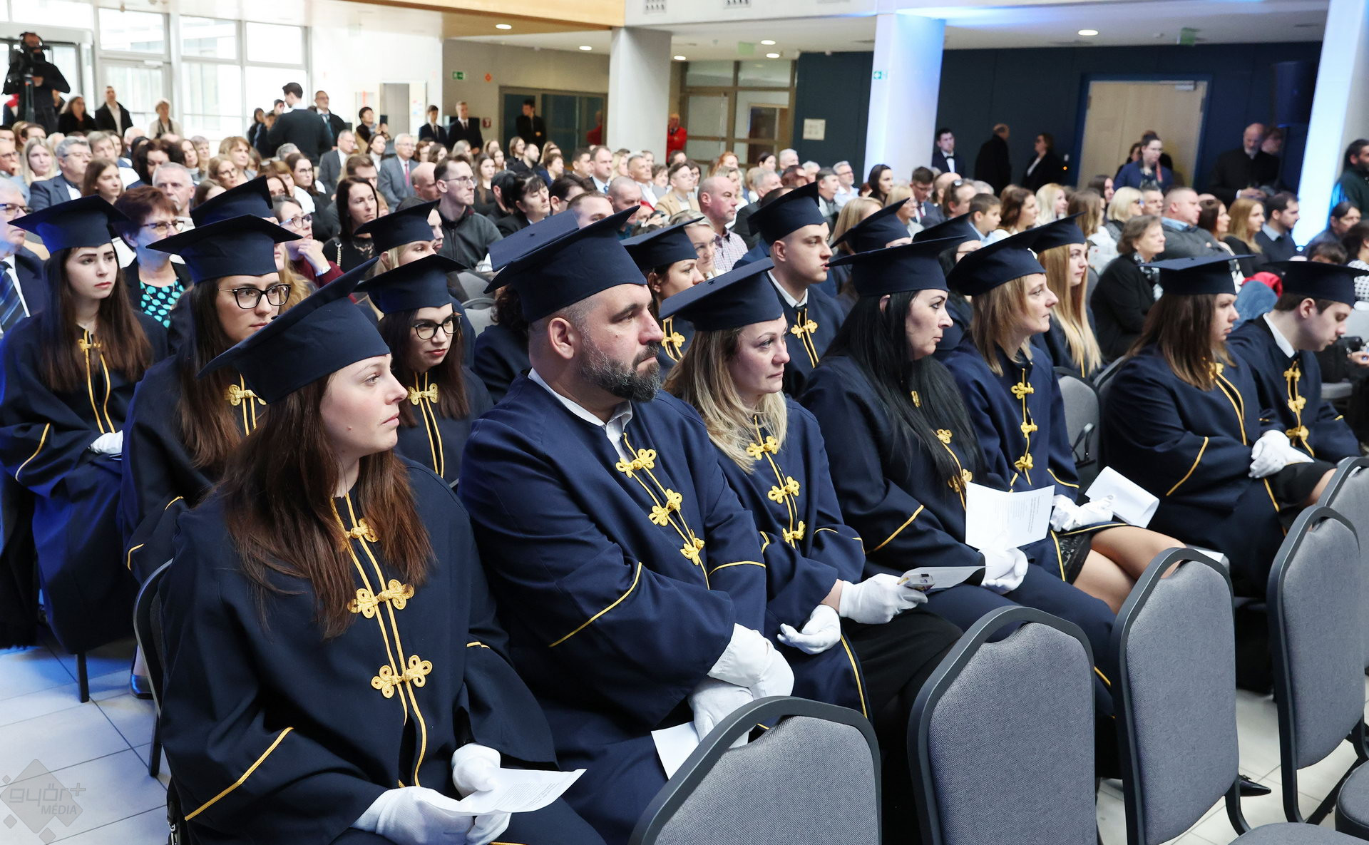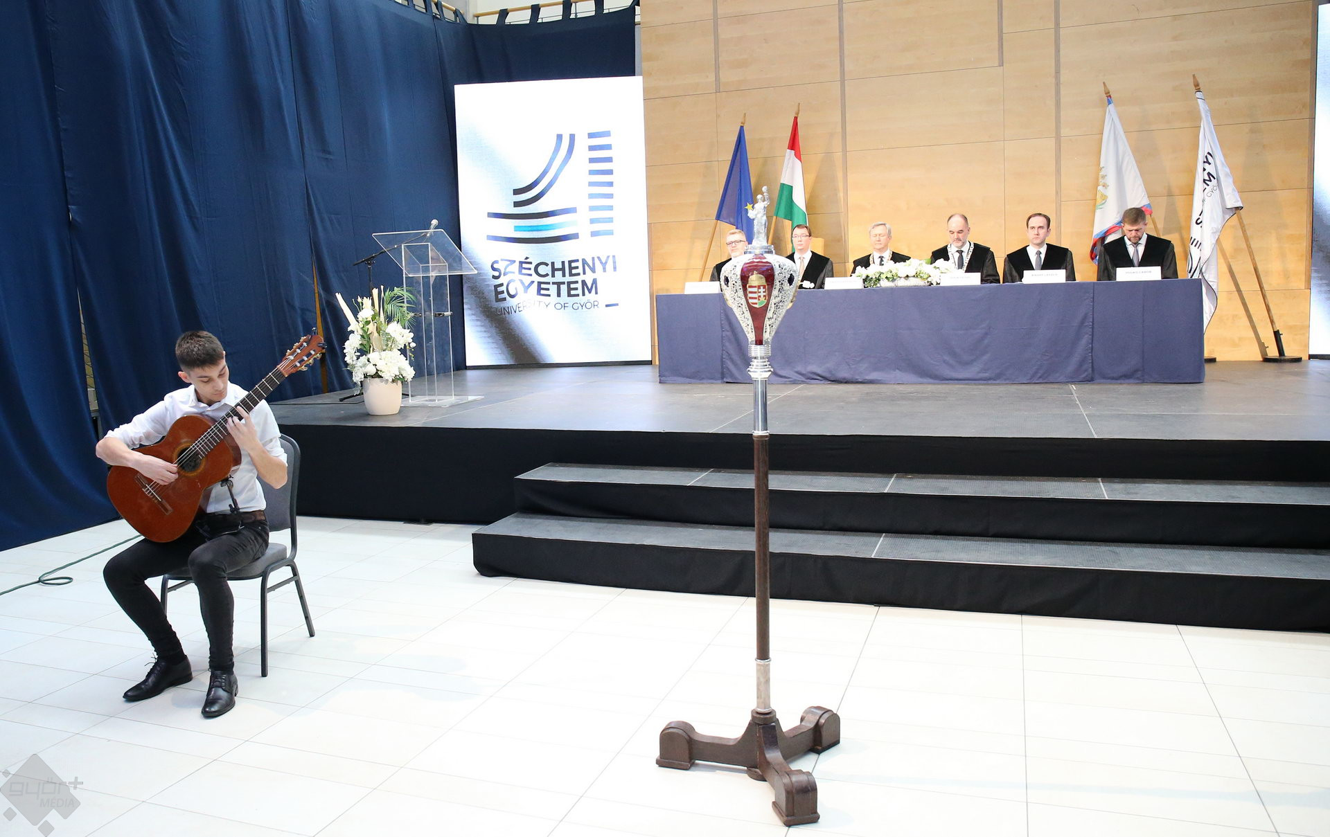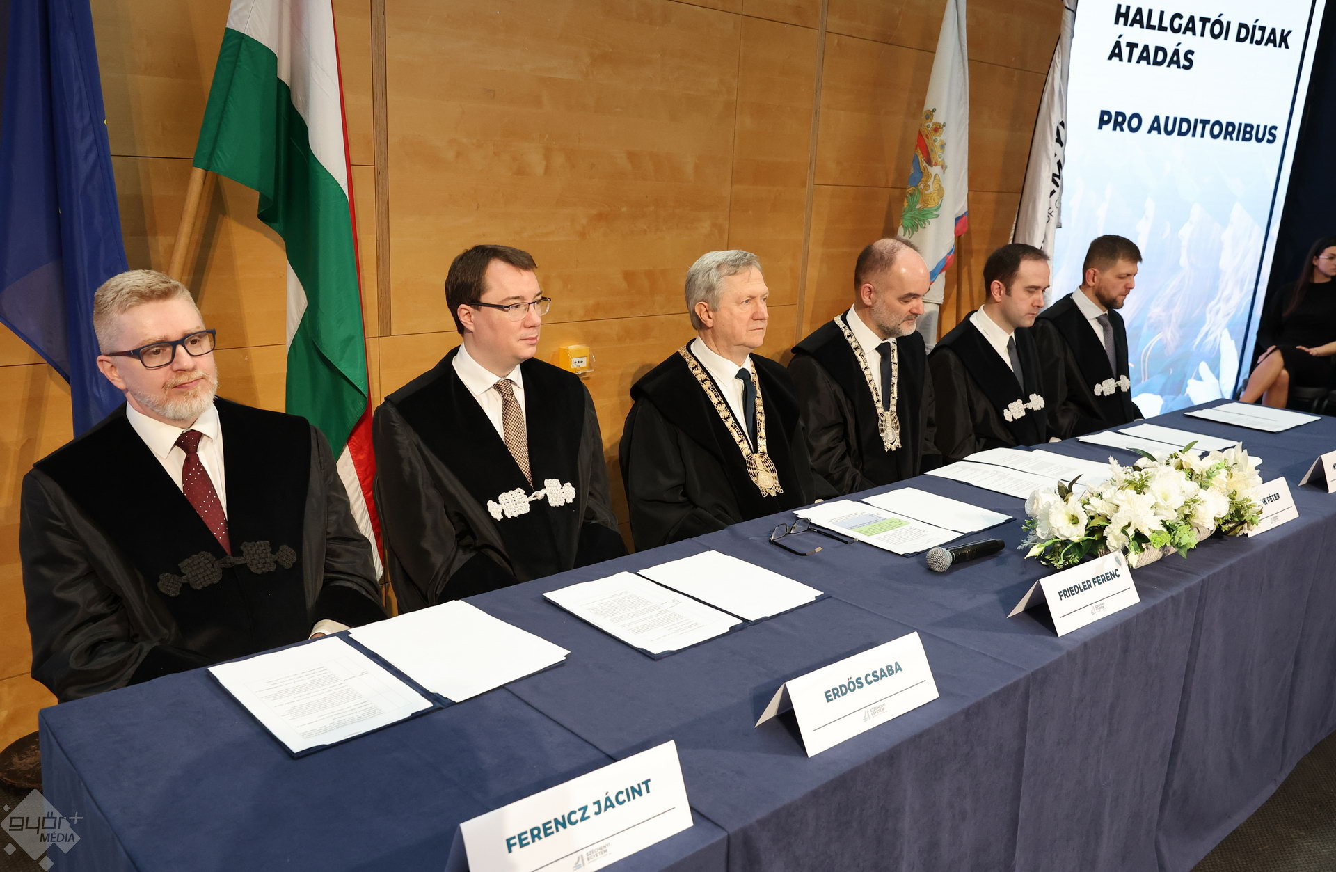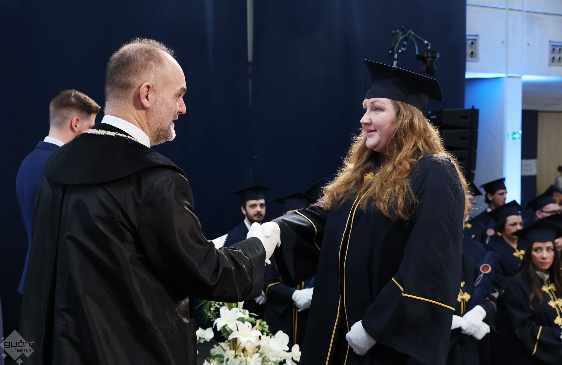 A Széchenyi István Egyetemen elnökségének bevonulásával kezdődött a ceremónia. A végzős hallgatókat Dr. Ferencz Jácint, a munkajogi és szociális jogi tanszék vezetője köszöntötte. Az egyetemi docens kiemelte: „a papír amire diplomájukat nyomtatták tudásuk pillanatnyi állapotát mutatja. Útravalónak megfelelő, de önmagában nem lesz elegendő ahhoz, hogy boldogulni tudjanak az életben. Ezért a diploma birtoklásánál sokkal fontosabb, ami a papír mögött van. Vagyis mind az a tudást és képesség, amit igyekeztünk átadni önöknek.”