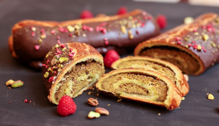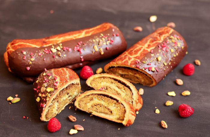 A tésztát a hűtés után kétszer tojásfehérjével kenjük át, hogy szép márványos legyen. A bejgli oldalait villával megszurkáljuk, hogy ne repedjen ki. Ezután 20 percig 180 fokon, majd újabb 20 percig 150 fokon készre sütjük. A kihűlt bejgli egyik oldalát olvasztott csokoládéba mártjuk, és végül pisztáciával és a maradék liofilizált málnával megszórjuk. Jó étvágyat kívánunk!
