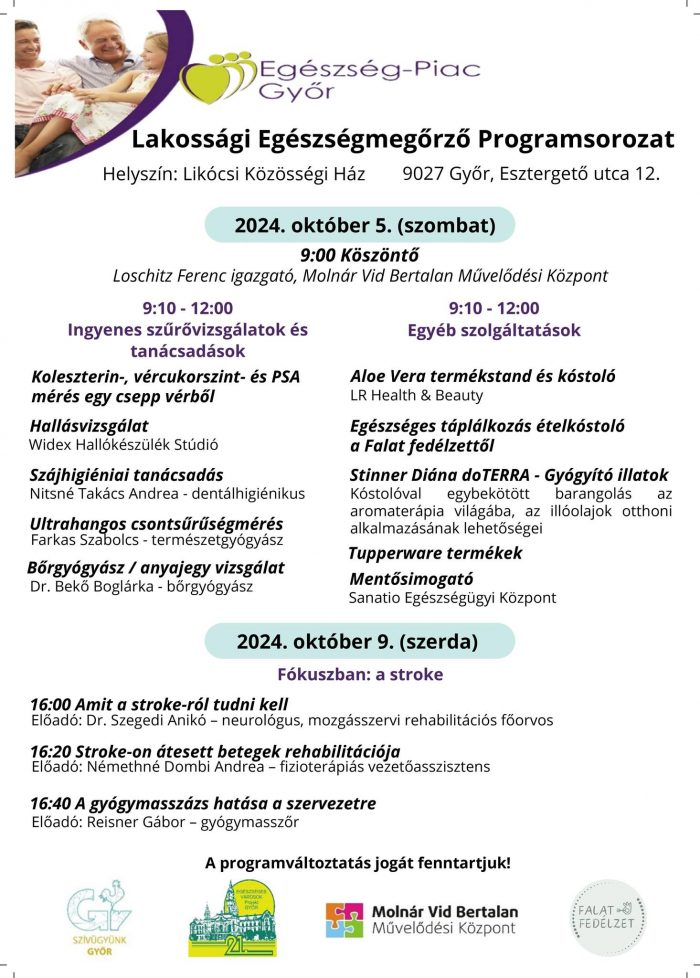 Október 5-én ingyenes egészségügyi szűrővizsgálatokra várják a győrieket a Likócsi Közösségi Házban, az Esztergető utca 12. szám alatt.