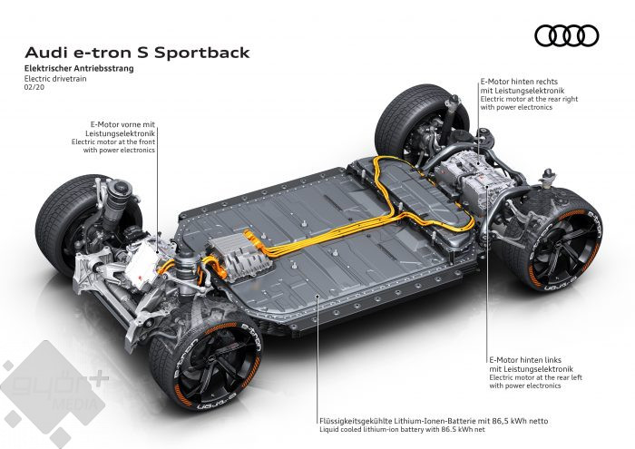 Az Audi e-tron és az Audi e-tron Sportback modellek S változatát három győri elektromos motor hajtja, amelyek közül kettő a hátsó tengelyen helyezkedik el. Az erőforrások együttes teljesítménye 320 kilowatt, amely boost üzemmódban átmenetileg akár 370 kilowatt is lehet és 973 newtonméter maximális forgatónyomaték állhat a vezető rendelkezésére. Ennek köszönhetően mindkét elektromos hajtású modell 4,5 másodperc alatt gyorsul álló helyzetből 100 km/h sebességre. Az intelligens hajtásszabályozás nemcsak a menetbiztonságot, hanem a menetdinamikát is új szintre emeli, hiszen a hátsó kerekek egymástól függetlenül is meghajthatók. Az elektromos összkerék-meghajtáshoz elektromos vektoros nyomaték-szabályozás (Torque Vectoring) társul, aktív és teljesen változtatható nyomaték-elosztással a hátsó tengelyen.