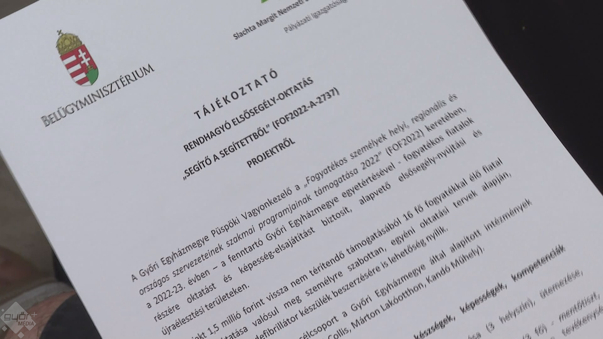 Rendhagyó elsősegély-oktatáson vehetnek részt a fogyatékkal élők. A Győri Egyházmegye Püspöki Vagyonkezelő, a Belügyminisztérium és a Slachta Margit Nemzeti Szociálpolitikai Intézet támogatásával, 1,5 millió forint összegből, pszichológusok és mentőtisztek segítségévek elsősegély-nyújtási és újraélesztési tanfolyamokat szervez 16 fogyatékkal élő fiatal számára.