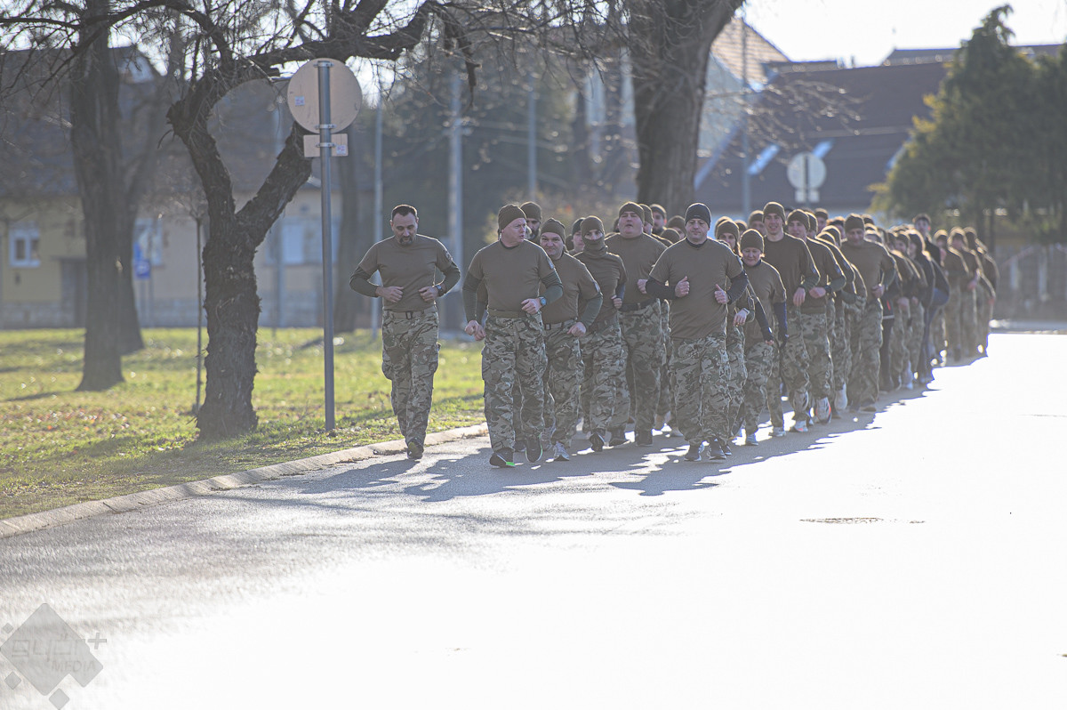 A bemelegítés után pedig következett a – nem véletlenül – 2026 méteres kötelékfutás, amely a katonák életében fontos mozgásforma. Lényege, hogy együtt, olyan tempóban teljesítsék a meghatározott távot, hogy az egység – ezred, század, szakasz – alakzatai ne szakadjanak szét, és lehetőleg egy ütemben haladjanak.