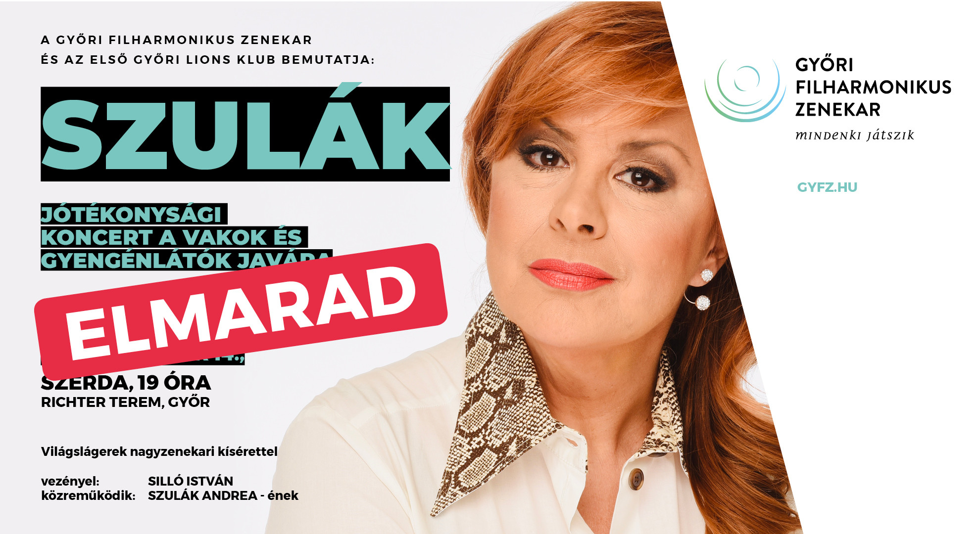 Az Első Győri Lions Klub és a Győri Filharmonikus Zenekar ezúton tájékoztatja közönségét, hogy a 2020. október 14-re meghirdetett „Szulák – Jótékonysági koncert” a járványügyi okok miatt kialakult helyzetre való tekintettel elmarad.