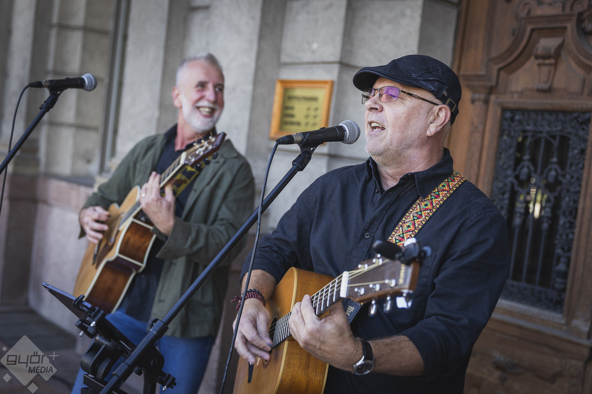 Jáger András és Szabó Balázs, a Győri Nemzeti Színház művészei varázsoltak kellemes hangulatot a térre, akik rendhagyó módon zenés, könnyed mozgással  készítették fel a népes csapatot a sétára. A bemelegítés után elindult a társaság , hogy a Városház térről  a Baross utca, a Király utca, a Dunakapu tér, és a Kossuth-hídon keresztül eljusson a Kálóczy térig.