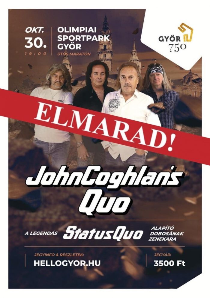 A győri Olimpiai Sportparkba, 2021. október 30-ra tervezett John Coghlan’s Quo koncert a szervezők hivatalos tájékoztatása szerint betegség miatt elmarad.