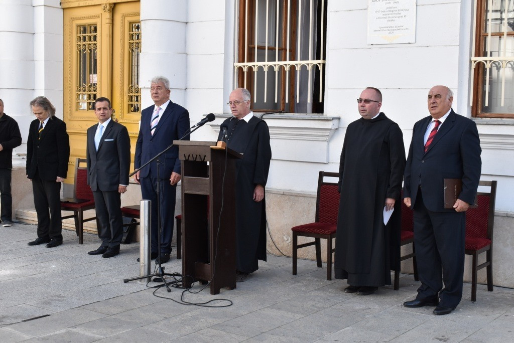 Gróf Esterházy Móric miniszterelnök porcelán emléktábláját avatták fel szombaton a Széchenyi téren álló Czuczor Gergely Bencés Gimnázium épületének falán.