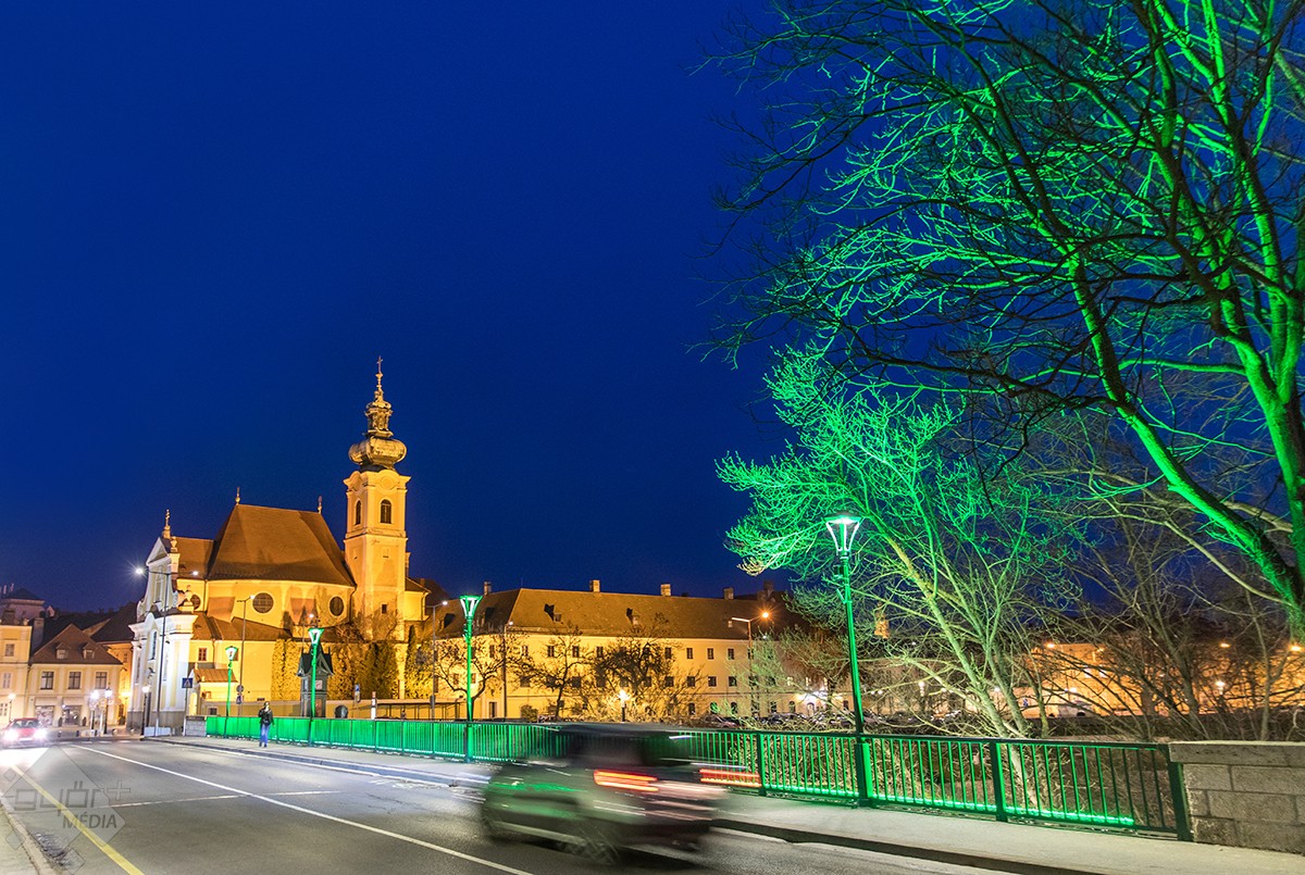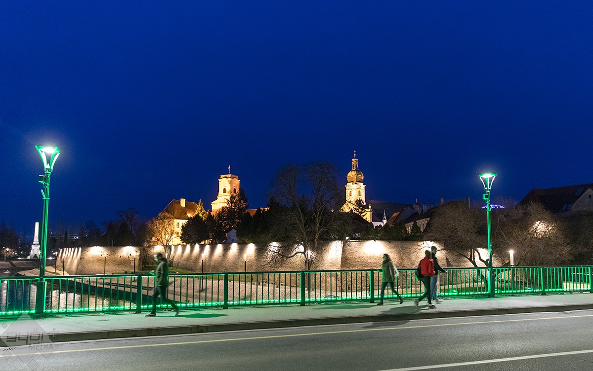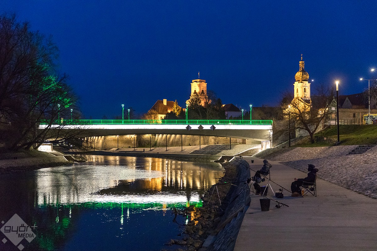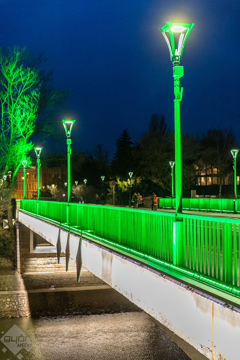 A Kossuth- és a Jedlik-híd után illő díszkivilágítást kapott a Rába-kettős híd is. A szerkezet alsó, ívelt formáját fehér, korlátjait pedig zöld fénnyel világították meg.