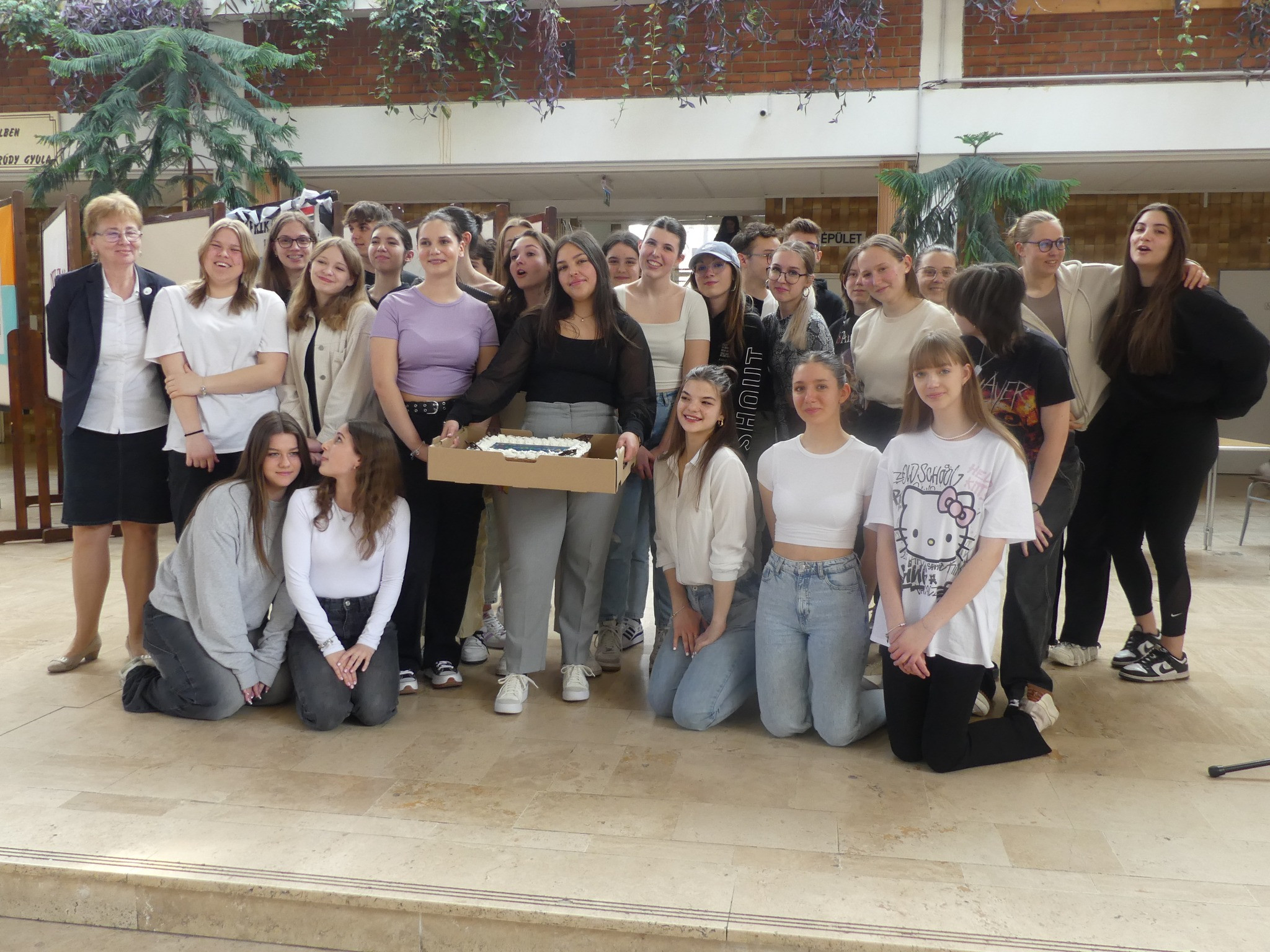 Emellett a gimnázium osztályait arra ösztönözték, hogy részt vegyenek egy barátságos versenyben, amelynek célja az volt, hogy minél több információt gyűjtsenek a különböző témákról. Az idei győztes, 9.A pedig egy ínycsiklandó Európa-Nap feliratú tortát vehetett át jutalomként. Stílszerűen mondhatjuk: a Nap és a torta is tizenkétcsillagos volt…