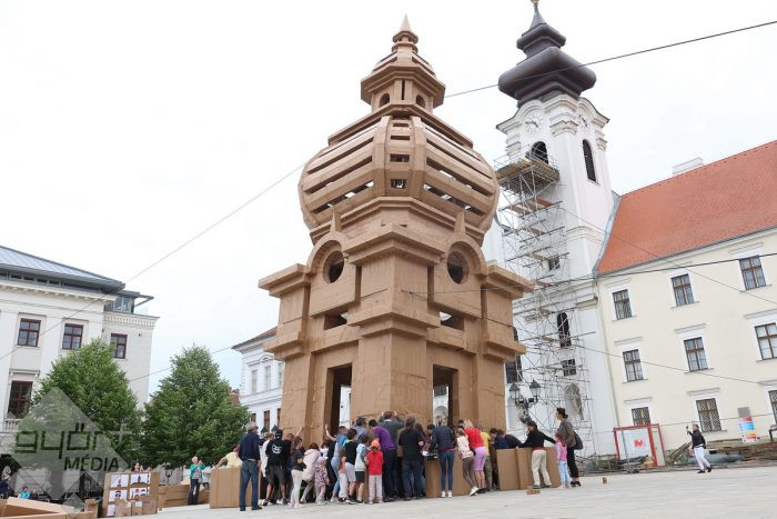 Újra állt a tűztorony! Győr egykori szimbóluma, az 1895-ben lebontott Tűztorony kelt ideiglenesen életre kartondobozokból a Széchenyi téren.