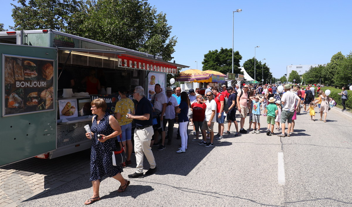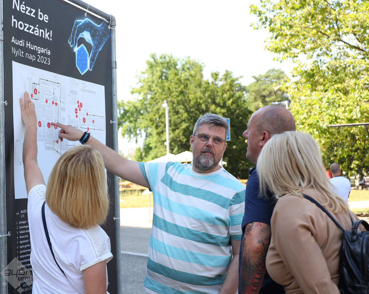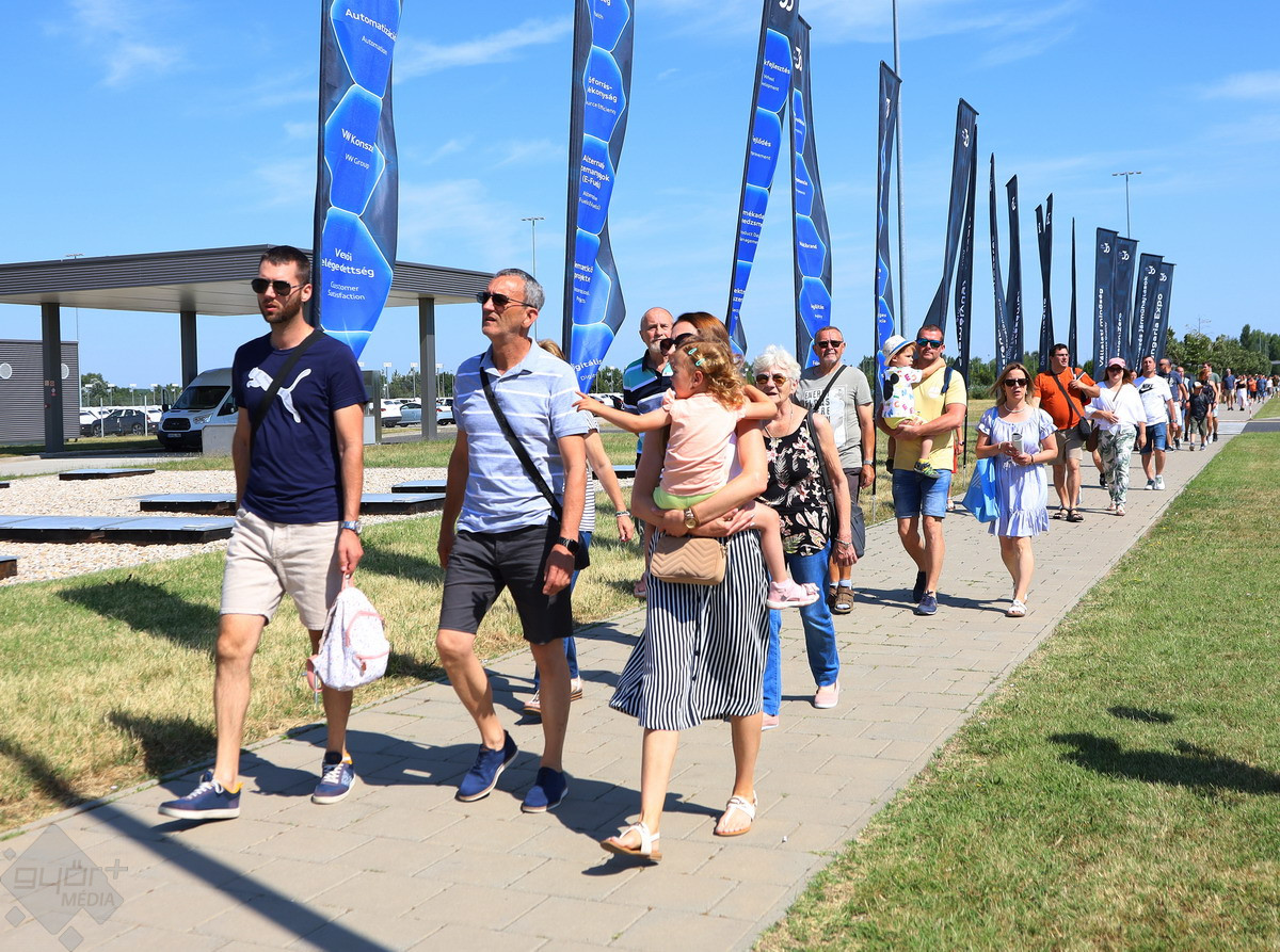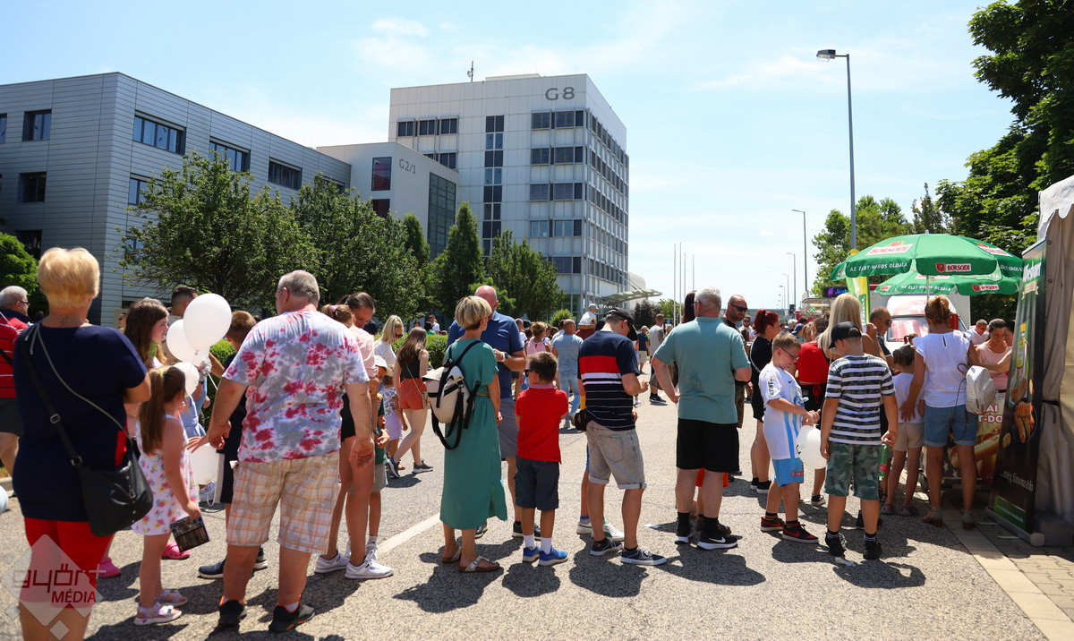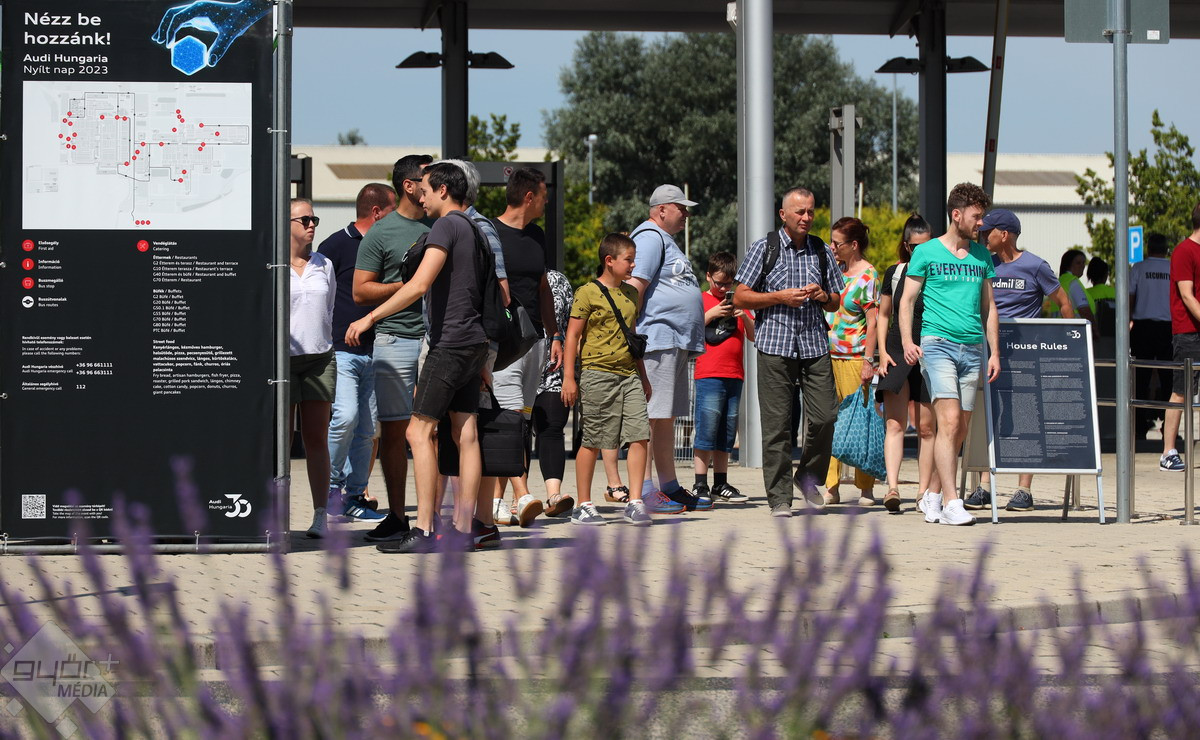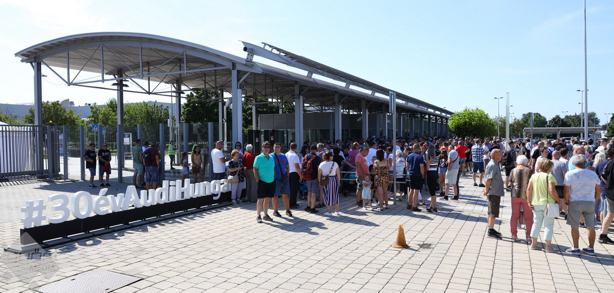 A nagy nyári hőség ellenére is ezreket - délutánra ez a szám pedig tízezrekre nőhet - vonzott az Audi Hungaria Zrt. nyílt napja. Az eseményt a vállalat 30 éves jubileuma alkalmából szervezték, így nem csak az audis dolgozók tudják családjuknak megmutatni a munkahelyüket, de bárkit szívesen látnak a szervezők.