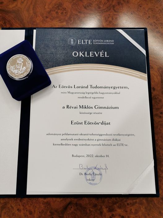 Az Eötvös Loránd Tudományegyetem Ezüst Eötvös díjat adományozott a győri Révai Miklós Gimnáziumnak. Az oklevelet a gimnázium a példamutató oktatói, tehetséggondozói tevékenységéért kapta.