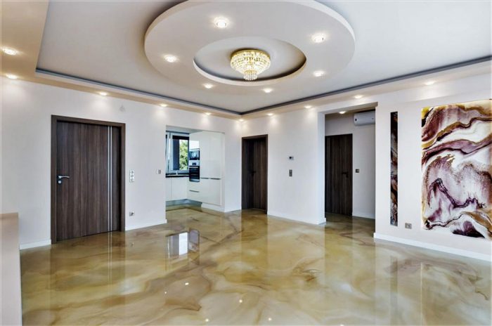 A lakásban nagy hangsúlyt fektettek a minőségre, hiszen a modern kialakítás mellett a diszkréten beépített spotlámpák, a LED fénycsíkok és az üvegkristály csillárok a lakásban a meghatározó tényezők, amely melegséggel töltik el a lakás hangulatát. A lakás egyik különlegessége a Gobetto Art Design által megálmodott és kivitelezett, fuga mentes öntött műgyanta padló. A falak is egyedi kivitelezésű műgyantás technikával dekoráltak.