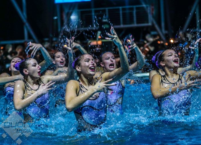 A magyar szinkronúszó válogatott sportolói a Két lépés a pokolból című film zenéjére mutattak be „pokoli” jó koreográfiát, és egy laikus számára pokoli nehéznek tűnhet megtanulni a látott vízitáncot. Händel Vízizenéje ismételten nem csak a fülnek nyújtott élvezetet, ugyanis a medence partján a Győri Balett tagjai az alkalomhoz illendő „jelmezben”, fürdőruhában táncoltak. Majd jeges utazásra vitte a zenekar a közönséget, a Titanic című film világhírű taktusai megmutatták: „Azért a víz az úr!”