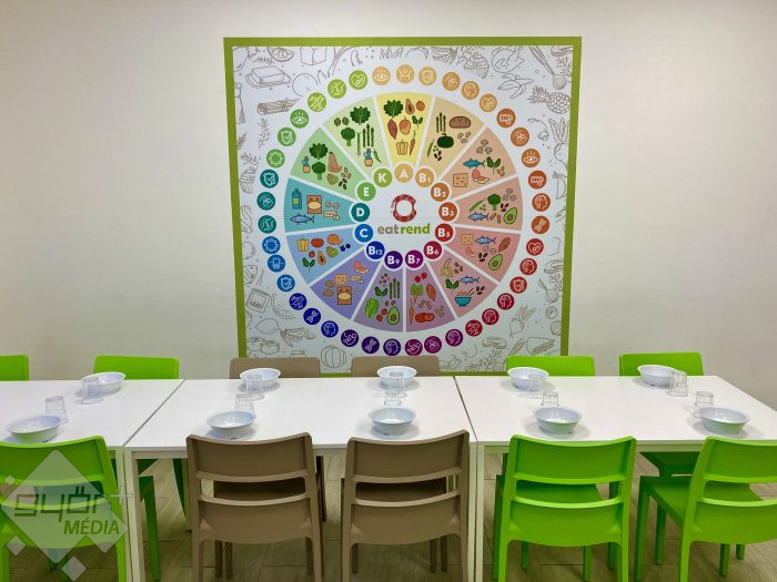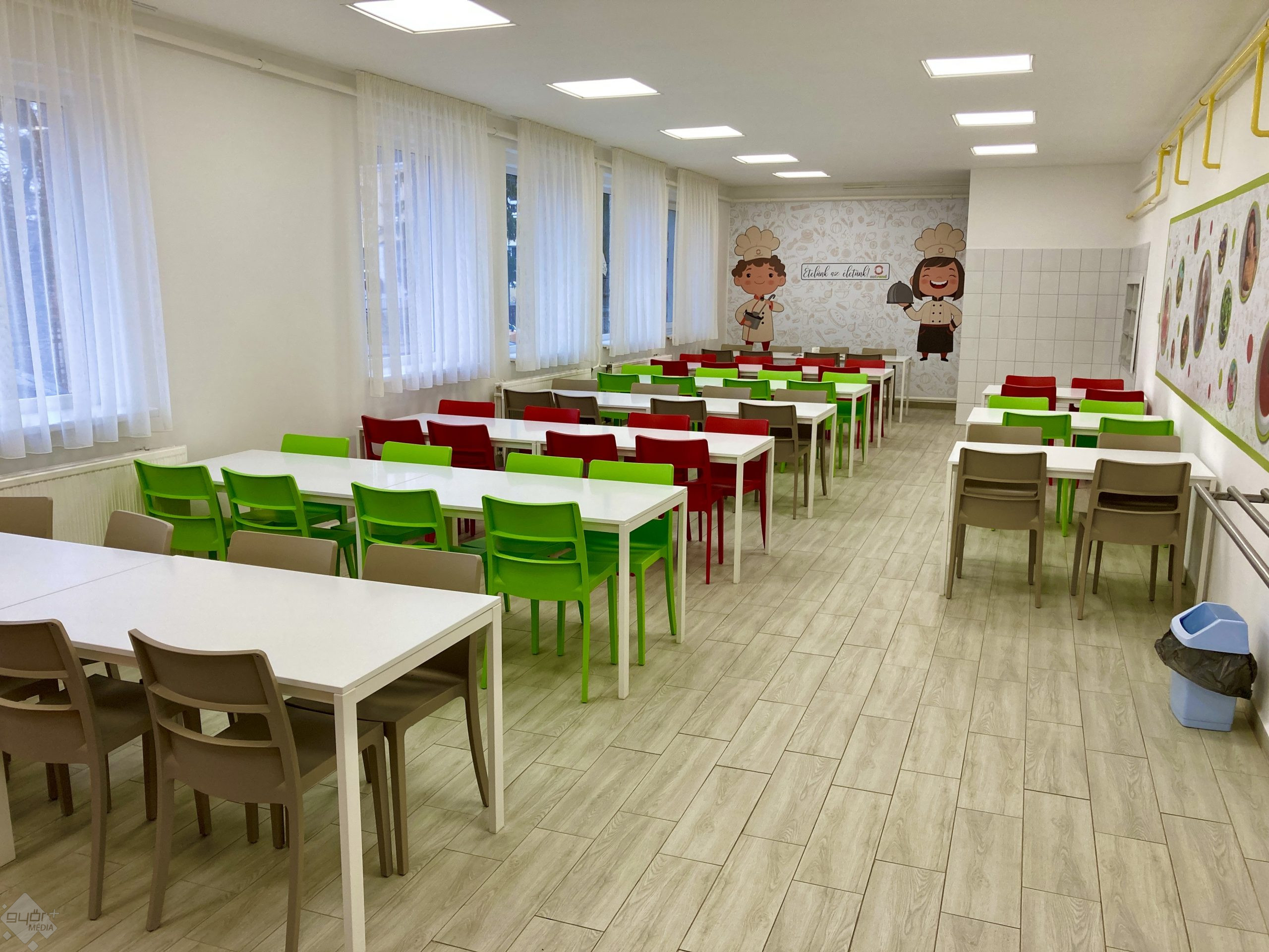 Színes székek, fehér asztalok, sokat mondó fali matricák. Modern és minden igényt kielégítő belsőt kapott az intézmény szomszédságában fekvő konyha és étkező. Több mint 600 gyermek jár a csanaki iskolába, közülük mintegy háromszázan étkeznek ebben az épületben. Az üzemeltető cégnek köszönhetően most már kulturált körülmények között tehetik.