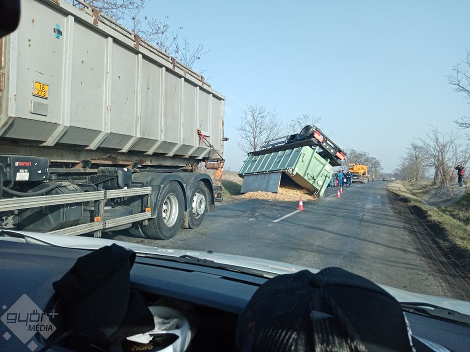 Felborult egy teherautó pótkocsija Győr és Bőny között