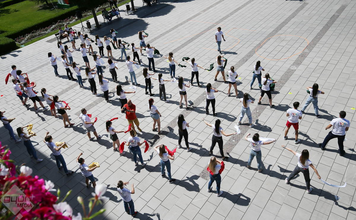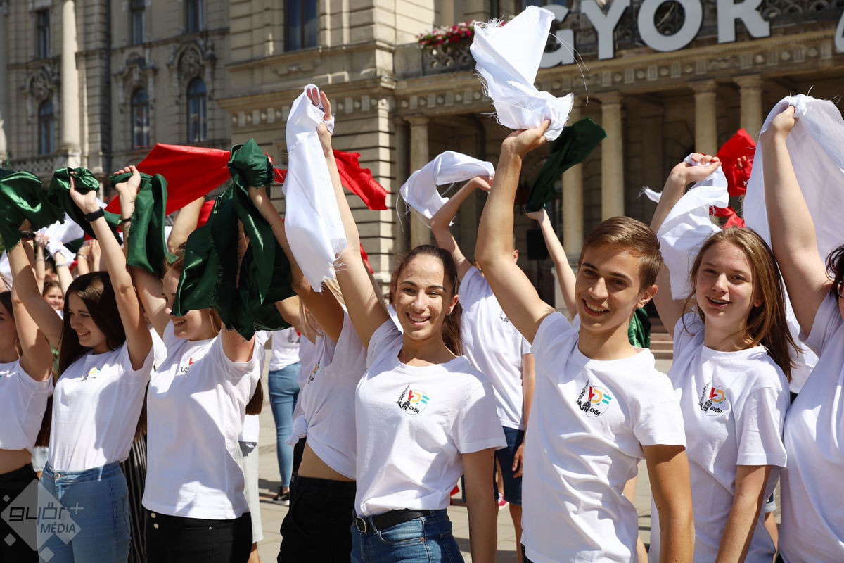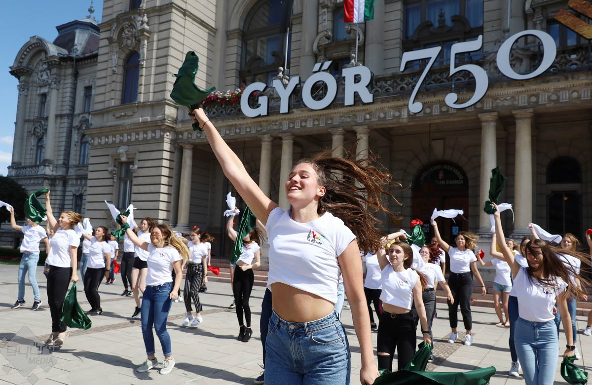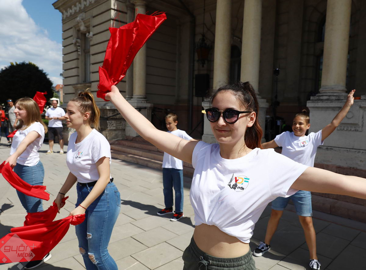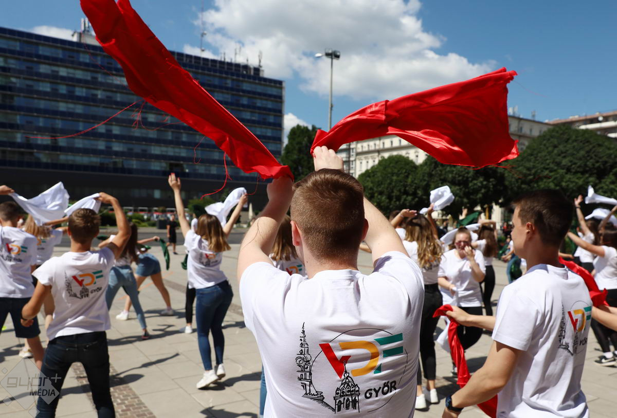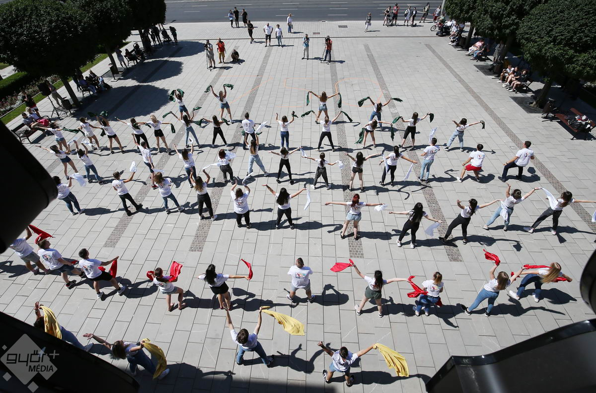 Piros, sárga, fehér és zöld zászlókkal integettek tánc közben a győri középiskolák diákjai. A Városi Diákfórum ötlete alapján készültek a villámcsődületre, közel hetvenen.