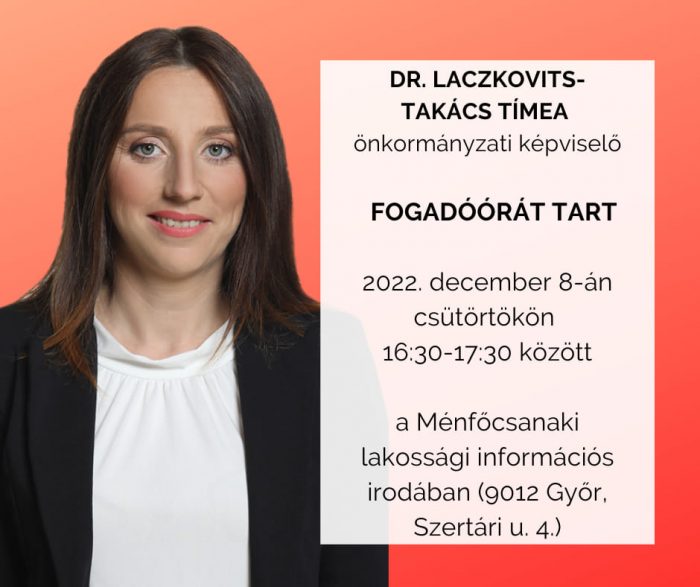 A fogadóóra helyszíne a Ménfőcsanaki lakossági információs iroda. (Cím: 9012, Győr. Szertári u. 4.). A pontos időpont pedig: 2022. december 8., (csütörtök) 16.30 és 17.30 között.