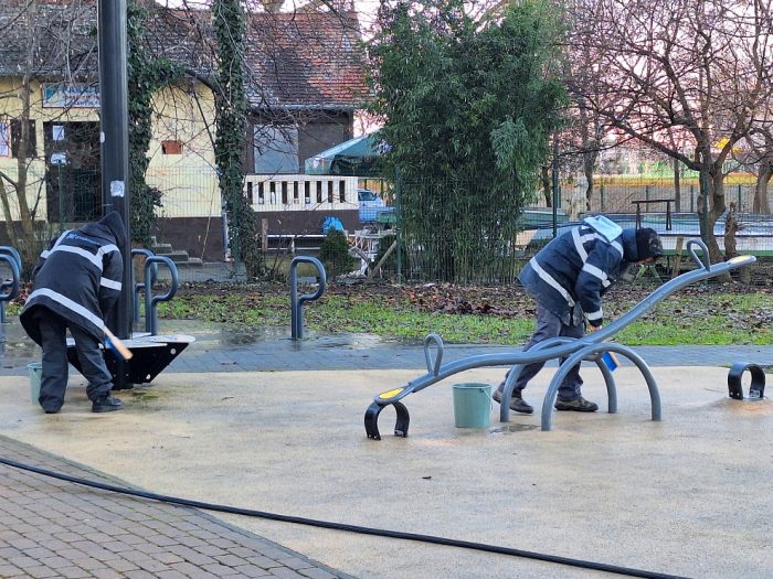 A püspökvár alatti játszótéren az eszközöket kézi erővel tisztították meg és fertőtlenítették. A takarítási munka folyamatosan zajlik, ahogy a vízállás engedi, a vízügyi igazgatóság előrejelzése szerint azonban hamarosan újabb árhullámra lehet számítani.