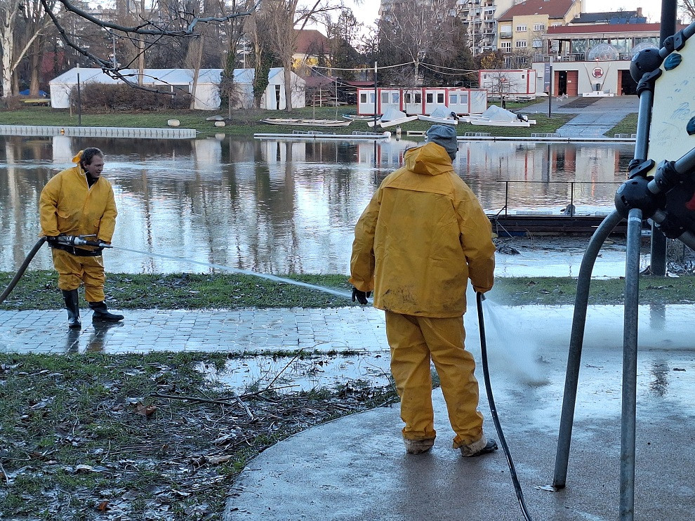 A parthoz közeli uszadékokat, hordalékokat kiszedték a vízből és elszállították. Ezekben a napokban zajlik a rakpartok tisztítása is azokon a szakaszokon, ahol a vízállás ezt lehetővé teszi. A rézsűkről nagynyomású vízsugárral távolítják el a lerakódott iszapot, és takarítják a parti sétálóutakat, járdákat, padokat, utcabútorokat is.